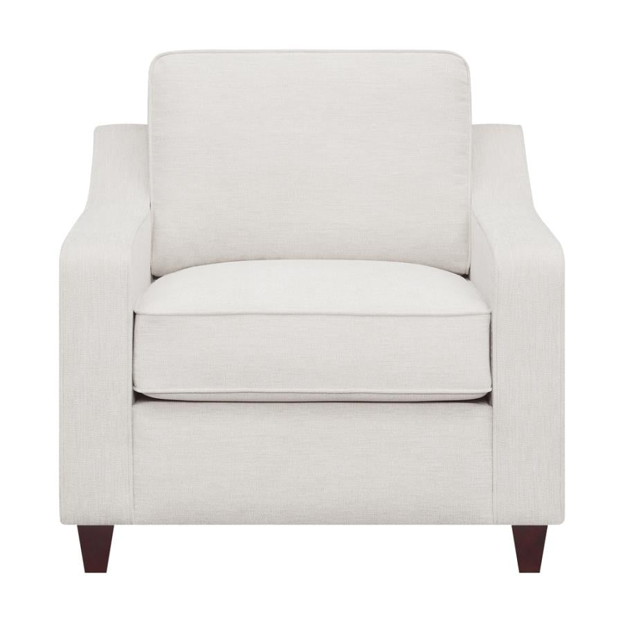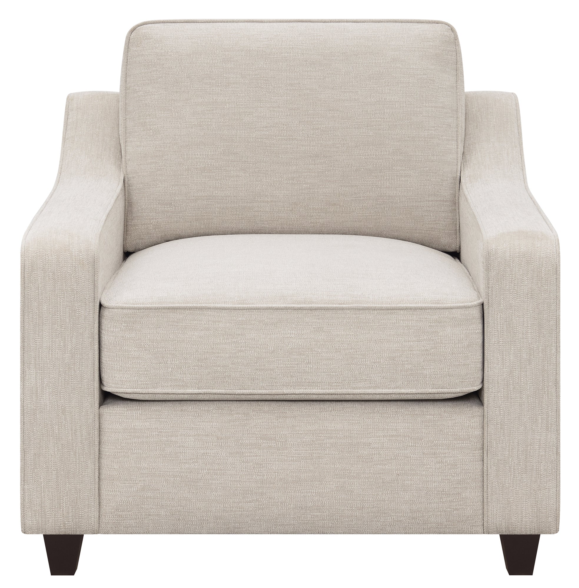 Upholstered in a bright beige woven chenille, this chair offers an understated, light and airy charm to any seating area. Sophisticated, sloped track arms and tapered dark brown legs lend a contrasting color palette, capable of blending with existing decor and color schemes. A boxed seat and back cushion lend a timeless design with classic welt details, creating small traditional touches. This contemporary chair is perfect for softening a corner in a transitional or farmhouse style home. In addition, it can be added alongside available matching furniture pieces, including a sofa and loveseat.