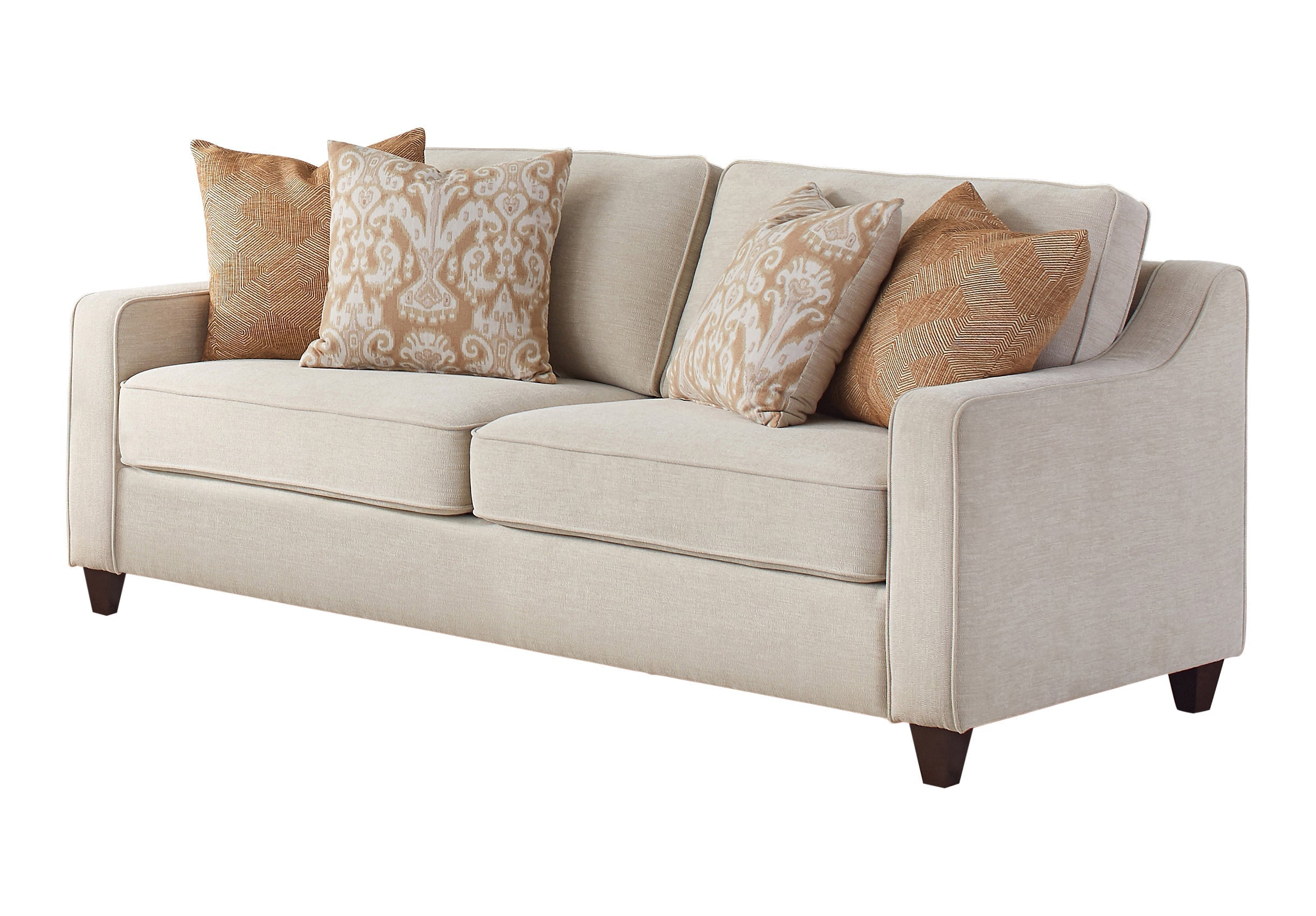 Wrapped in a light and bright, beige woven chenille upholstery, this sofa lends itself to your existing color palette effortlessly. Elegant, sloped track arms and tapered dark brown legs create an understated flair to a transitional style living room or contemporary home. Boxed seat and back cushions feature classic welt details, while coordinating accent pillows in a coral and copper tones and Ikat pattern add a boho coastal touch. Place this sofa in a space for a subtle chic look and contrasting colors. Add the available matching loveseat to complete an entire seating ensemble.