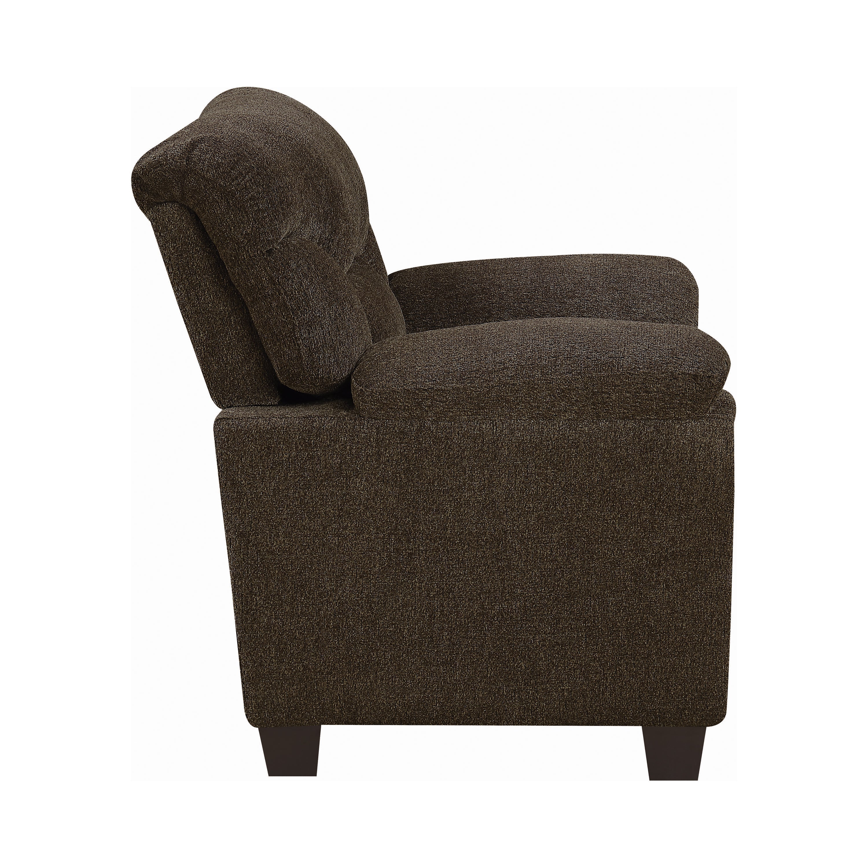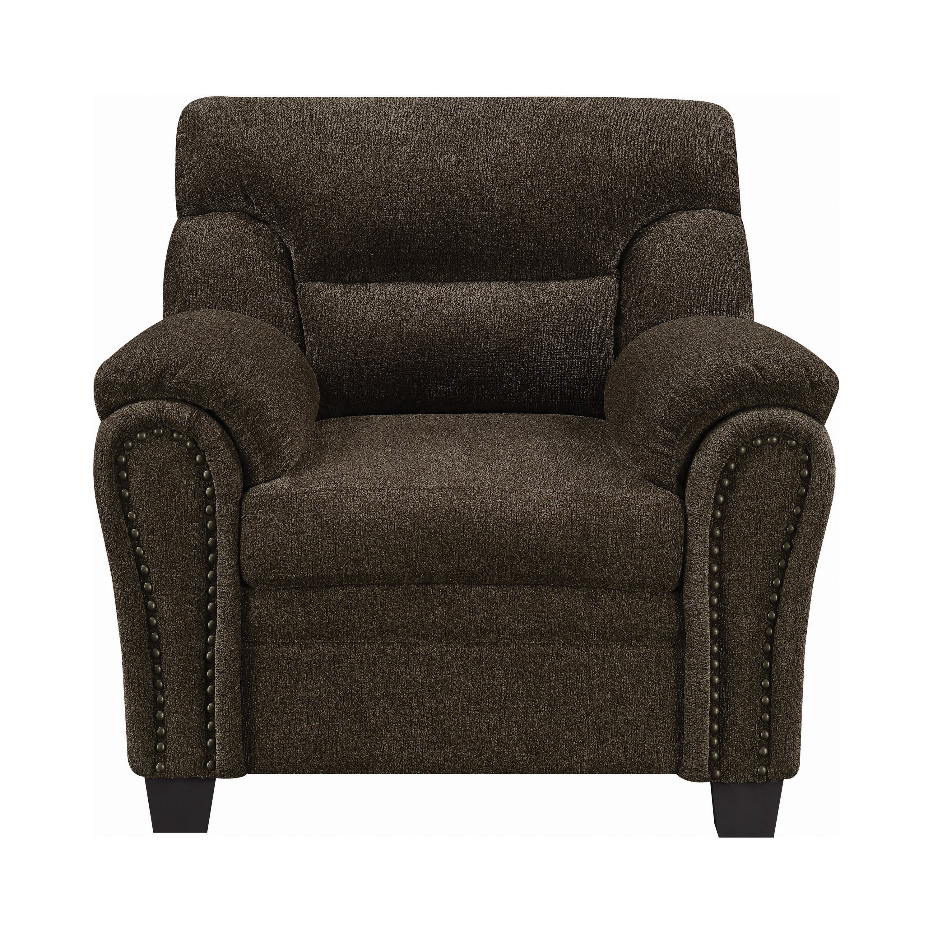 This elegant armchair creates a cozy and inviting aesthetic in any living space. Its fabric upholstery is exquisitely soft and is offered in a variety of attractive colors. With a comfortably padded seat and an ultra-plush headrest and arms, it's the perfect place to rest and relax after a long day. A cool, stitched design and trendy nailhead trim add a pleasing touch of style to its classic design. Sturdy, tapered legs complete its attractive look while adding plenty of stable support.