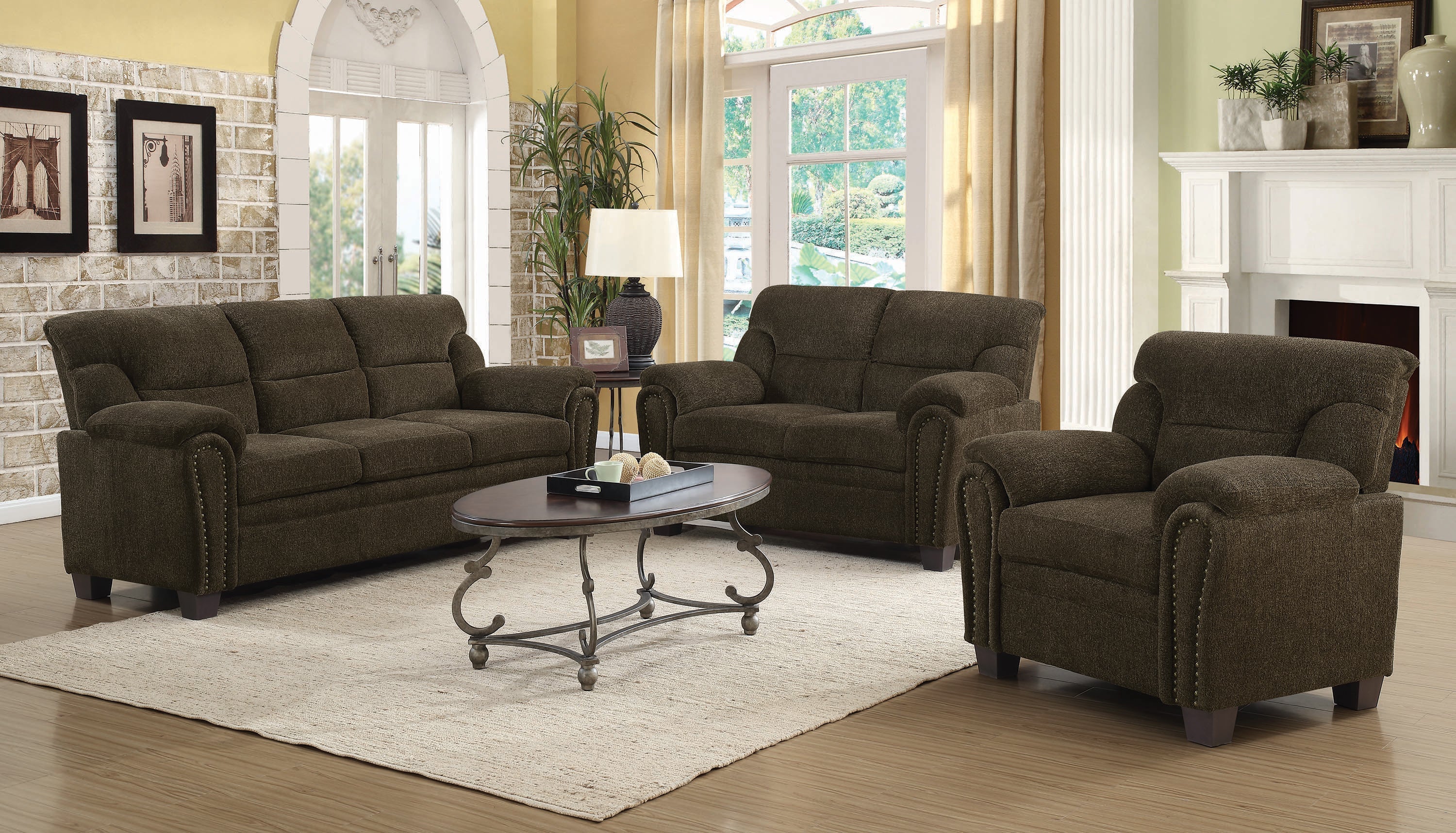 Decorative nailhead detailing and a plush multi-tonal chenille fabric