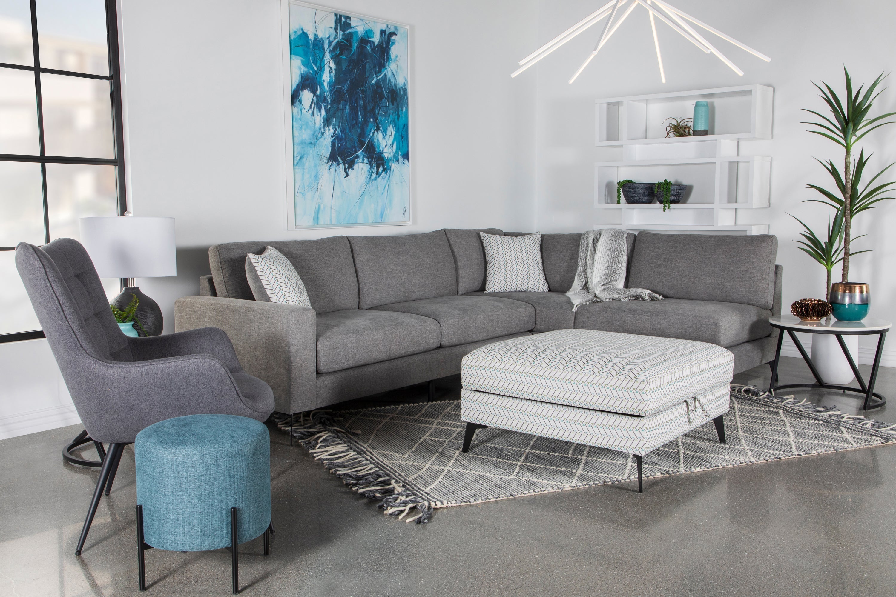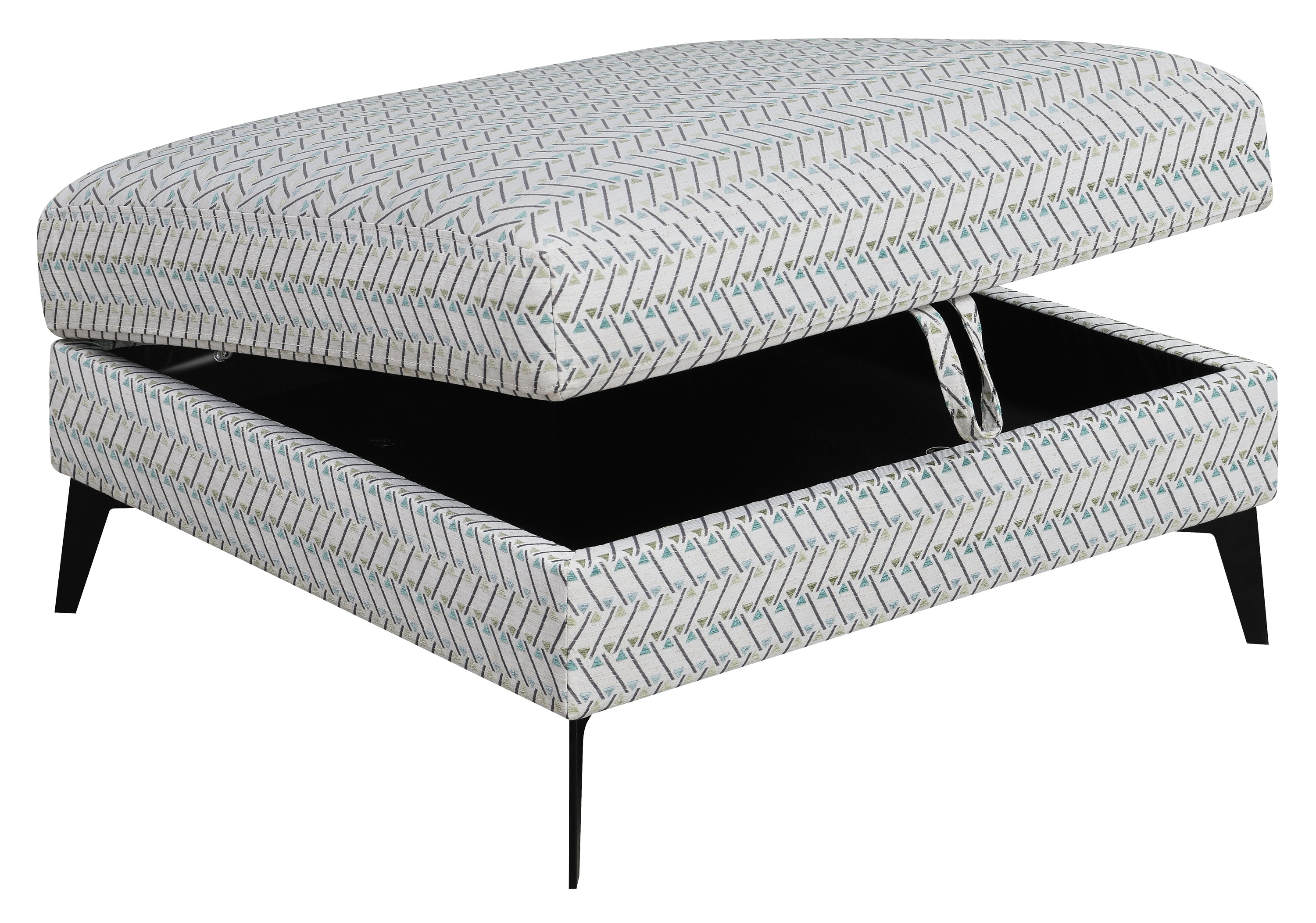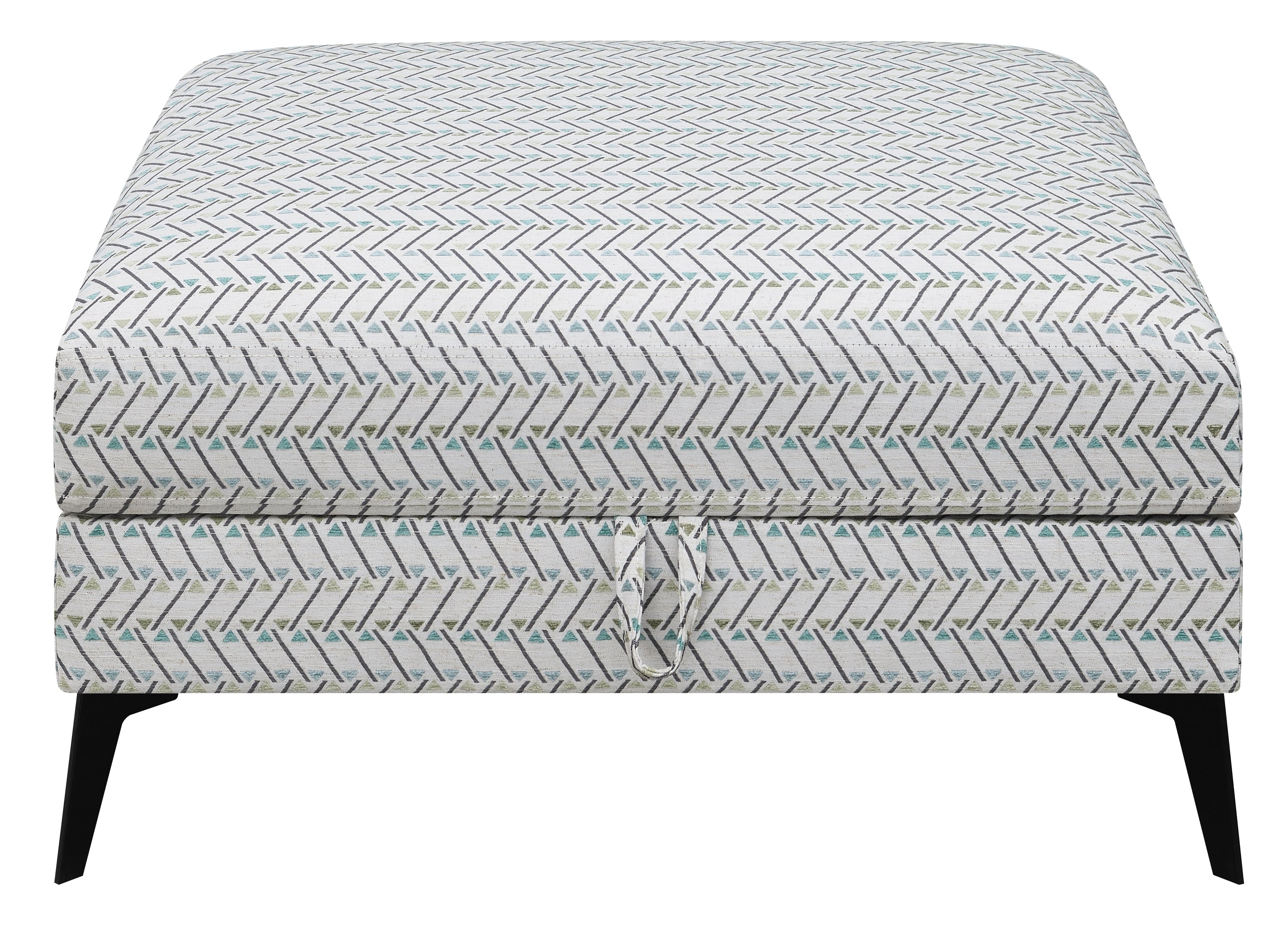 Function and fashion mix with a delightful result in this modern storage ottoman. Brighten a sofa set or sectional with a square ottoman adding plenty of surface and storage space. Covered in fabric with a compelling geometric design, its gray-centered palette blends with a mix of pieces in a living room or bedroom. A fully enchased engineered wood frame with stylish black metal legs and a black lined interior adds a tasteful angle, while a looped handle easily lifts its upholstered top. Use this storage ottoman as a footrest or for extra seating.