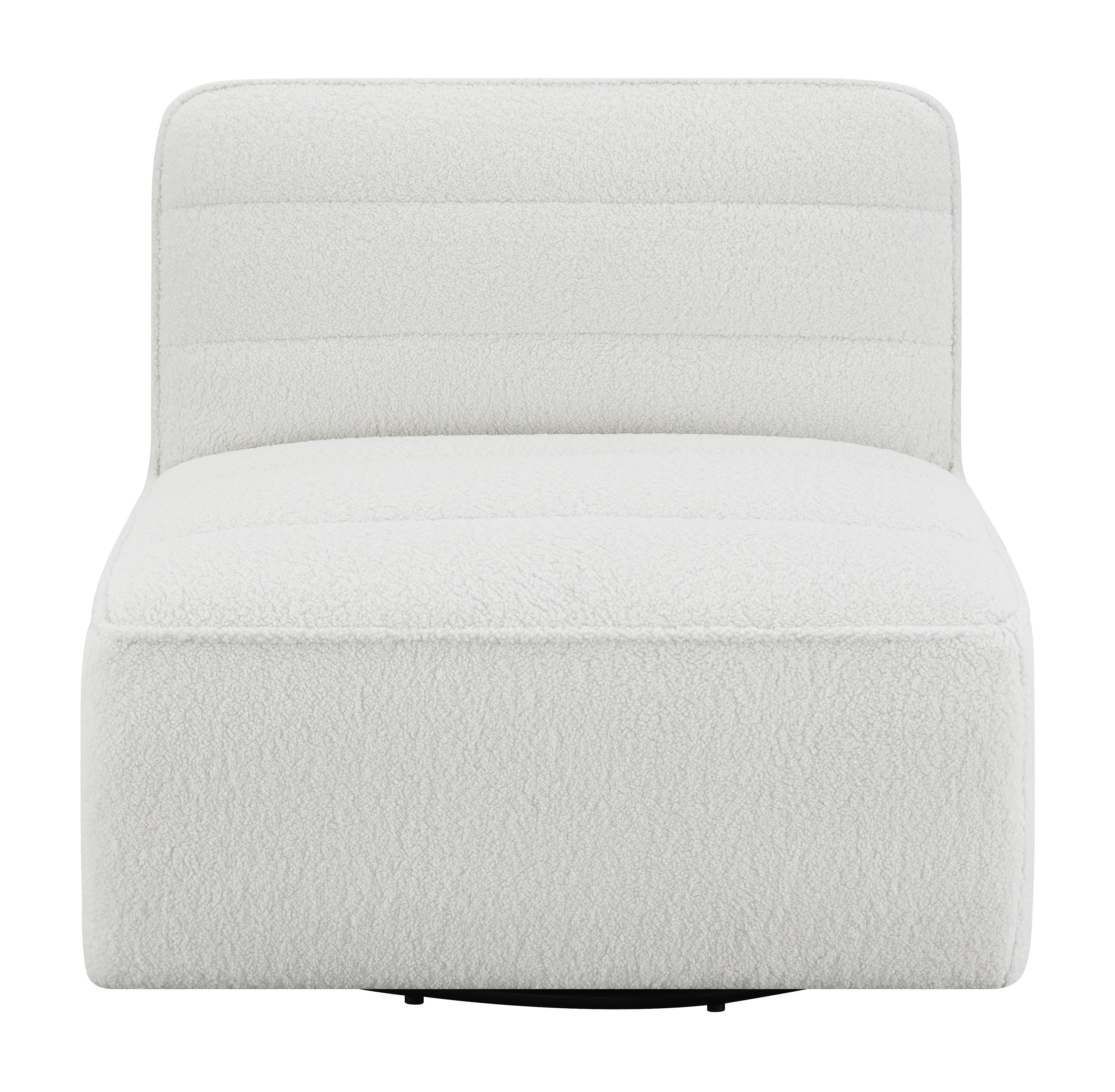 The restful low-profile design of this contemporary accent chair creates an inviting place to relax. Built with a 360-degree swivel base mechanism, this playful accent chair offers a boxy style and a flush base that sinks into a space effortlessly. Wrapped entirely in a plush faux sheepskin upholstery, this accent chair offers a supremely cozy spot to unwind with a book or chat with family and guests. Horizontal channeling and welt trim offer classical, yet retro-inspired elements. Place this swivel accent chair in an open seating area and versatile open concept floor plan.