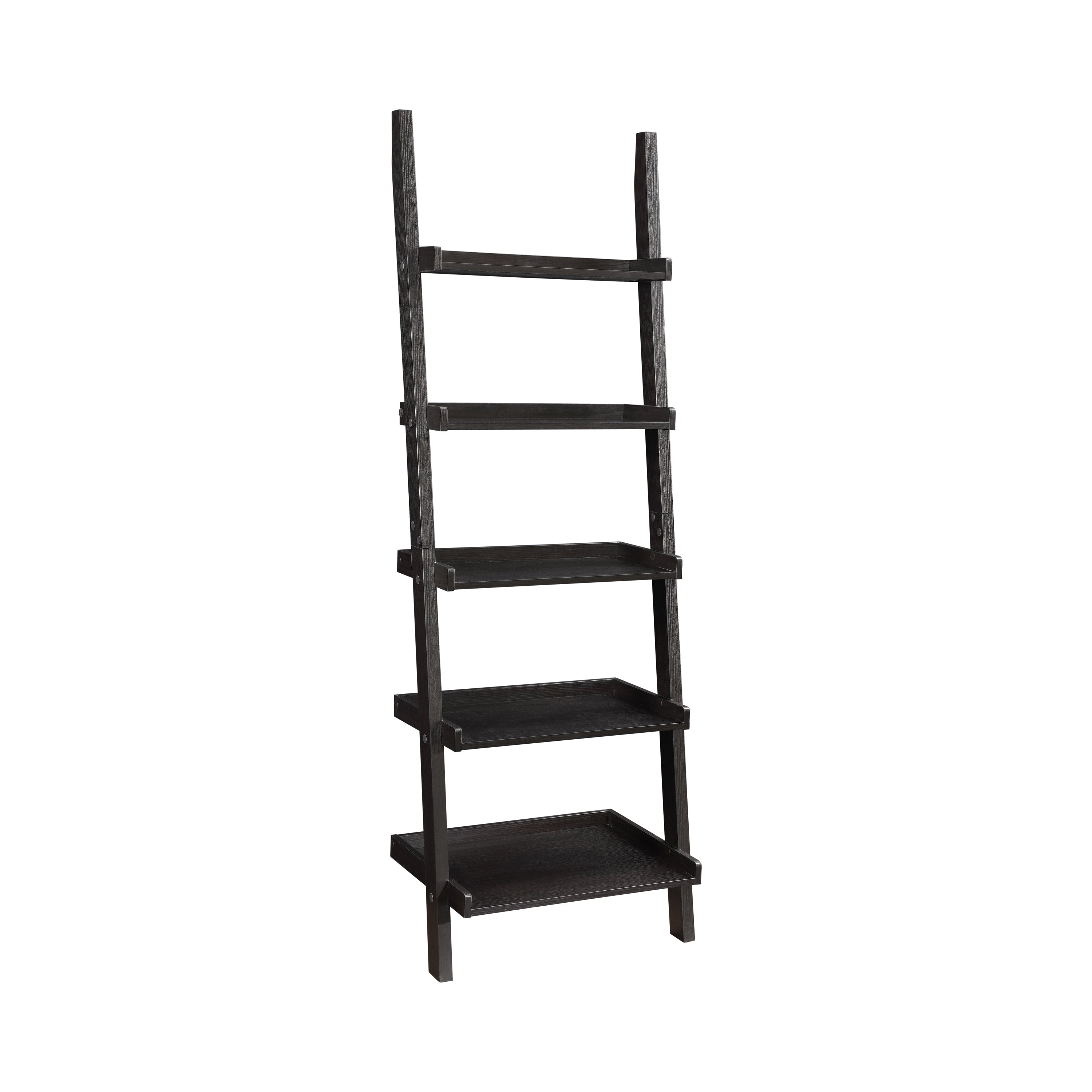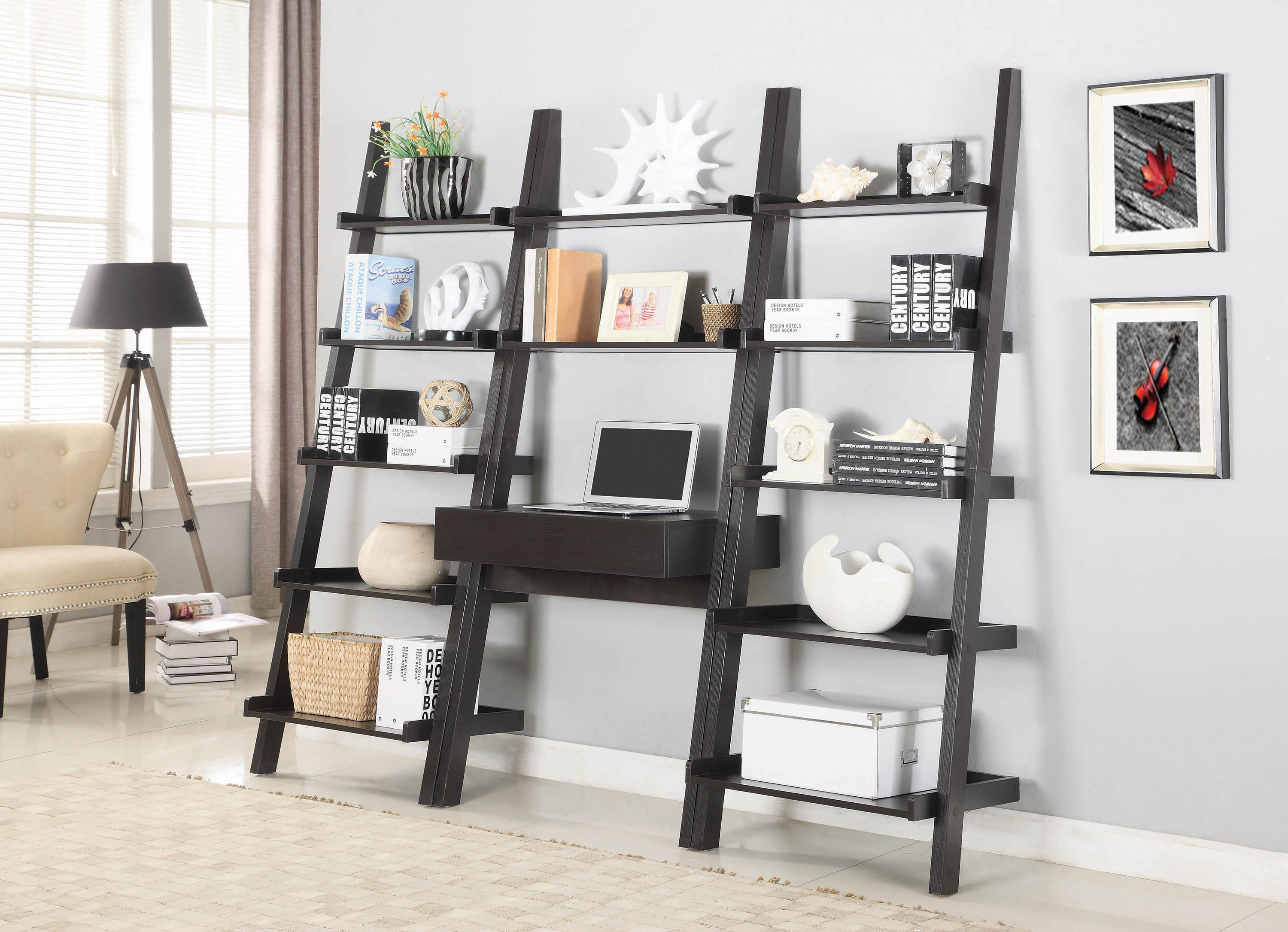 This ladder desk offers a unique, innovative design that's a twist on the workspace experience. It features a single drawer with Euro glides and two shelves that give this wall-leaning desk an air of practicality. It's constructed with MDF, particle board, and engineered veneer that's sturdy enough for years of everyday use. The desk is finished in a rich cappuccino that's an excellent accoutrement to any office decor. Modular set-up can be modified to suit any desired combination.
