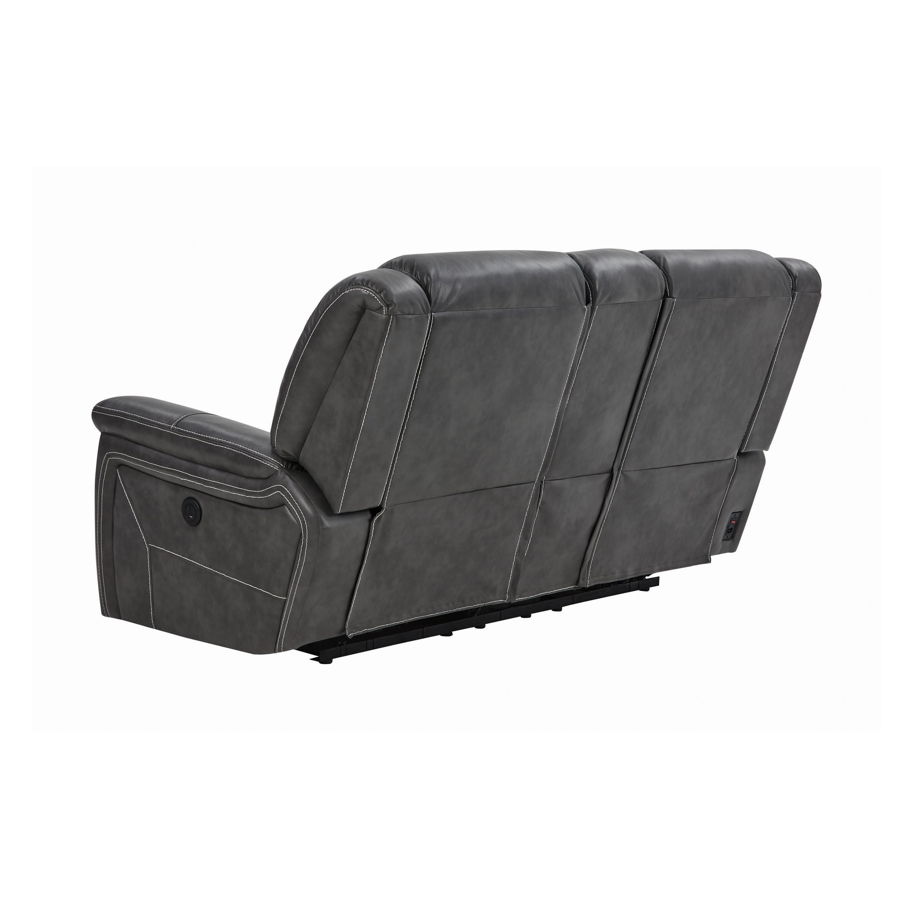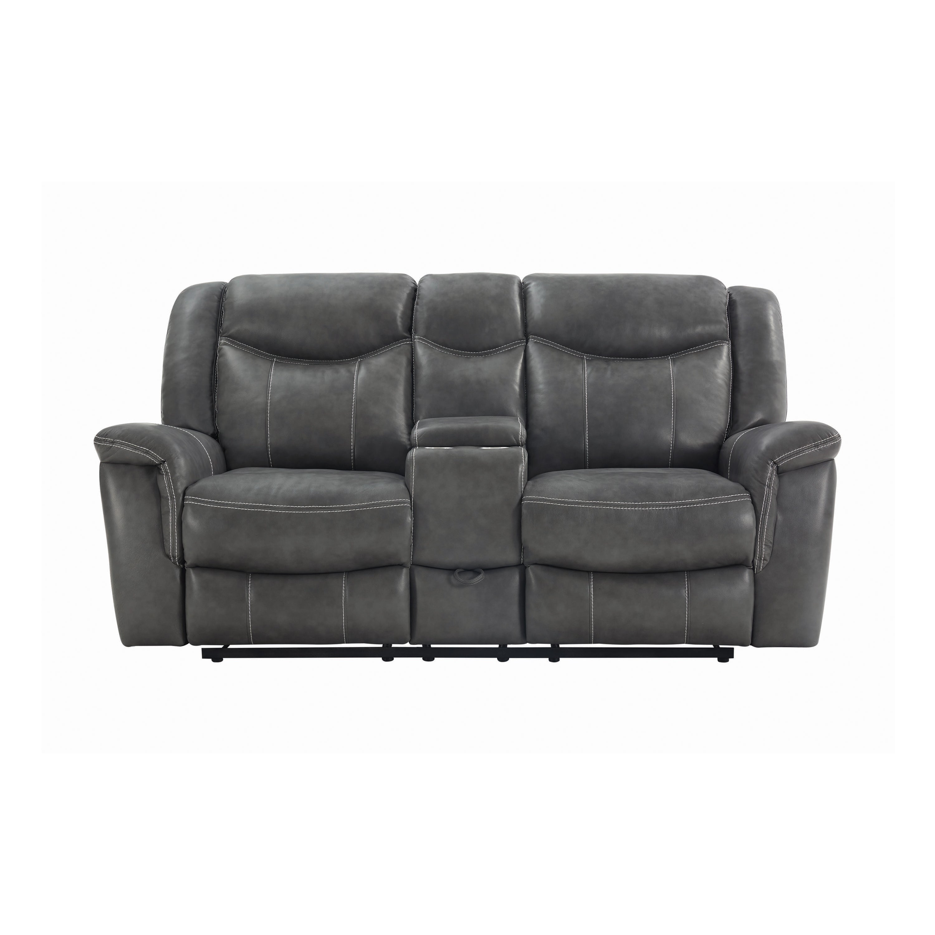 Grey is no longer drab and dreary and this decadent motion loveseat is proof. The angled seat backs feature extra padded headrests for optimal comfort. Padded armrests and recliner leg rest offer extra indulgence. Center console includes amenities like two cup holders and storage space. This loveseat comes wrapped in cool grey leather-like upholstery for a modern appeal.