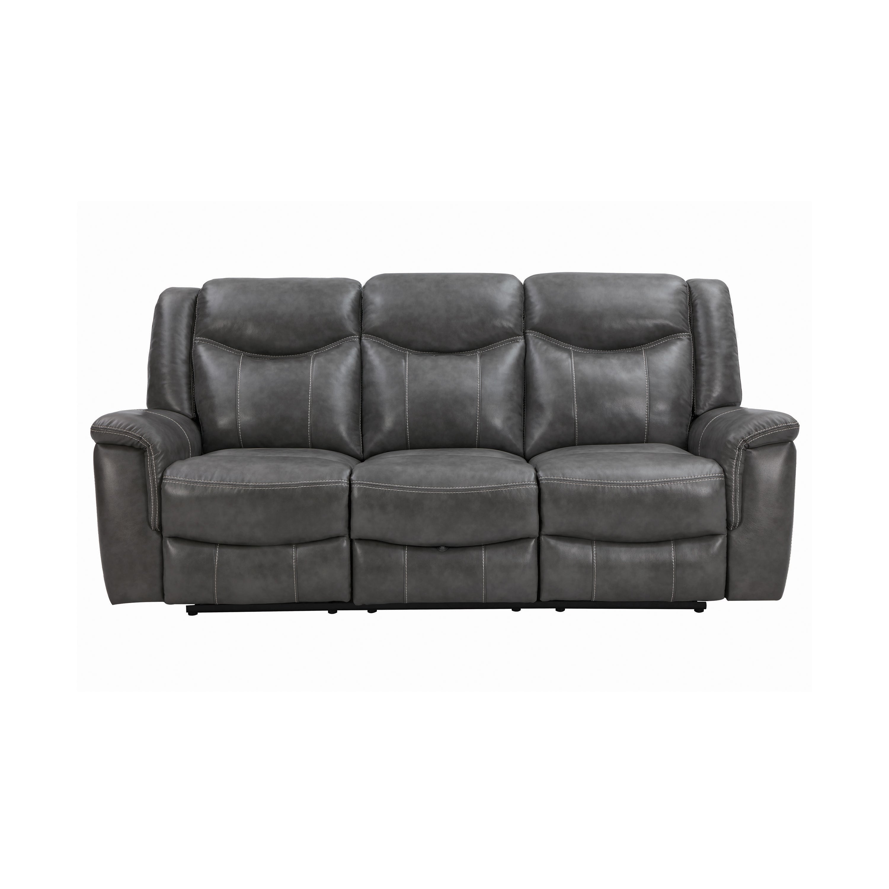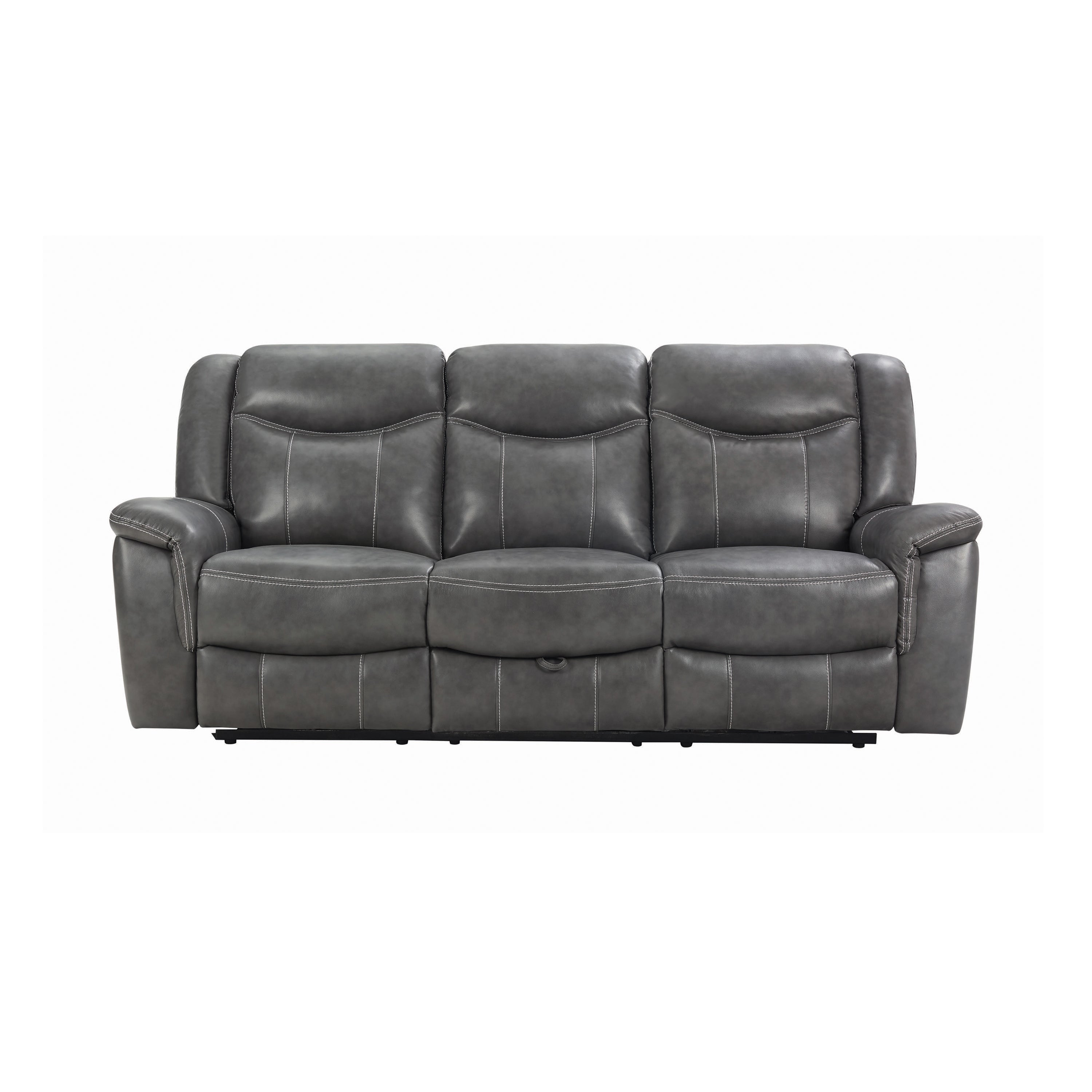 Grey is the trendy color these days and it doesn't look any better than on this opulent motion sofa. It features angled seat backs with extra padded headrests for ultimate luxury. Armrests and even the leg rest on the recliner are padded for extra comfort. Wrapped in the coolest of cool grey leather-like upholstery for a look that's uber-fashionable. This sofa will definitely steal the show in any living room or home rec room.