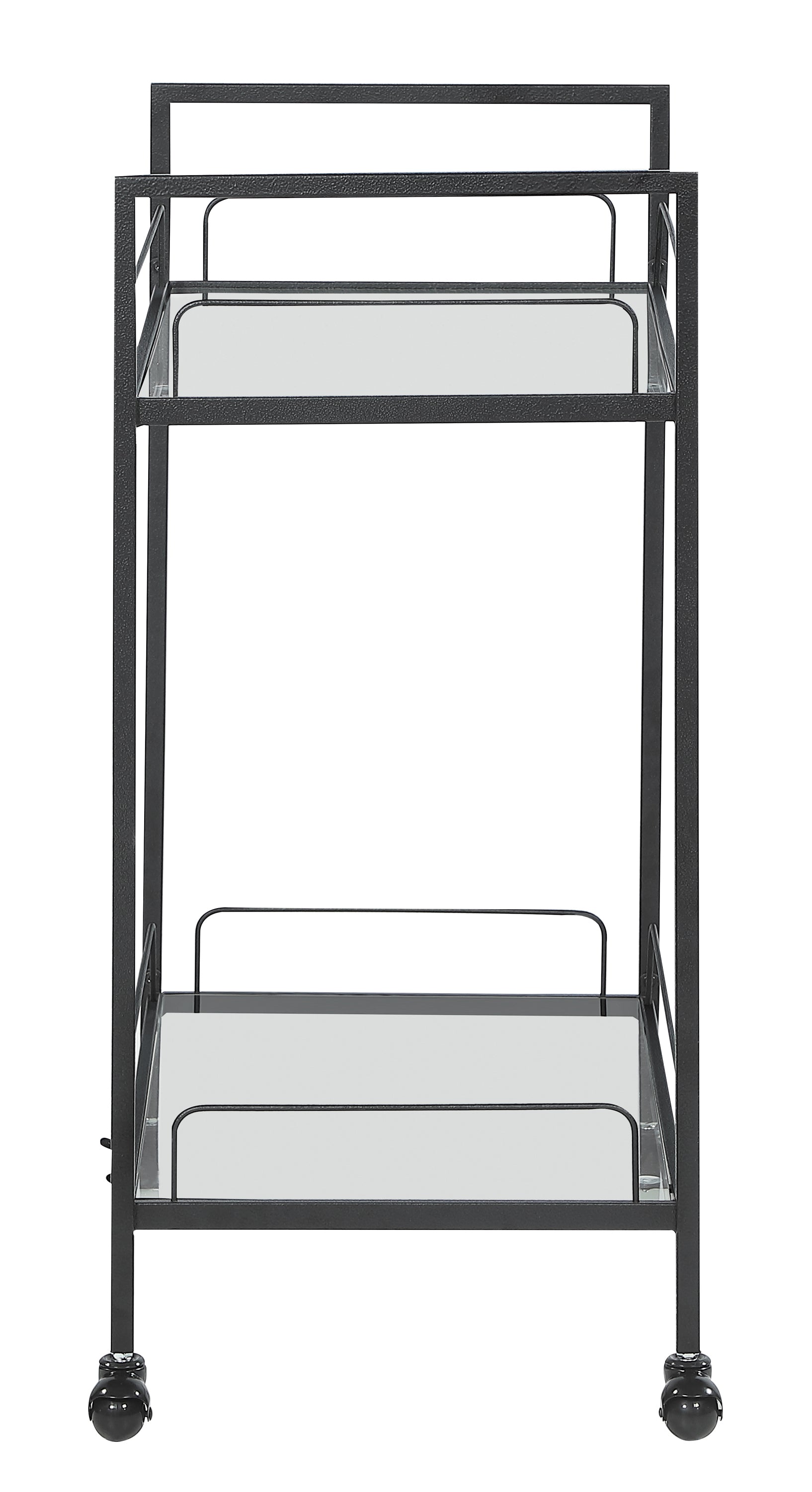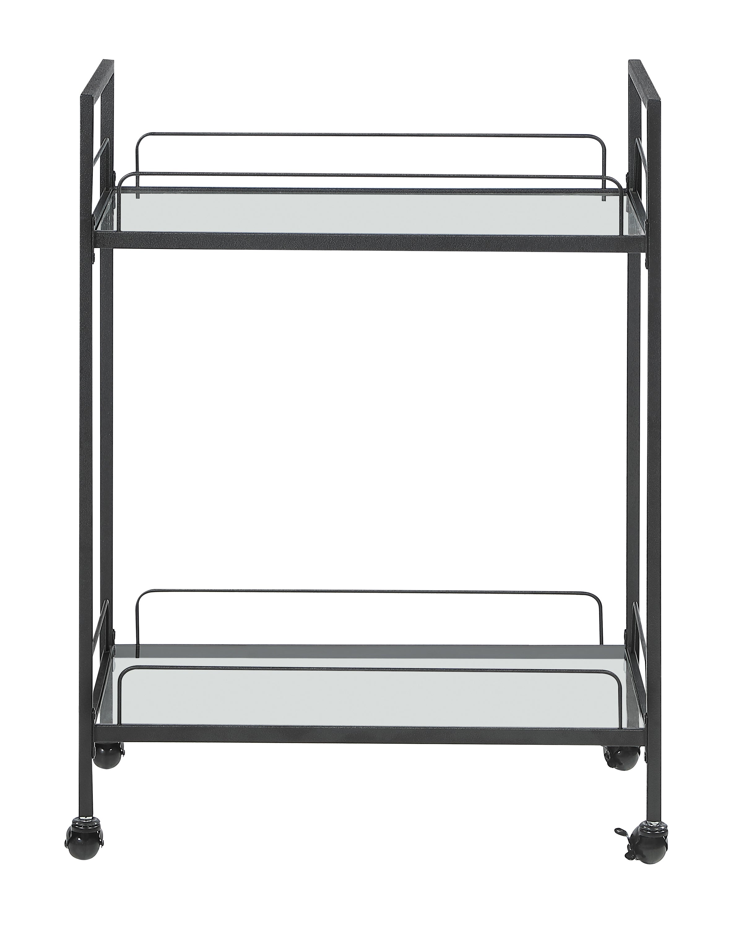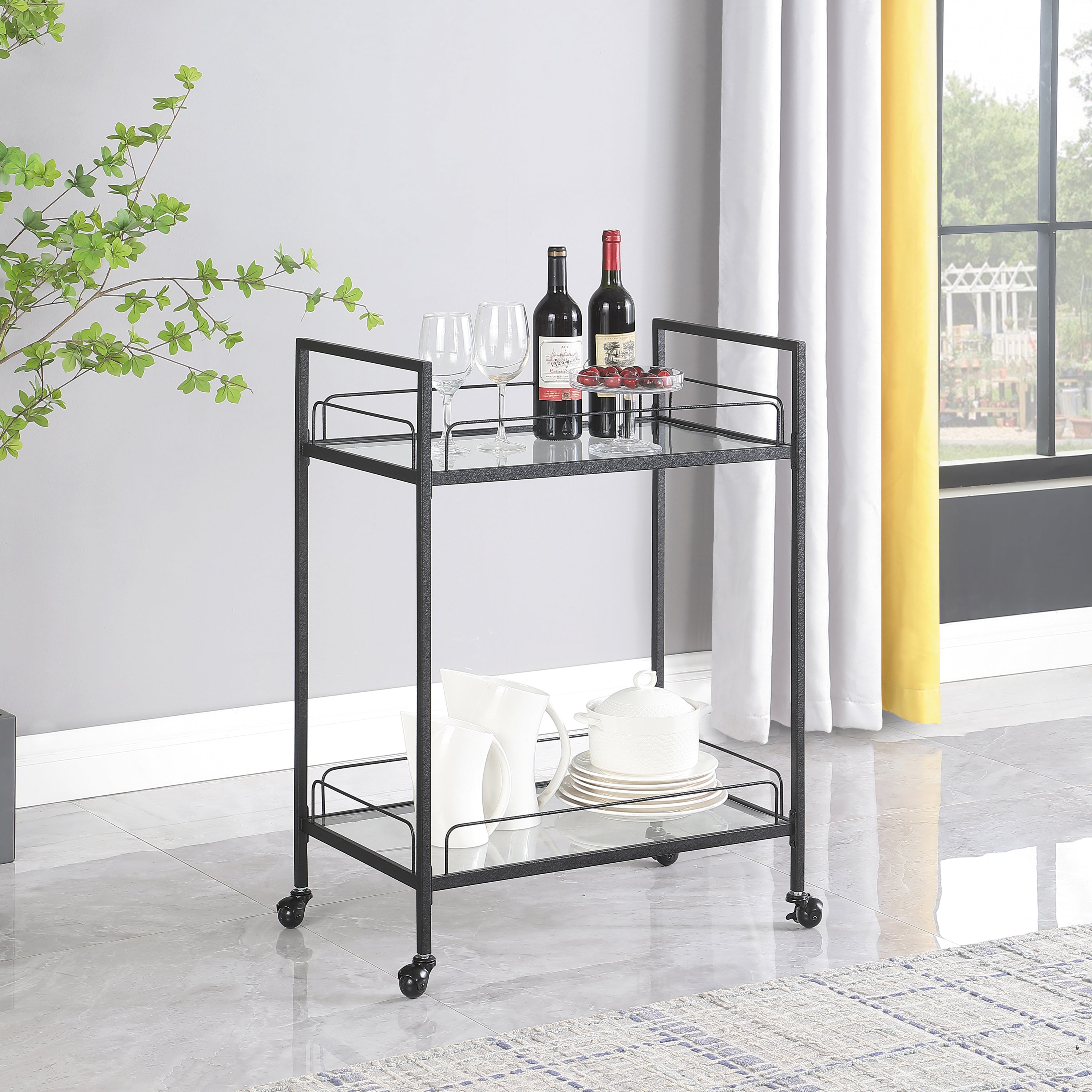 Minimal, clean lines create a versatile and sleek aesthetic to this contemporary serving cart. Built with a slim metal frame in a black hammertone powder coated finish with caster wheels, this serving cart welcomes glassware, accessories and snacks to be smoothly transported to an entertaining area for guests and visitors. Stacked clear tempered glass shelves showcase stemware and favorite vintages to guests for their personal selection. With raised edges, you can rest easy knowing everything stays in place safely. Glide this serving cart into your living room for small get-togethers or keep it in a compact apartment as a multifunctional bar cart.