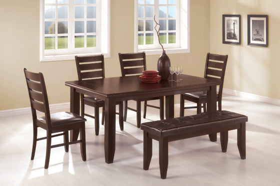 Study bench is a unique distinction of the Dalila Collection. Fashioned from hardwoods and oak veneers. Stout legs are finished in cappuccino and will stand up to daily (over)use. A casual companion of the dining table from the same collection, this bench will become a favorite. Padded seat for comfort and built for any combination: three children or two adults - even a cat, dog, and child.