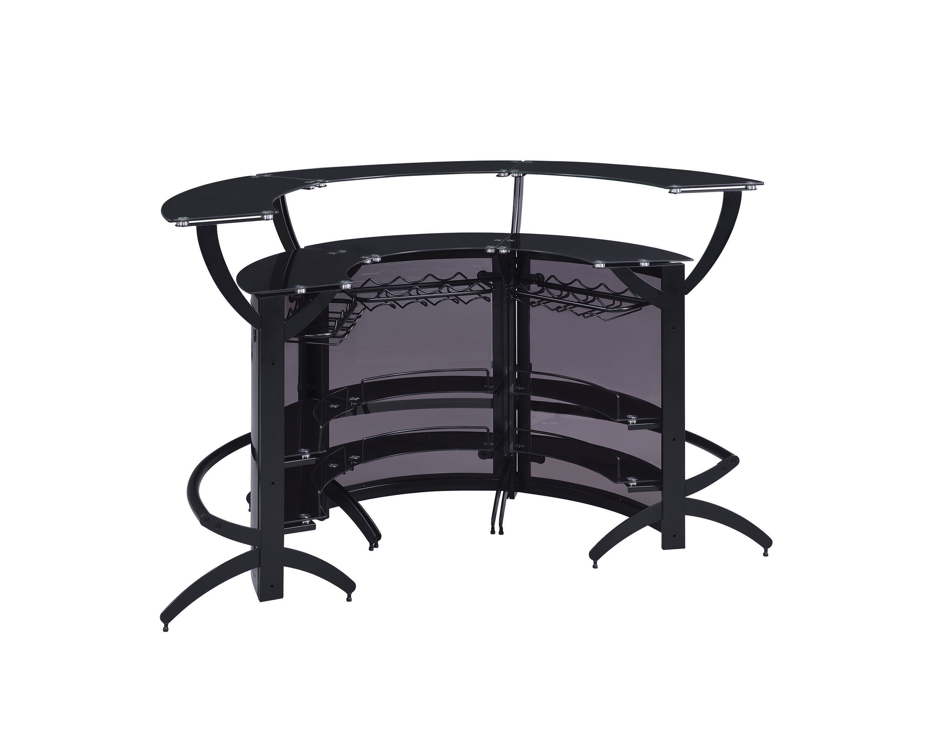 Heavy on the modern elegance scale, the design of this elegant bar unit turns heads as it provides comprehensive serving and entertaining functions. Enjoy a lovely smoked acrylic with black tempered glass and black metal frame, combining to offer a sophisticated ambiance. With two-tier black tempered glass tops and two identical shelves, storage and service are easy. A stemware rack and wine rack holding three bottles creates a perfect setup for intimate gatherings. Entertain in a modern space with the confidence and utility of this exceptional bar unit.
