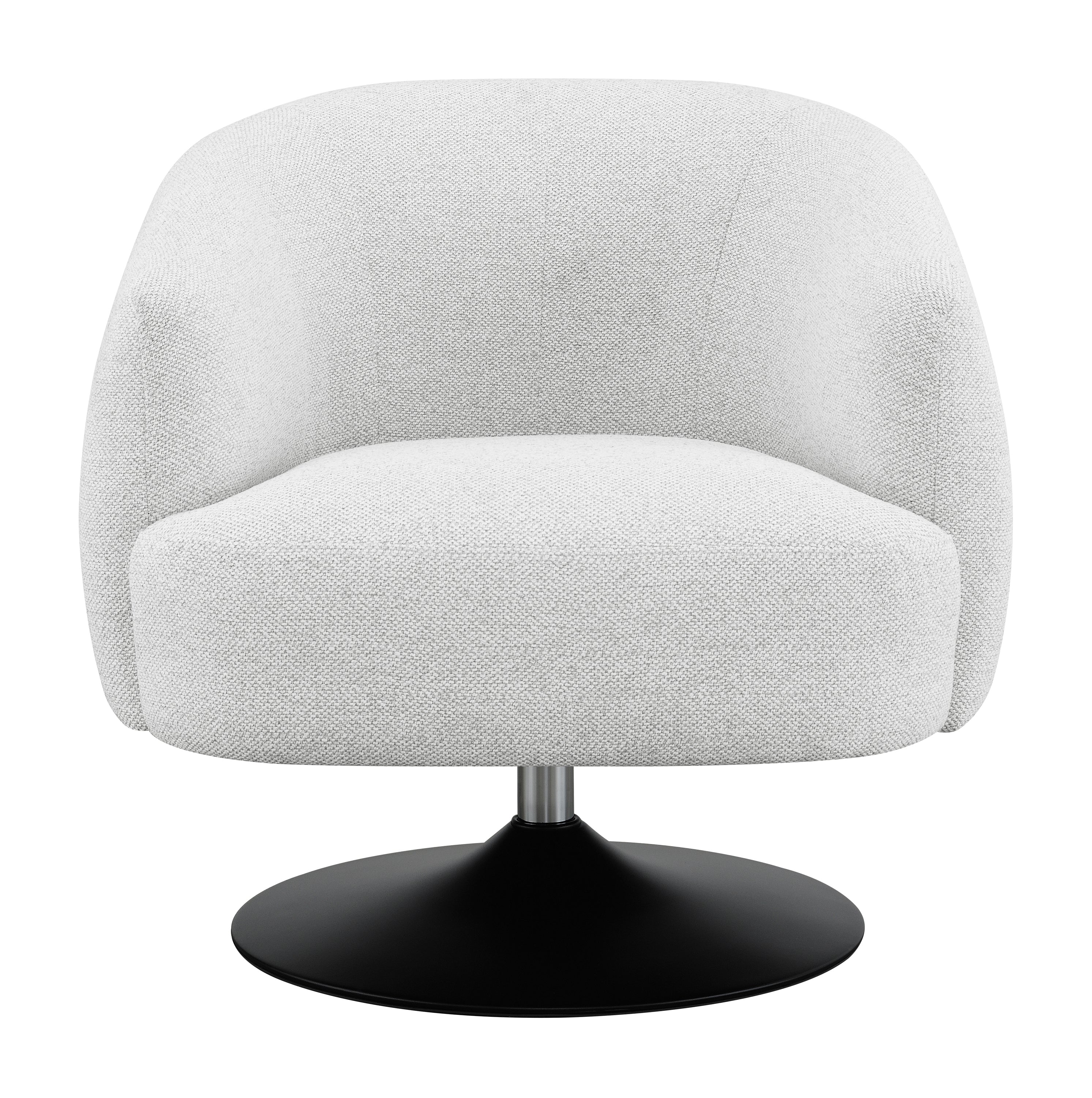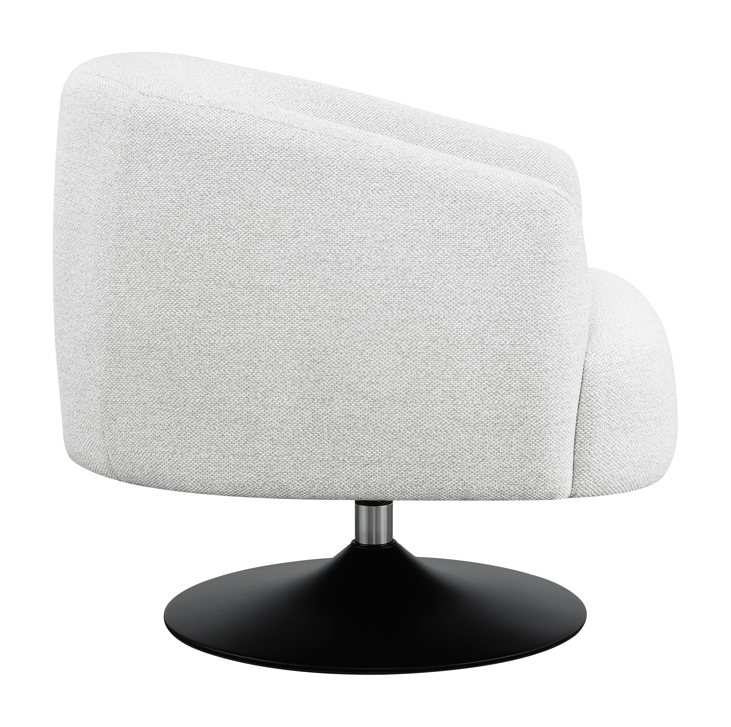 Wrapped in a beige boucle fabric, this contemporary swivel accent chair is the perfect addition to a vintage-inspired home. A throwback to a retro era, the chair offers a barrel style design situated on a pedestal base, swiveling 360 degrees. A wonderful addition to a conversational seating arrangement or open floor plan entertainment space, this chic swivel chair also offers a softly rounded back with subtle channel tufting and tapered off armrests. A waterfall-style, tailored seat cushion further lends to the clean lines of this clever, versatile accent chair. The matte black finish on the base also adds a striking contrast for a modern touch.