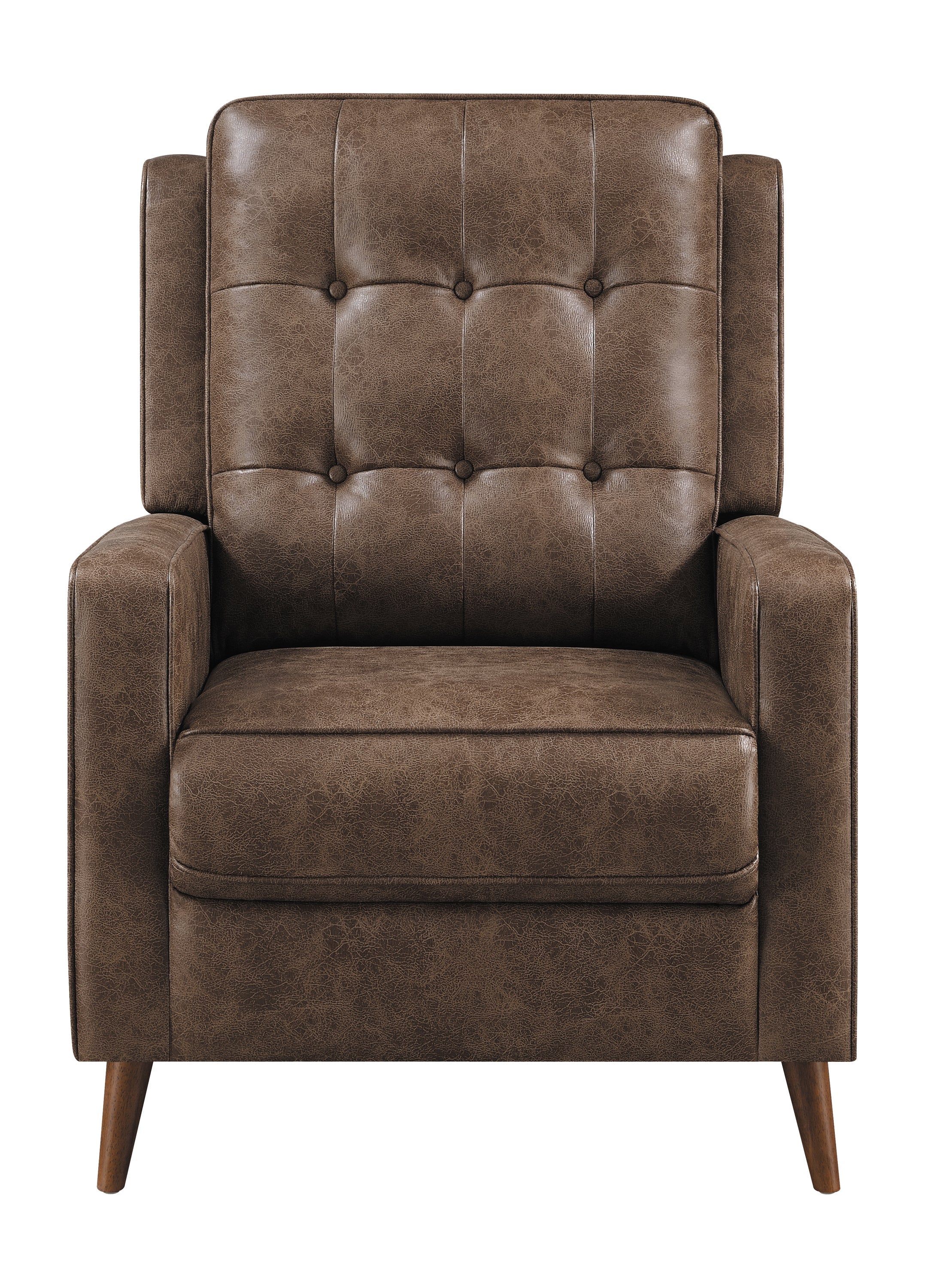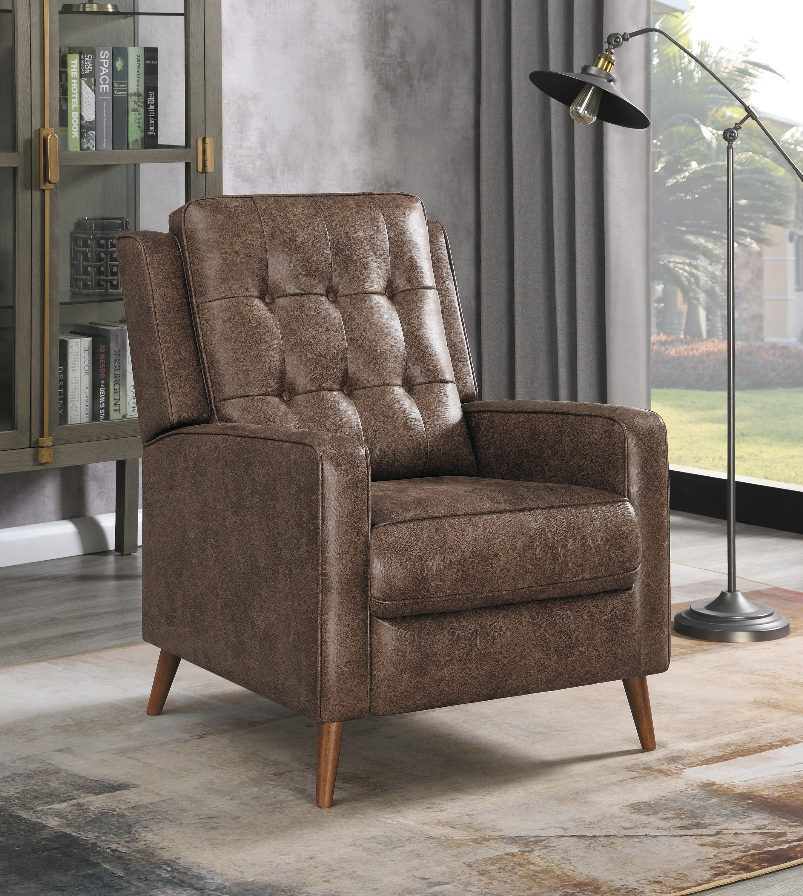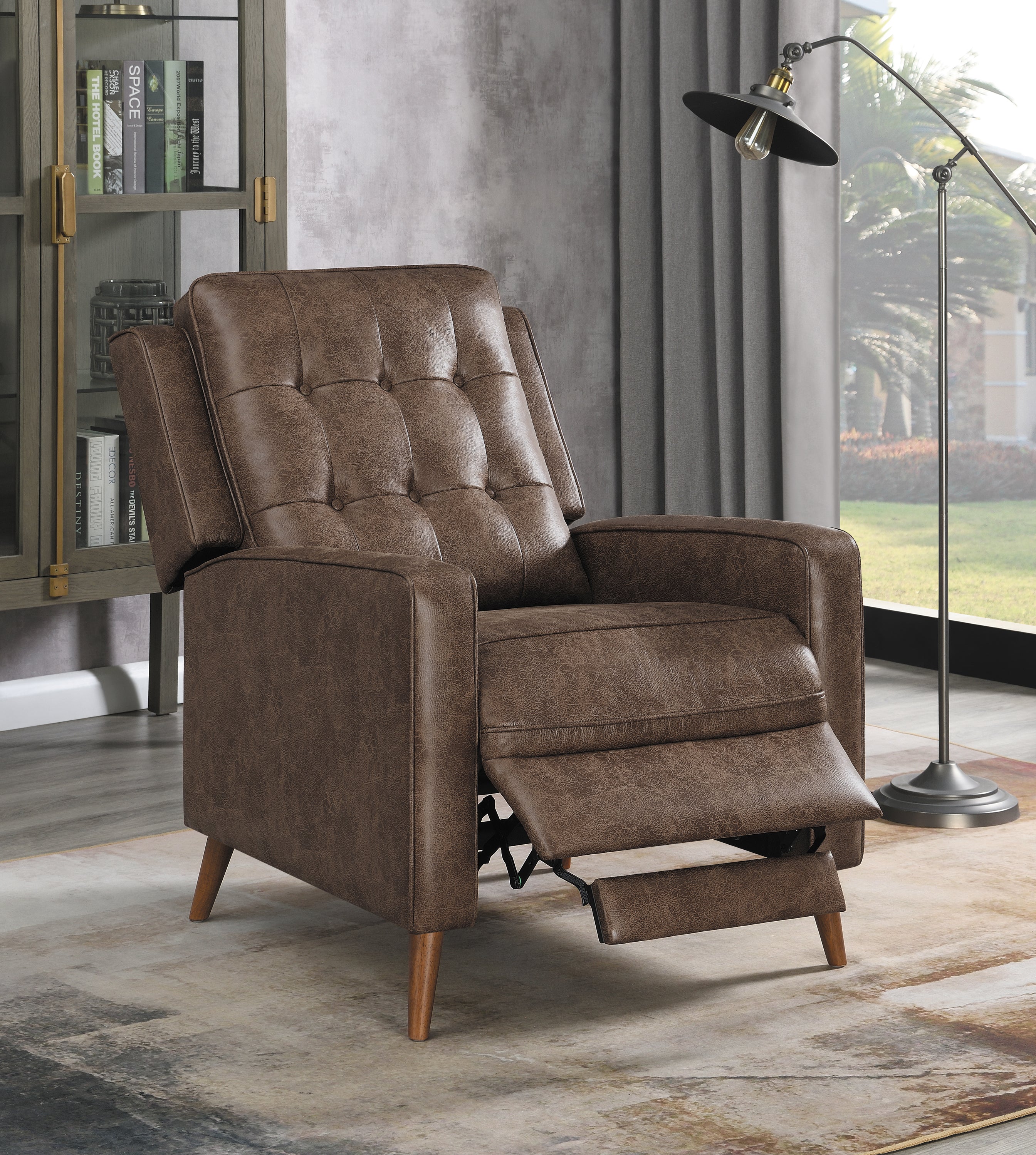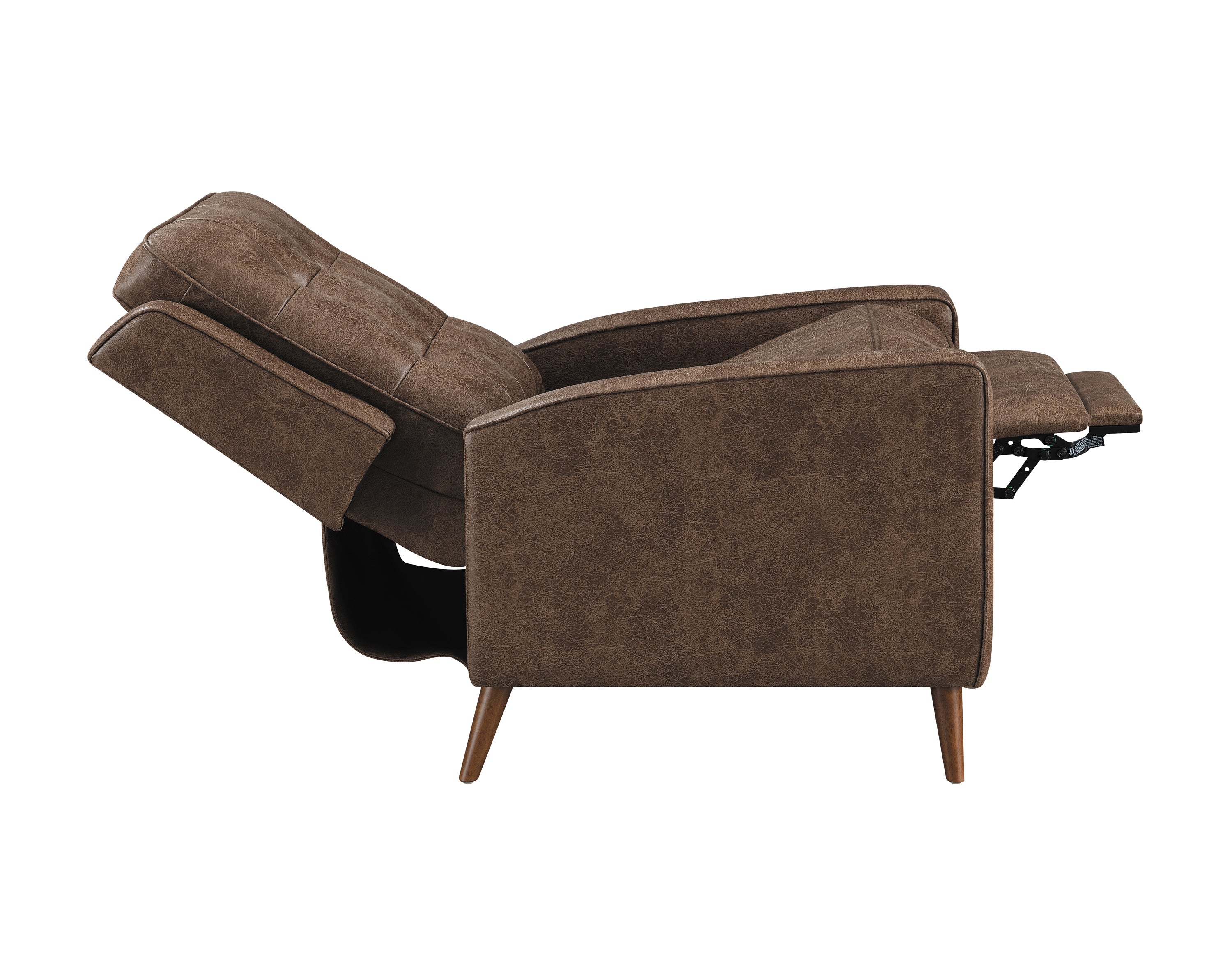 Covered in a brown Performance microfiber that gives a leather-like appearance, this mid-century modern recliner boasts style and functionality. Designed as a manual push back recliner, it blends into a seating arrangement discreetly and with grace. A tall angled backrest with button tufting offers a classical look and invites one to kick back and relax. Tailored, narrow armrests cradle you and lend a Tuxedo-style flair. Situated on flared and tapered legs in a brown finish, this chair gives a space retro-inspired vibes and modern sensibilities for total relaxation.