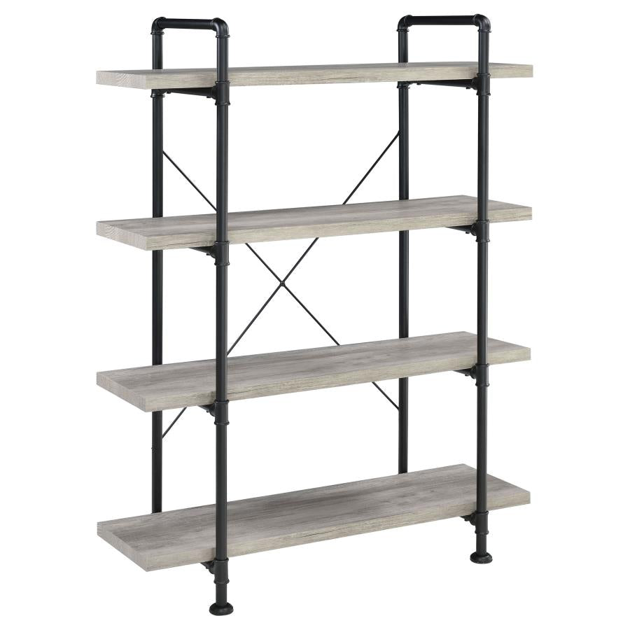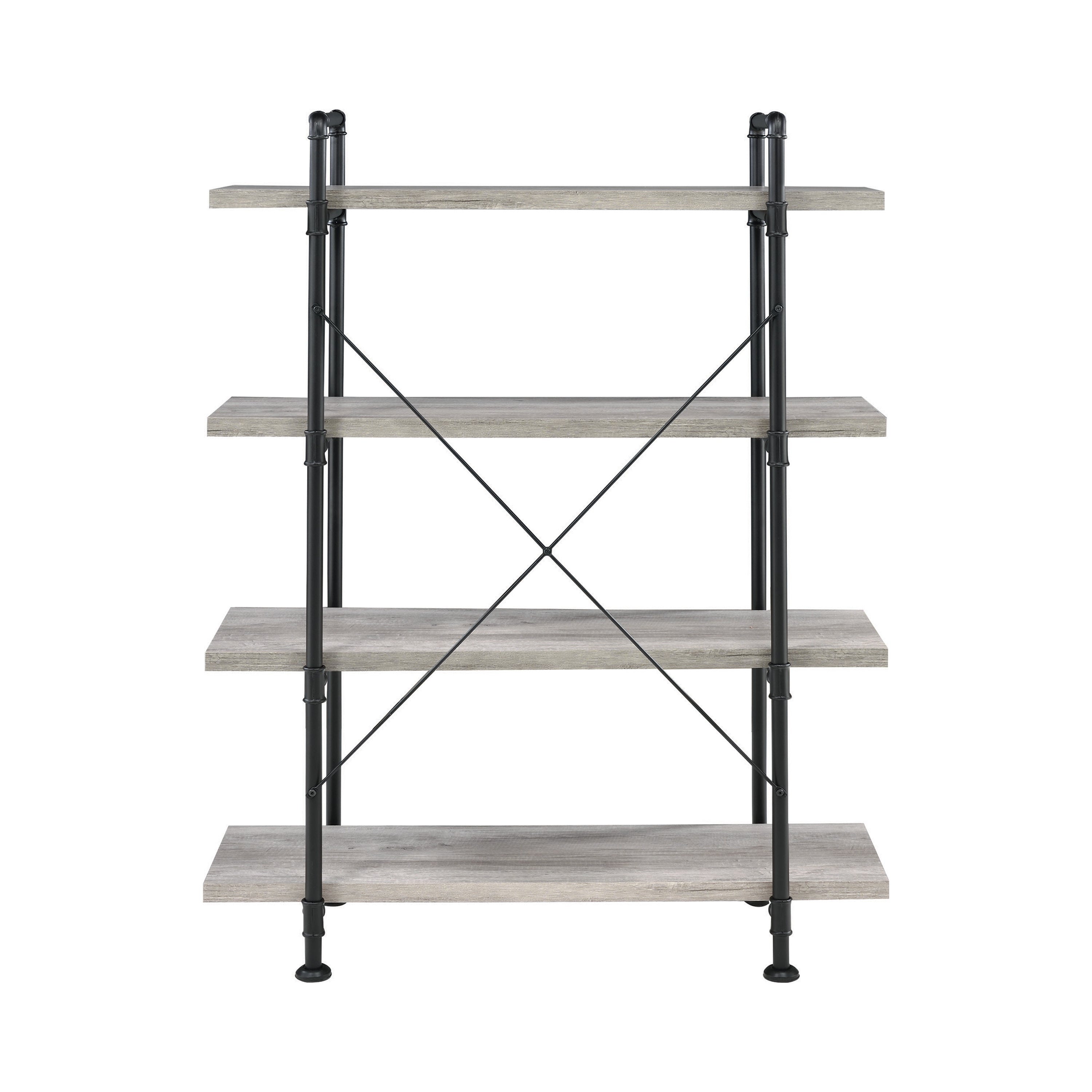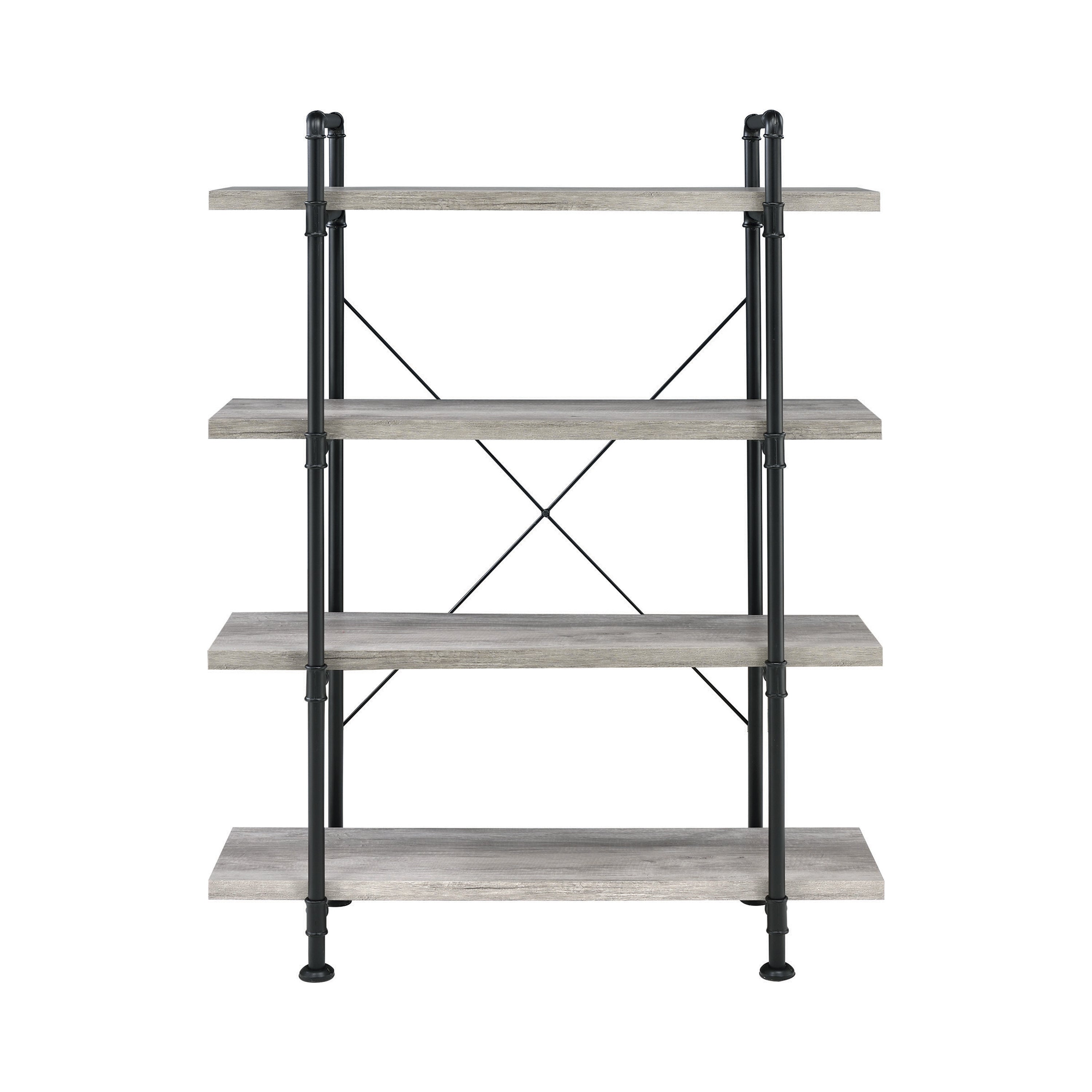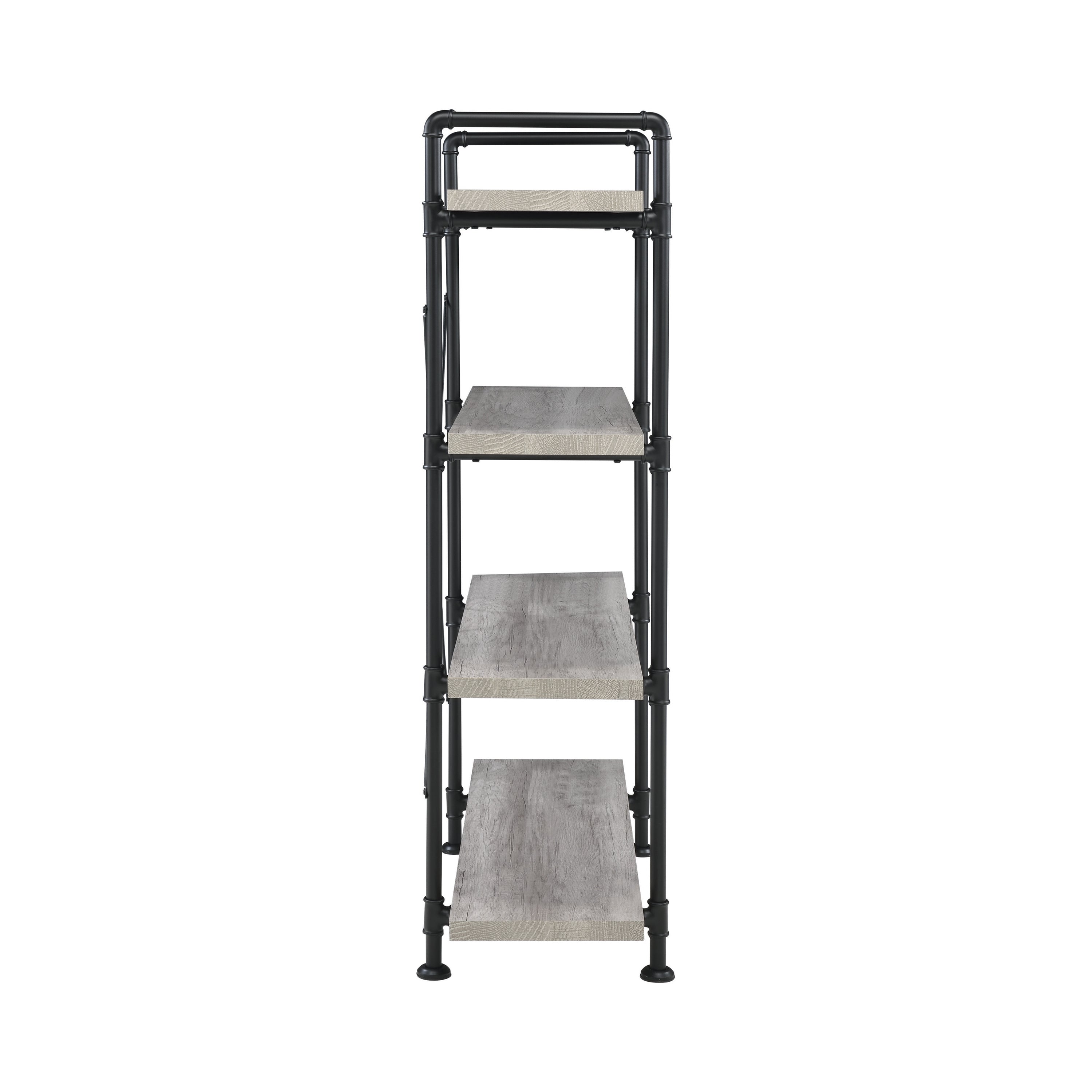 New heights of mastery are on display in this industrial bookcase from the Delray collection. The black plumbing pipe frame commands respect, paying homage to industrial design. The combination of the black frame and grey driftwood finish awakens a beach chic vibe. Four (4) tiers of open shelving lets you use this piece for storage or display. Maximize your industrial space with the matching writing desk from the same collection.