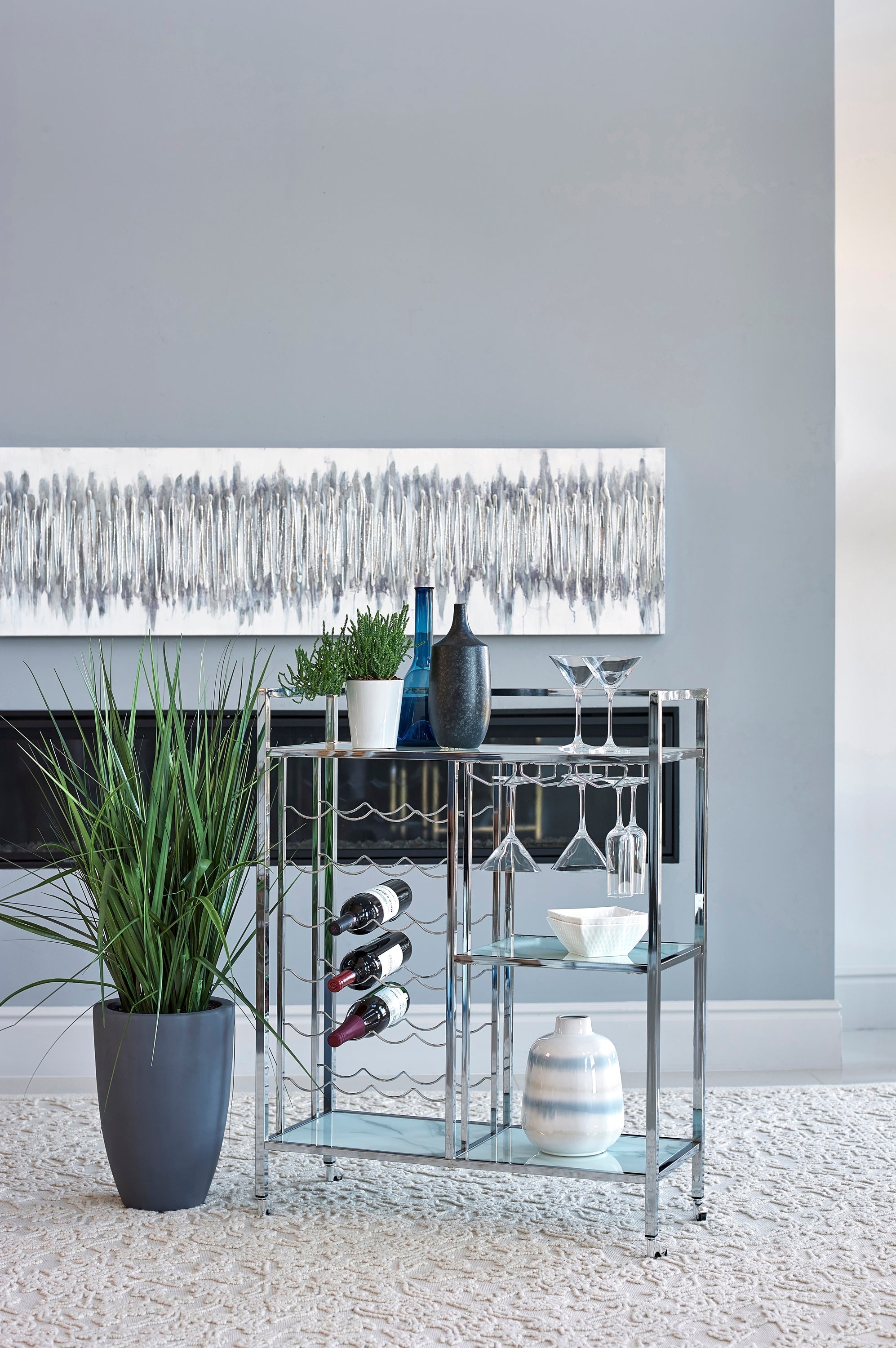 Grace your space with the endless elegance this metal serving cart has to offer. With a stemware rack and space for 24 wine bottles, it's the perfect addition to a wine lover's home. Sleek metal lines in a gleaming chrome finish give it a polished look that exudes sophistication. Three tempered glass shelves with opulent marble patterns add to the stylish design. This contemporary bar cart is complete with attached casters to roll refreshments smoothly from guest to guest.
