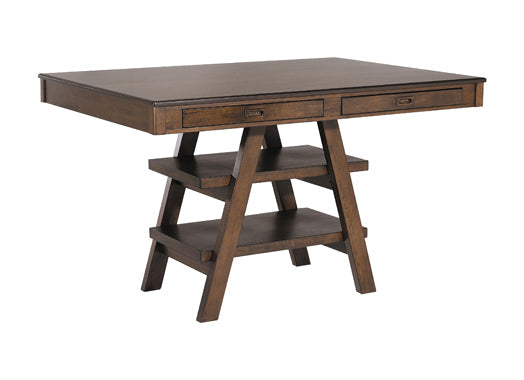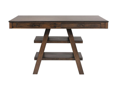 Entertain at this transitional counter height dining table, featuring ample seating space for up to six guests or family members. A rich walnut finish offers a neutral color palette and bold look to this furniture piece. With a raised counter height top, this table offers plenty of storage space below for all your dining essentials, from bowls to plates to serving pieces. Tucked inside the tabletop are two drawers for keeping linens and silverware. Use the A-frame pedestal base shelves for decor, cookbooks and more to create a custom look.