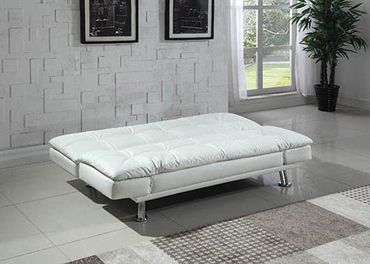 The Dilleston collection features this white sofa bed with dashing appeal. With deluxe pillow-top seating and adjustable armrests, sofa is convenient for relaxing on a rainy night or having one of those early morning conversations. White leatherette features button tufting and quality stitching. The sofa bed is also available in brown, black, and grey leatherette. Not included are a matching storage ottoman and chaise.