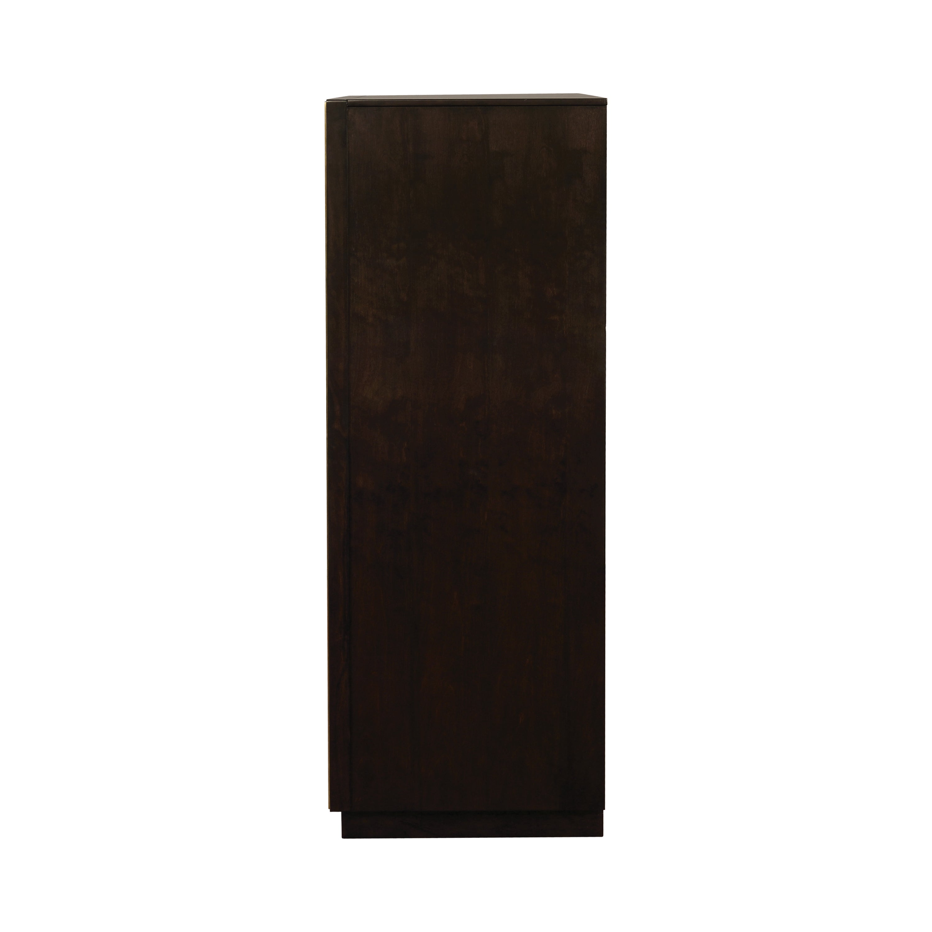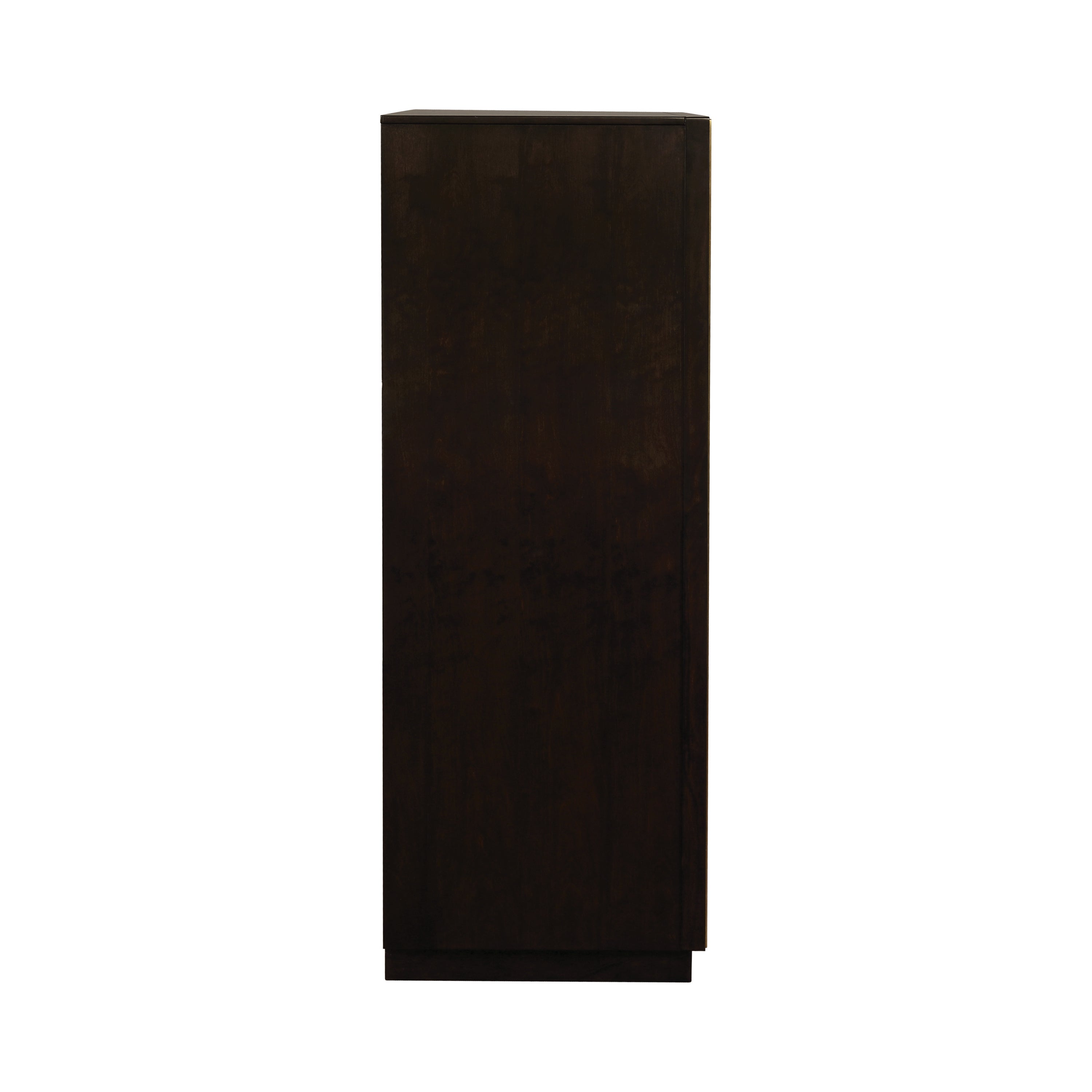 With five spacious drawers, this chest is convenient and versatile. Its large size is ideal for keeping your wardrobe organized. Its strong silhouette is enhanced by an attractive, smoked peppercorn finish. Its long, sleek drawer handles and outer frame are a lovely shade of gold, giving it an eye-catching touch of glamour. With a transitional design, this chest blends seamlessly with a variety of decor styles.