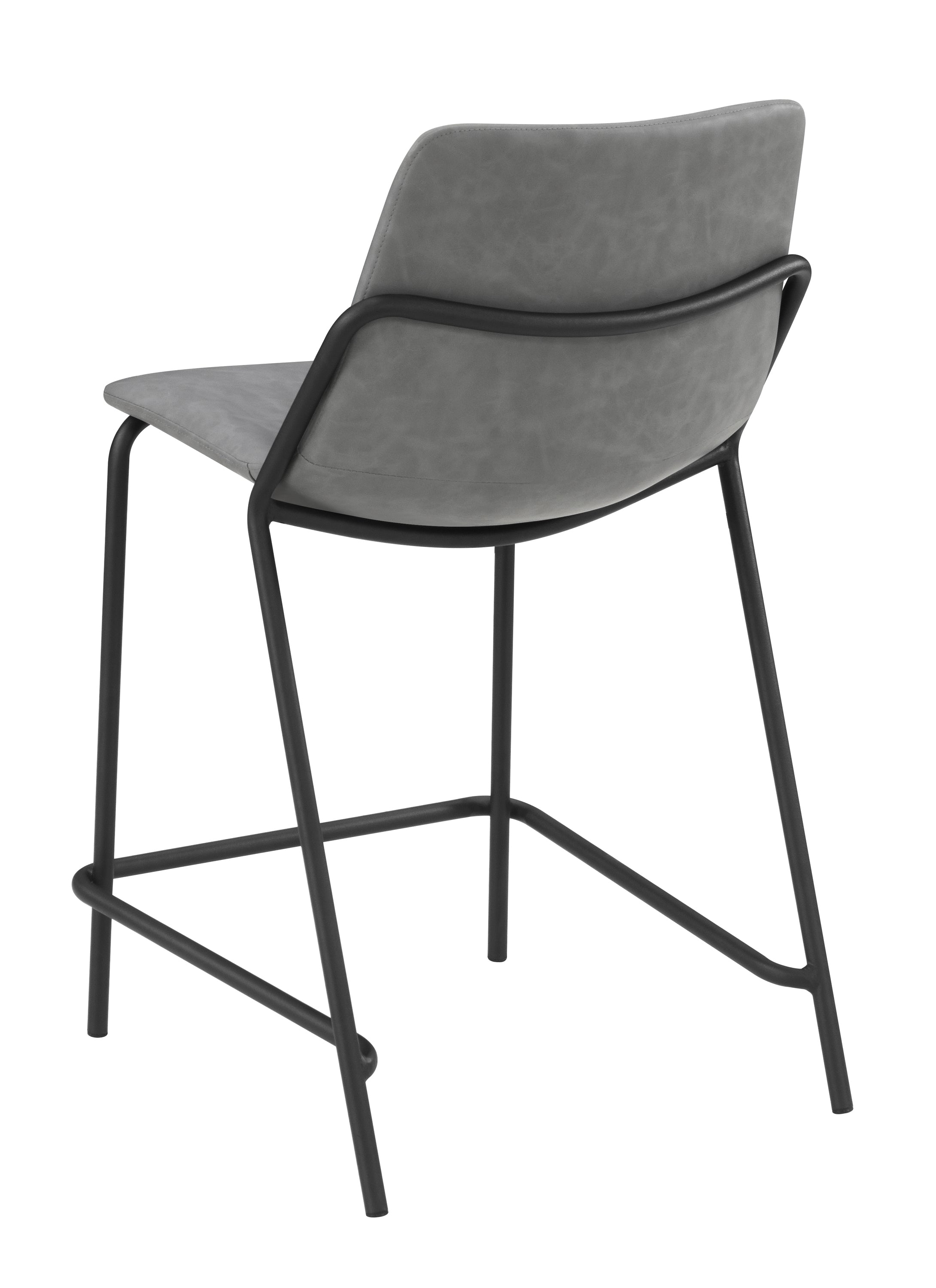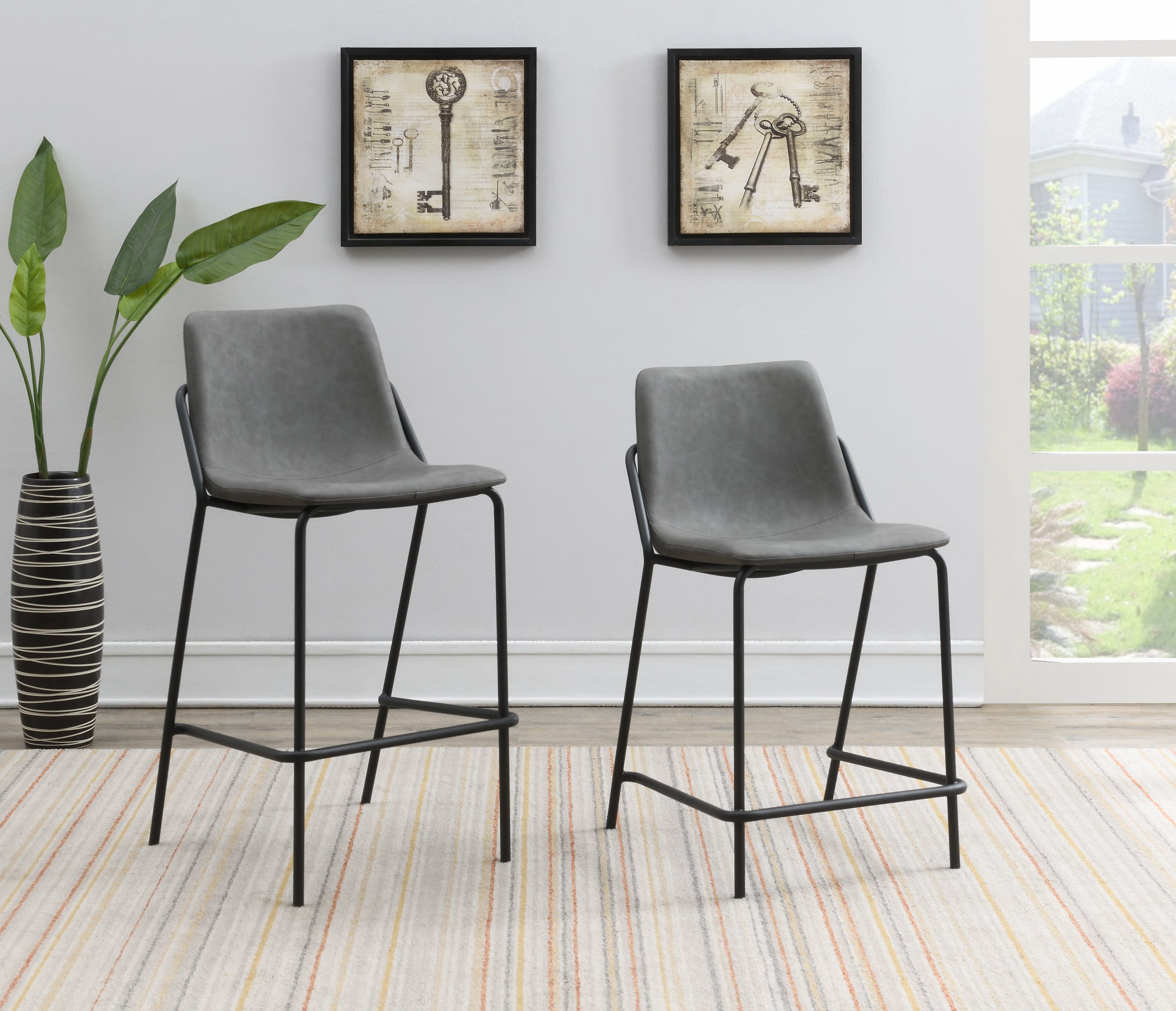 This pair of two stools offer a minimal look and a contemporary vibe. Supported by thin and tall frame in a black finish, it has an open and airy design that works with many styles. Each chair has a bucket style, Mid Century inspired seat, which is wrapped in a leatherette that is easy to clean and soft to the touch. In addition, each stool offers a supportive footrest run between the two front legs. Add a pair of these stools to a home bar for entertaining.