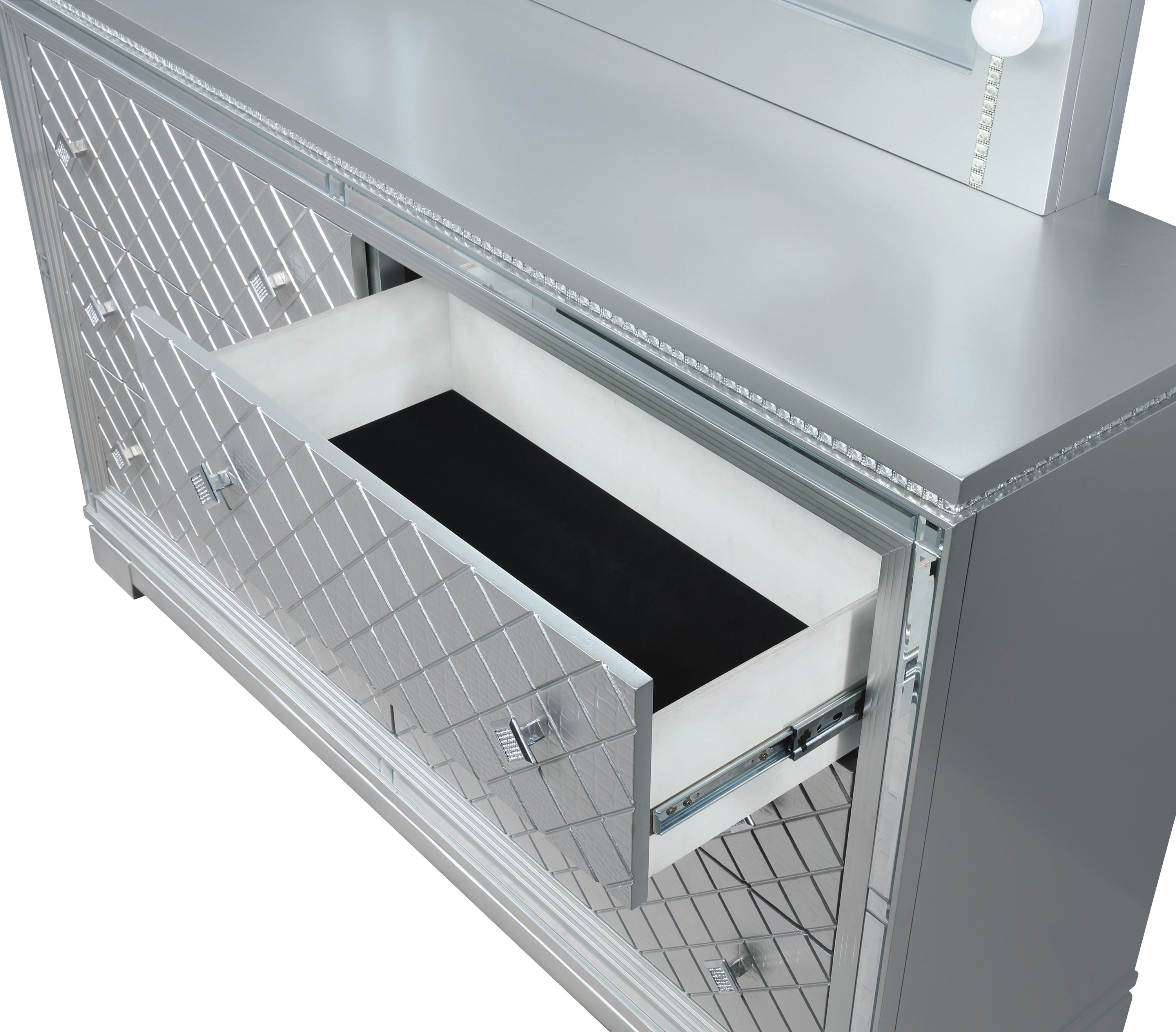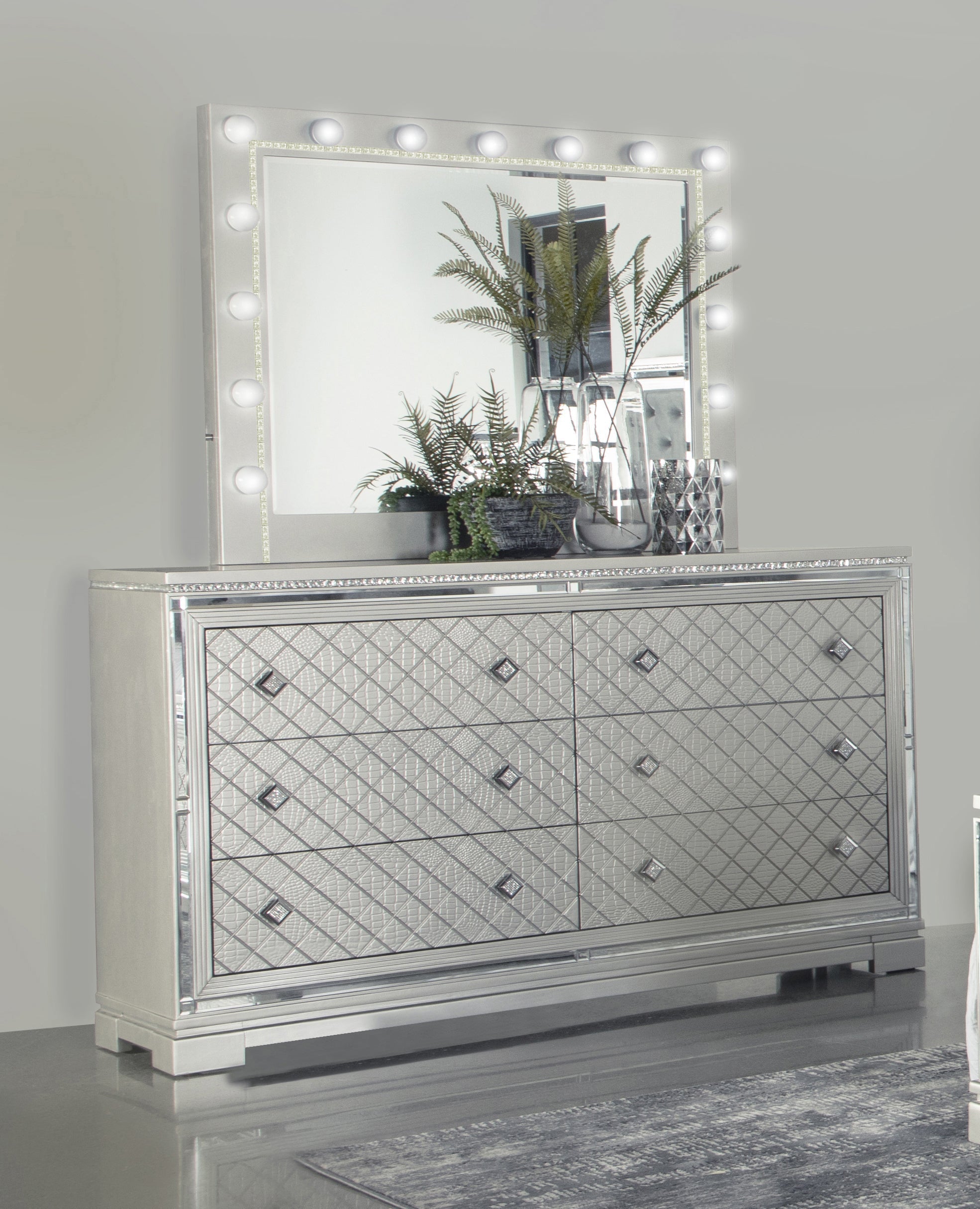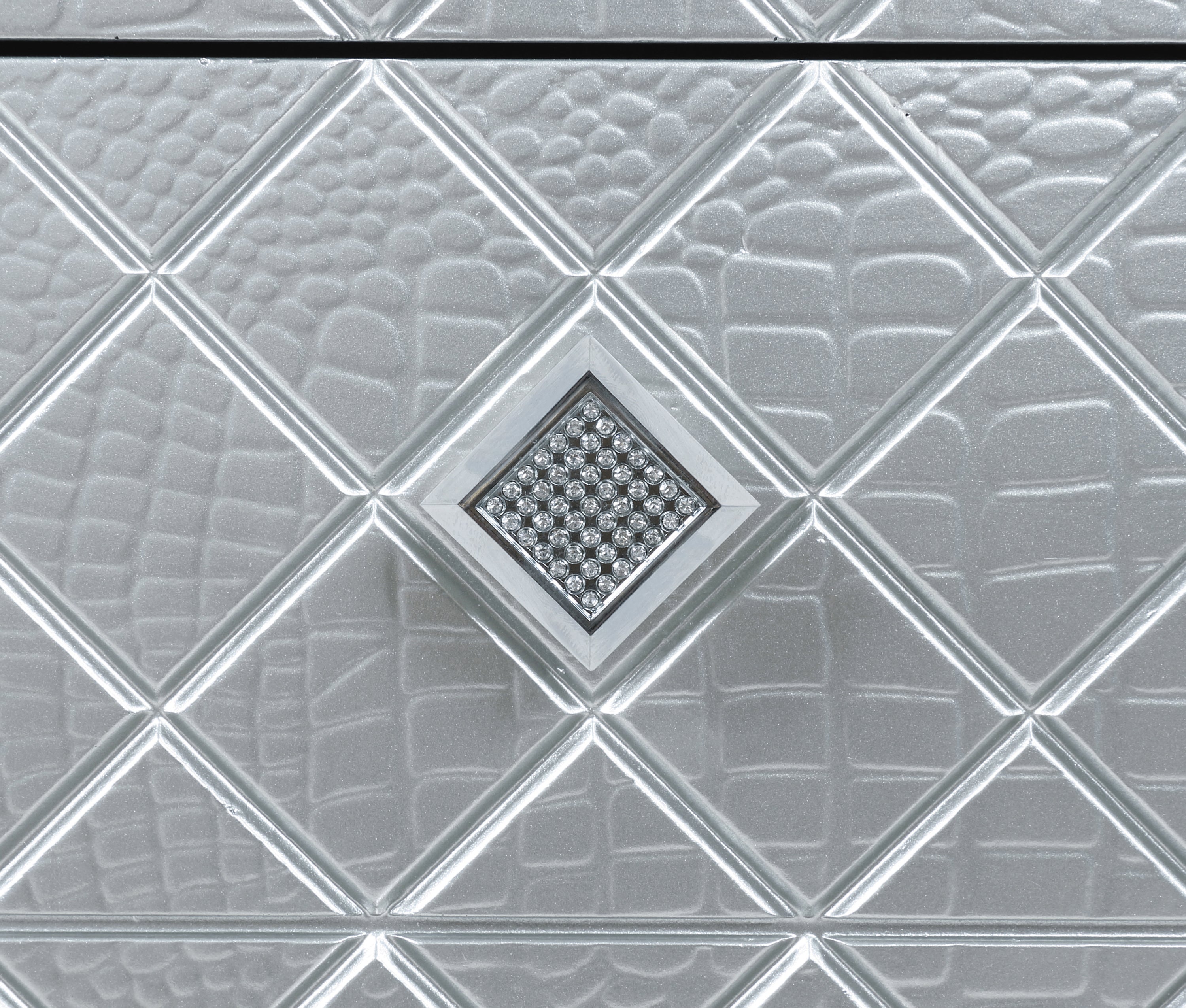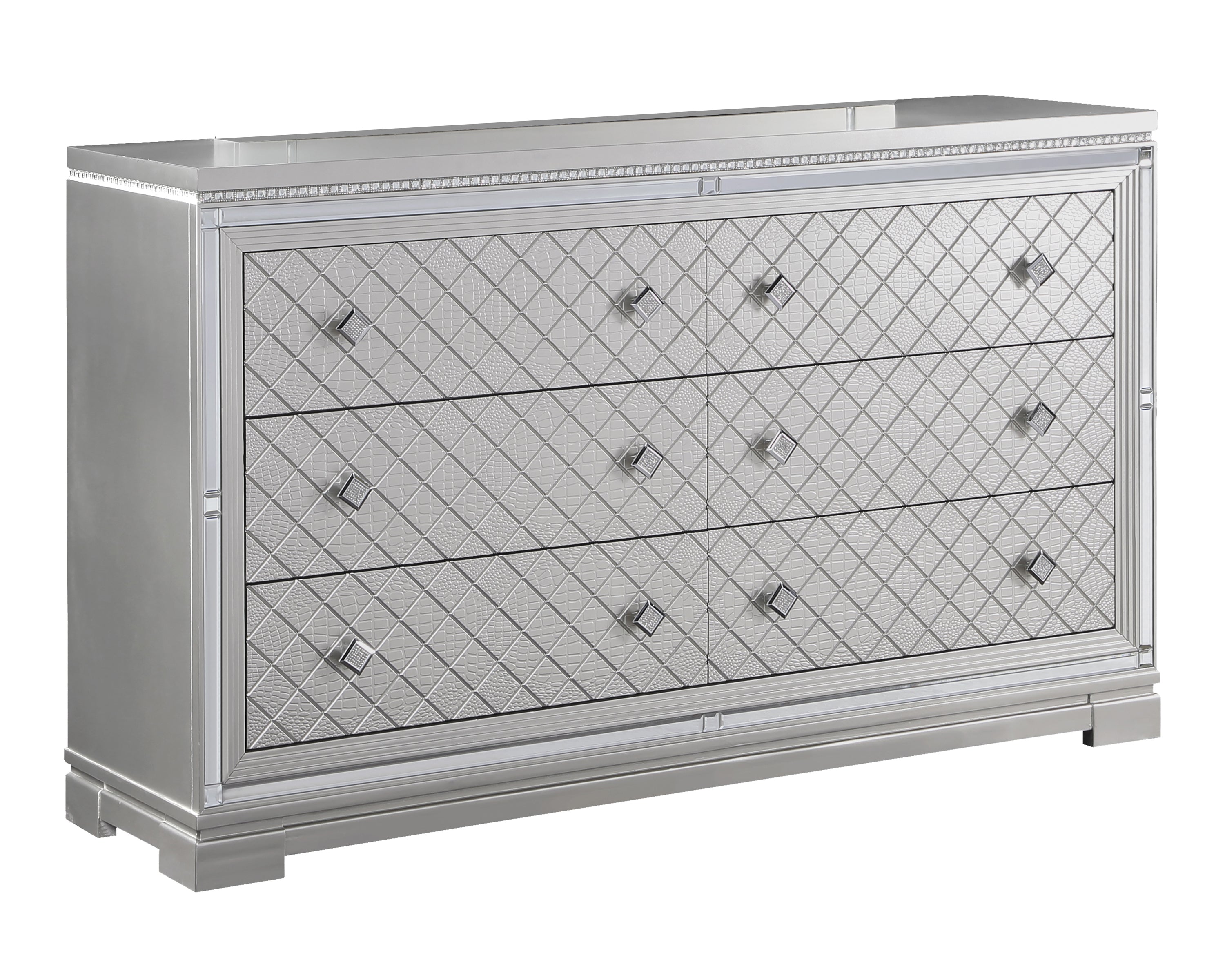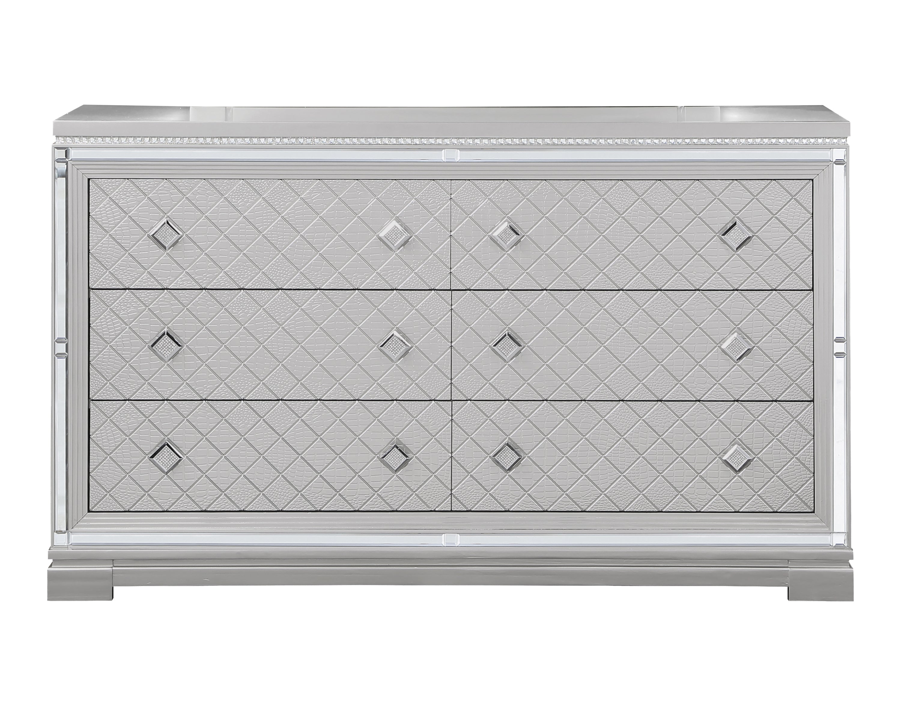 This glam six-drawer dresser lends a stunning addition to a modern bedroom retreat. A bright finish lends itself to existing color palettes while accents like diamond-shaped, crystal-encrusted knobs sparkle and reflective mirror trim outline the set of drawers. To further lend to the finish, crocodile and diamond embossed drawer fronts add an intriguing flair. Modern touches like felt-lined top drawers invite you to keep delicate items like jewelry and silk scarves or ties. This substantial bedroom furniture piece also rests on bracket feet for a subtle lift and extra stability.
