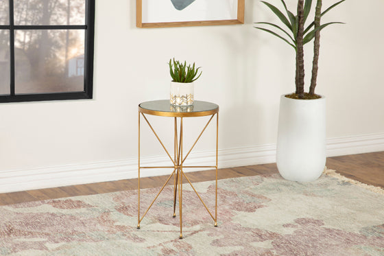 Glam finishes and a symmetrical design elevate the look of this understated, contemporary accent table. With an elegant round tabletop shape supported by a slim, angular metal base, this accent table offers an open, airy design for compact spaces. The tabletop features a solid green marble, inset in a metal frame in a warm antique gold finish that lends a glam, regal touch to the piece. Petite feet in a teardrop shape with protective caps, ground the base and offer visual weight. Place this contemporary accent table within a space for a hint of classical style.