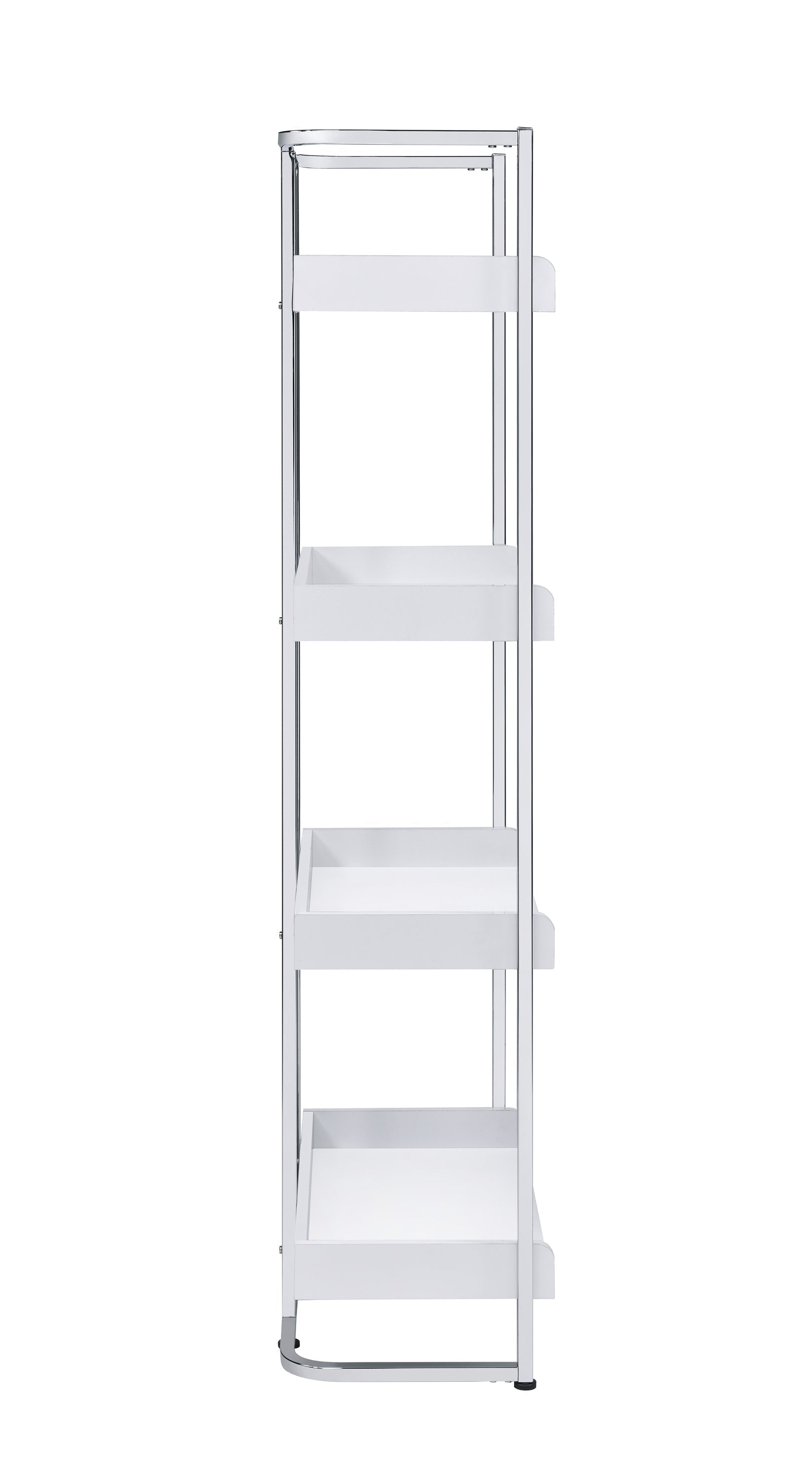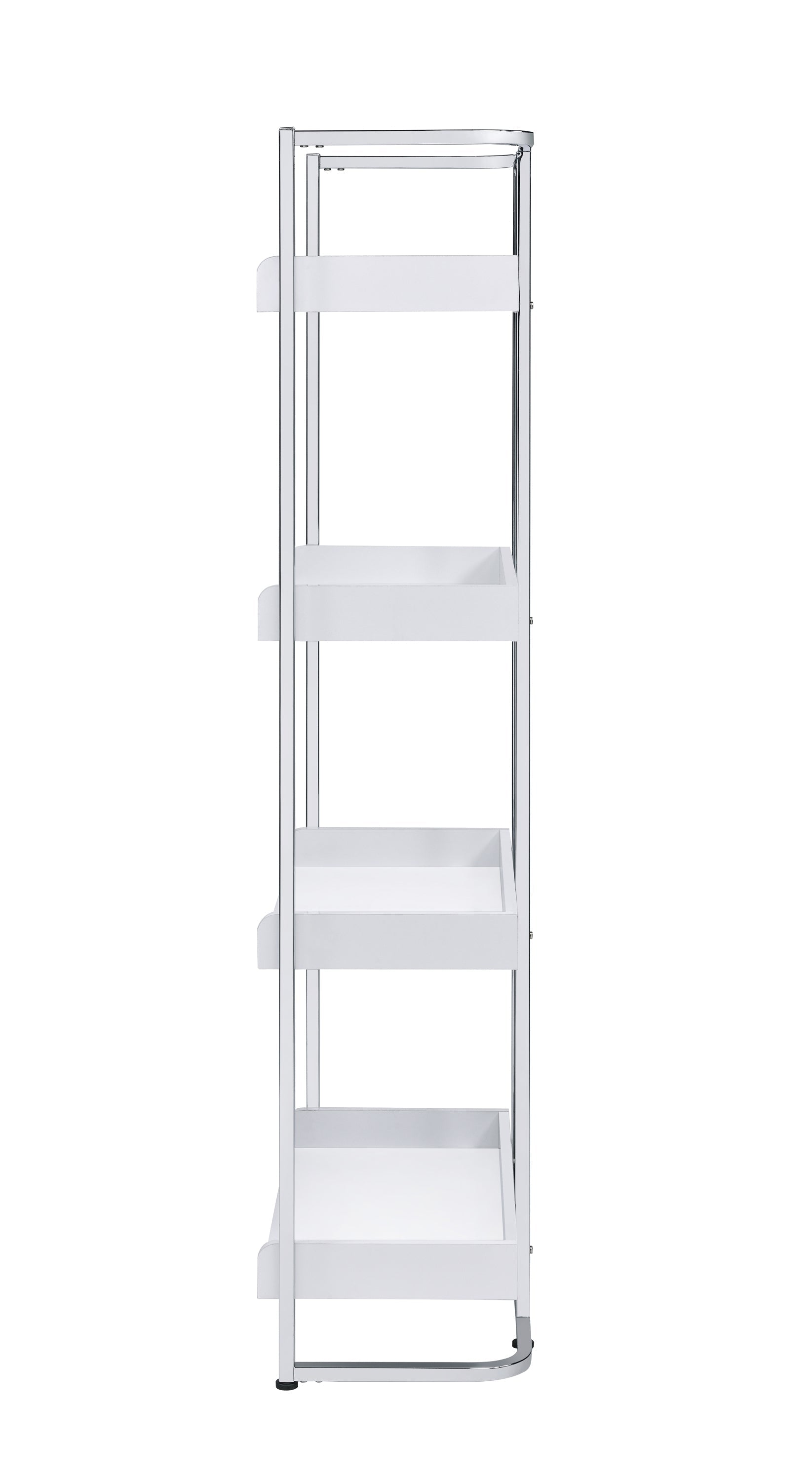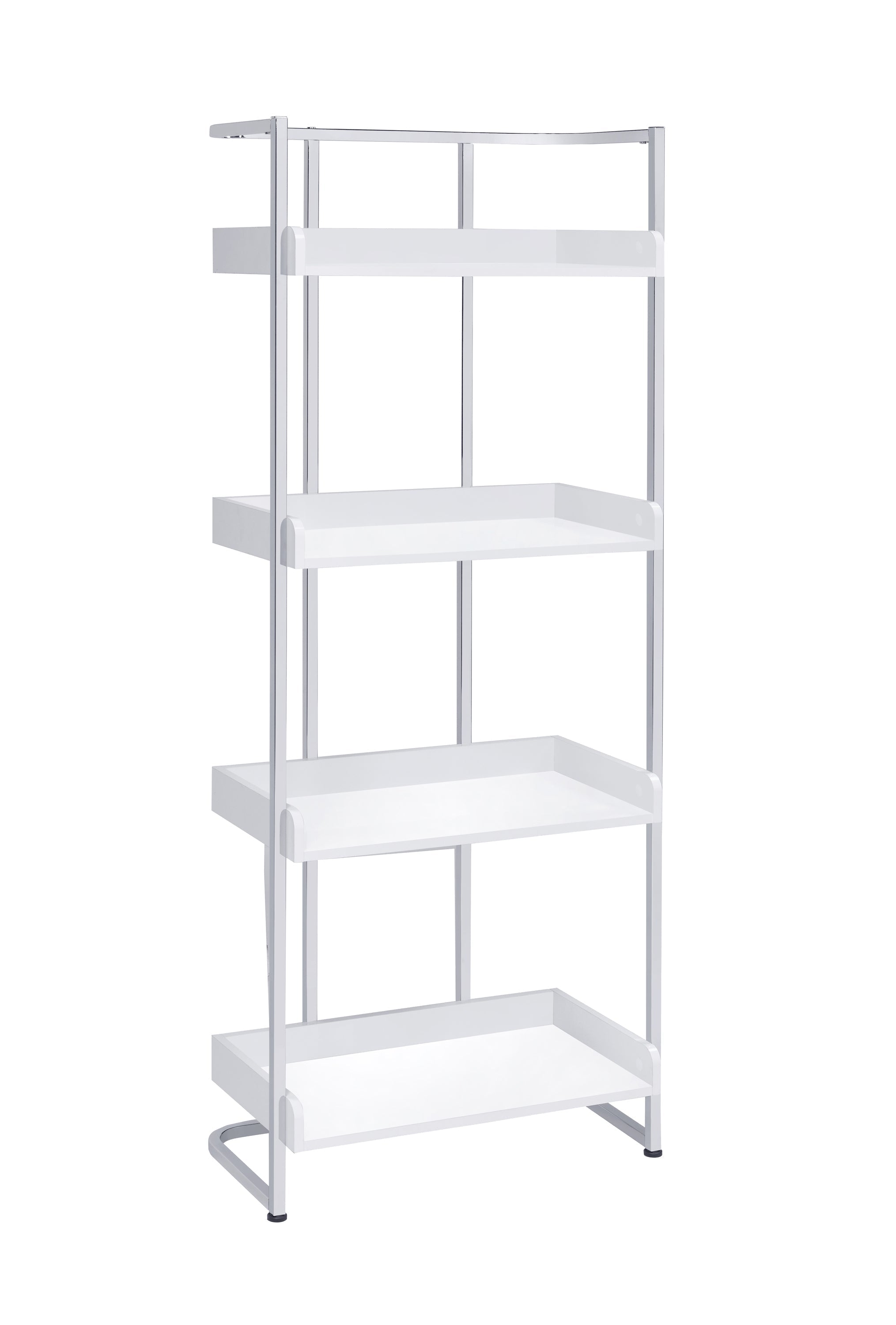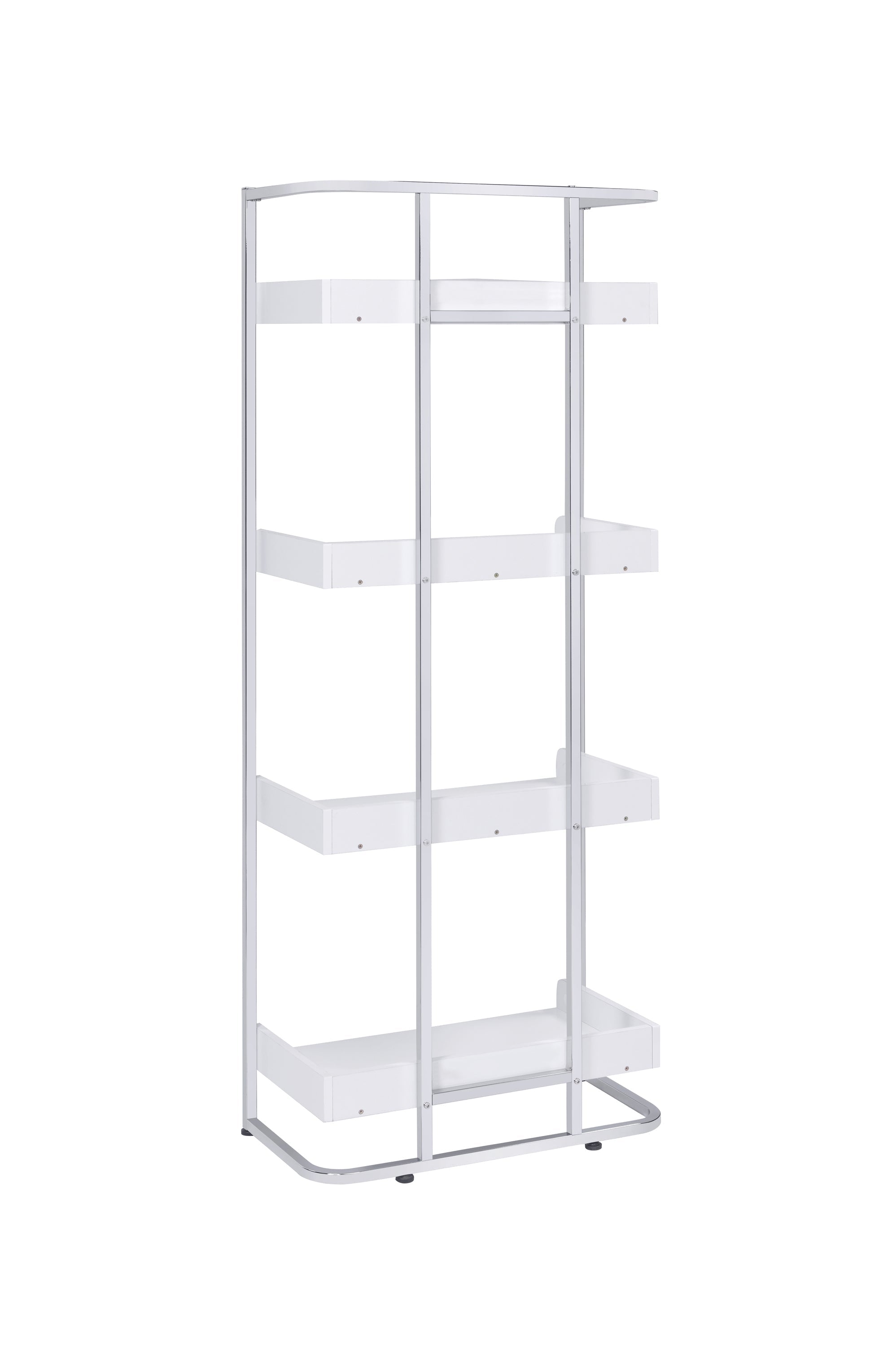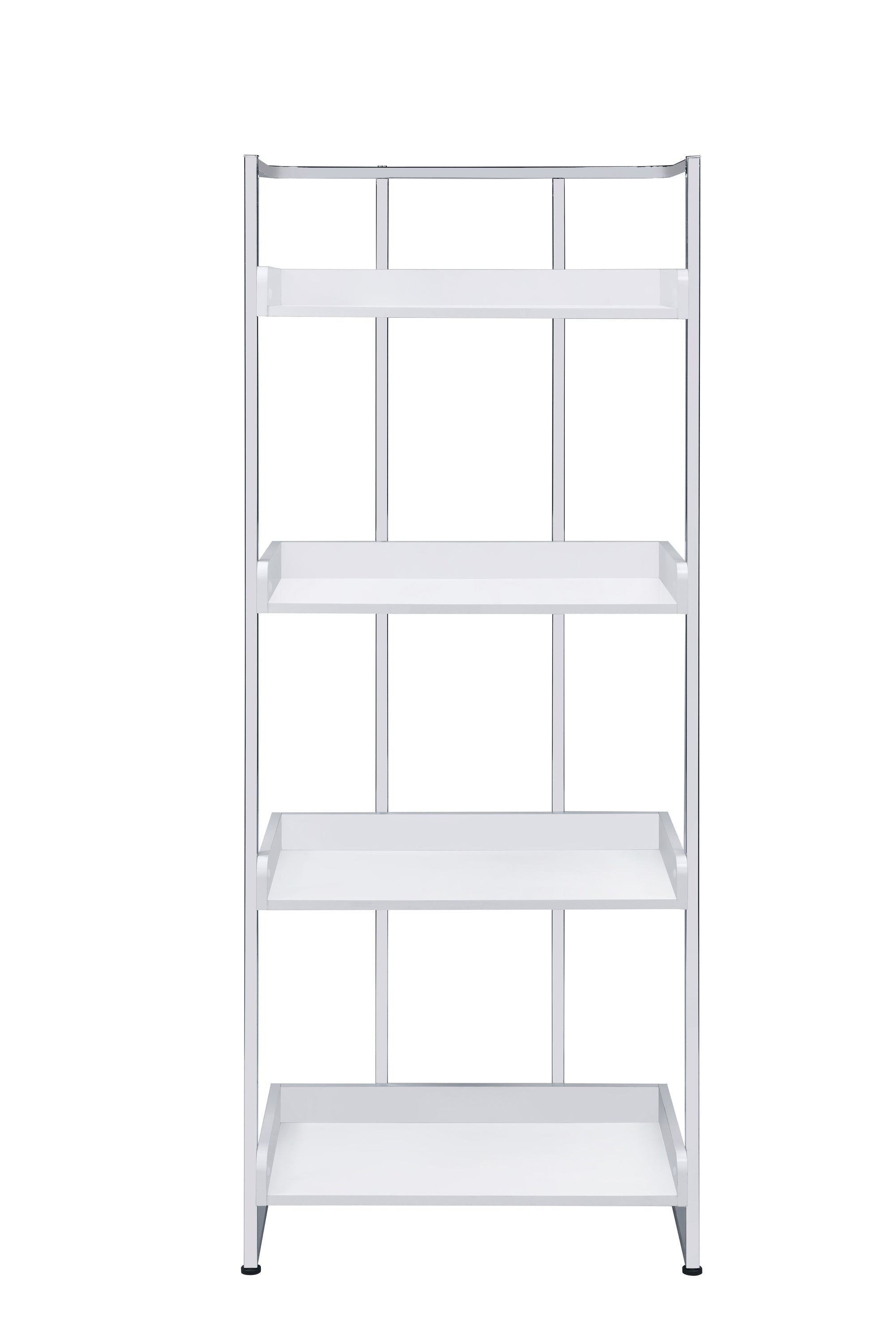 A steel bookcase is bound to steal your heart with its stylish appearance. Four roomy shelves allow for displaying your favorite novels. With its open back design, you'll have no trouble finding the ideal spot in your modern office. Its construction ensures a durable and long-lasting upgrade. This piece is supported on a rounded open base.