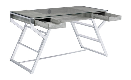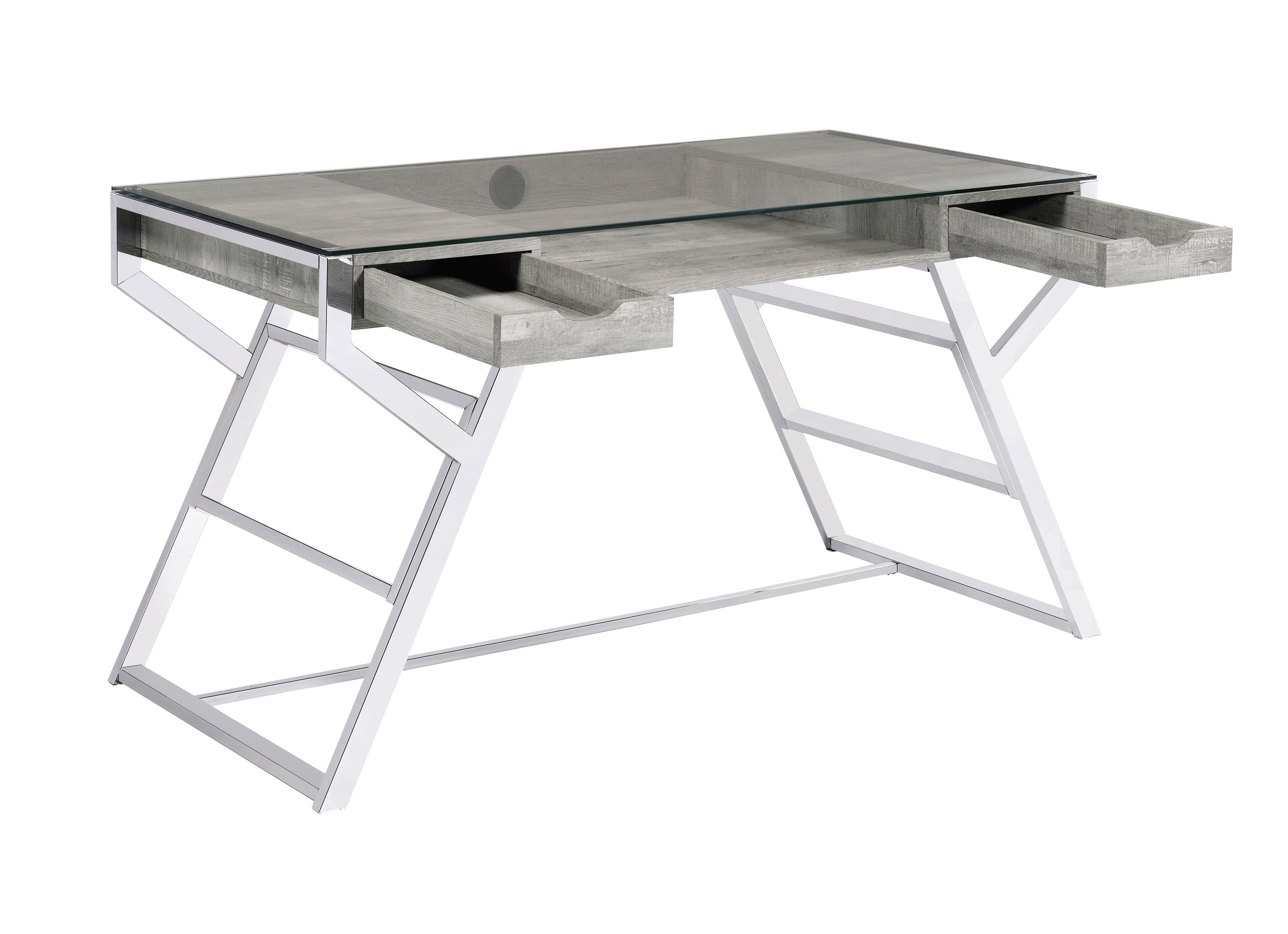 Perfect for a contemporary home office with this striking, sharp silhouette, this writing desk offers a convenient space to get work done. Designed with a lovely rustic grey driftwood finish, the desk tabletop features an open center space for sliding keyboards and paperwork, flanked by two drawers for hiding and organizing accessories. The tabletop itself rests on a supportive heavy gauge steel frame that flares outward in a ladder-like design. With lustrous, electroplated polished chrome finish, the legs offer a hint of glamour. Across the table is a smooth clear tempered glass top that lends one final chic touch.