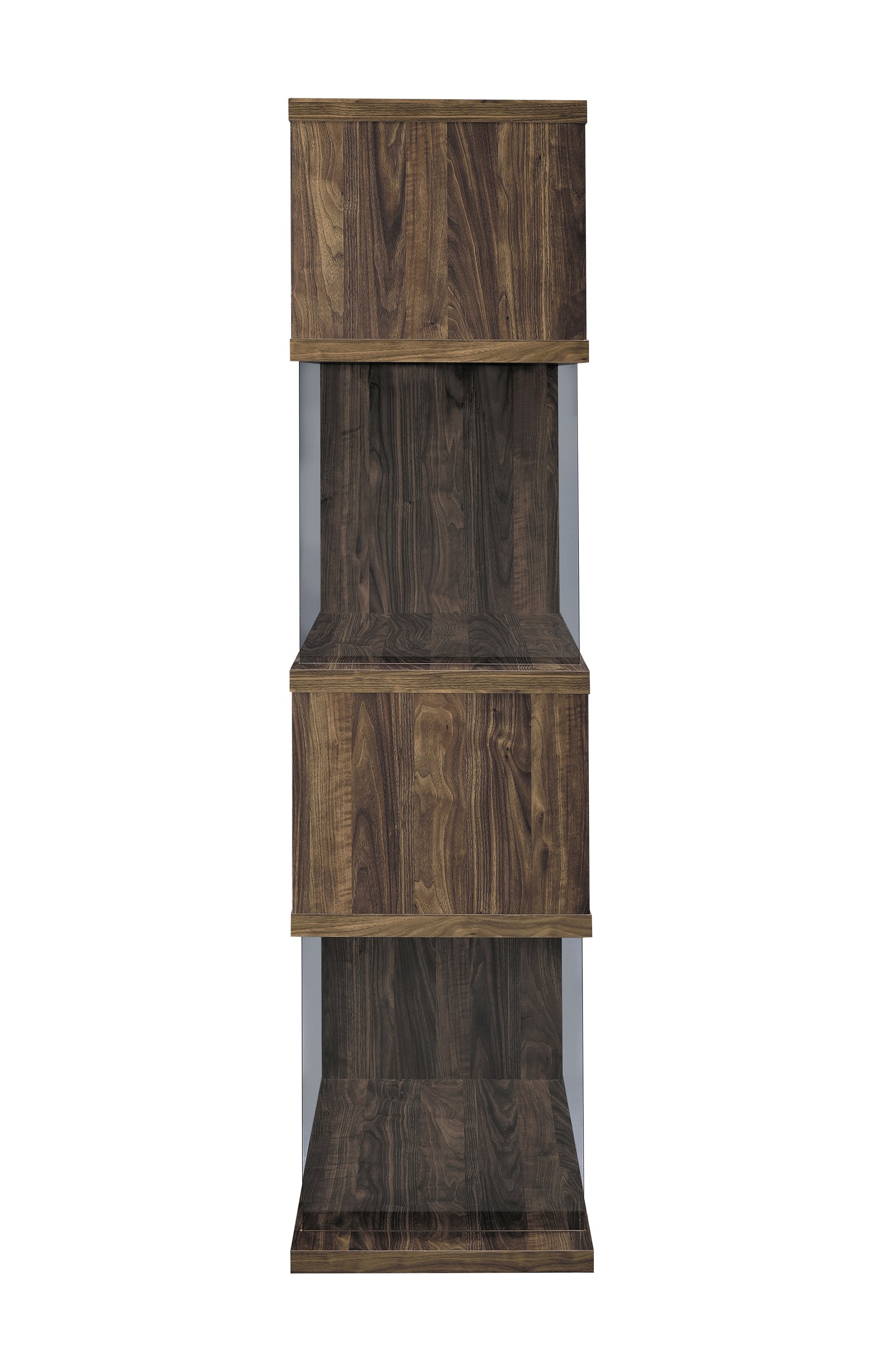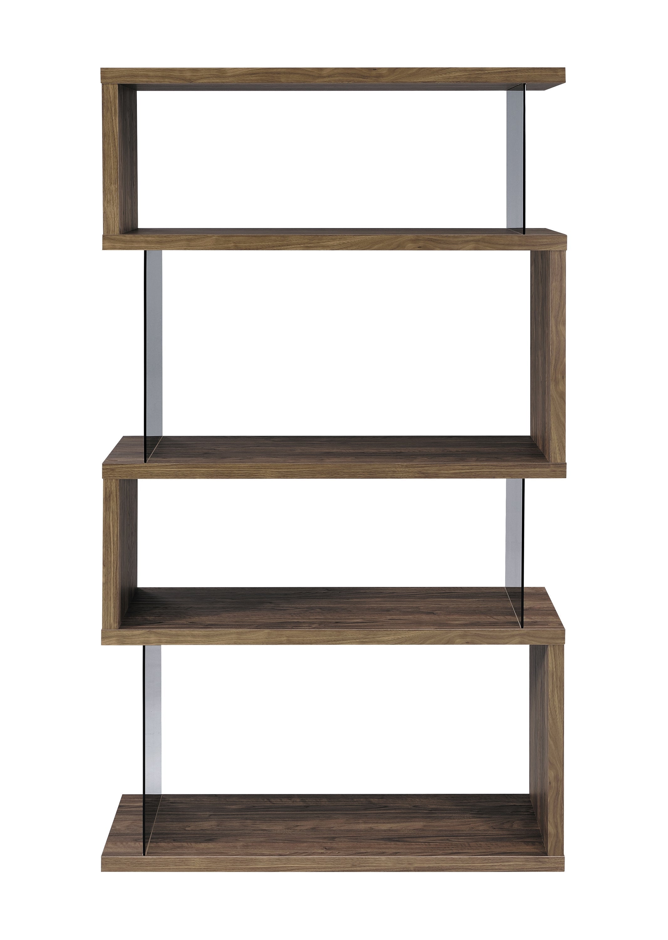 Elegant, asymmetrical lines merge to create this contemporary bookcase, a perfect additional way to showcase items in a room. Five open shelves in an aged walnut finish lend a mid-century vibe, supported by semi-transparent, smoked glass side panels that lend a modern flair. Perfect for home offices, living rooms, and much more, this zig-zag design bookcase showcases book collections, decor, and other favorite items for all to see. With a flush base, this open bookcase unit rests sturdily and securely on the floor. Clean lines and an impressive jagged appearance lend a focal point to any room.