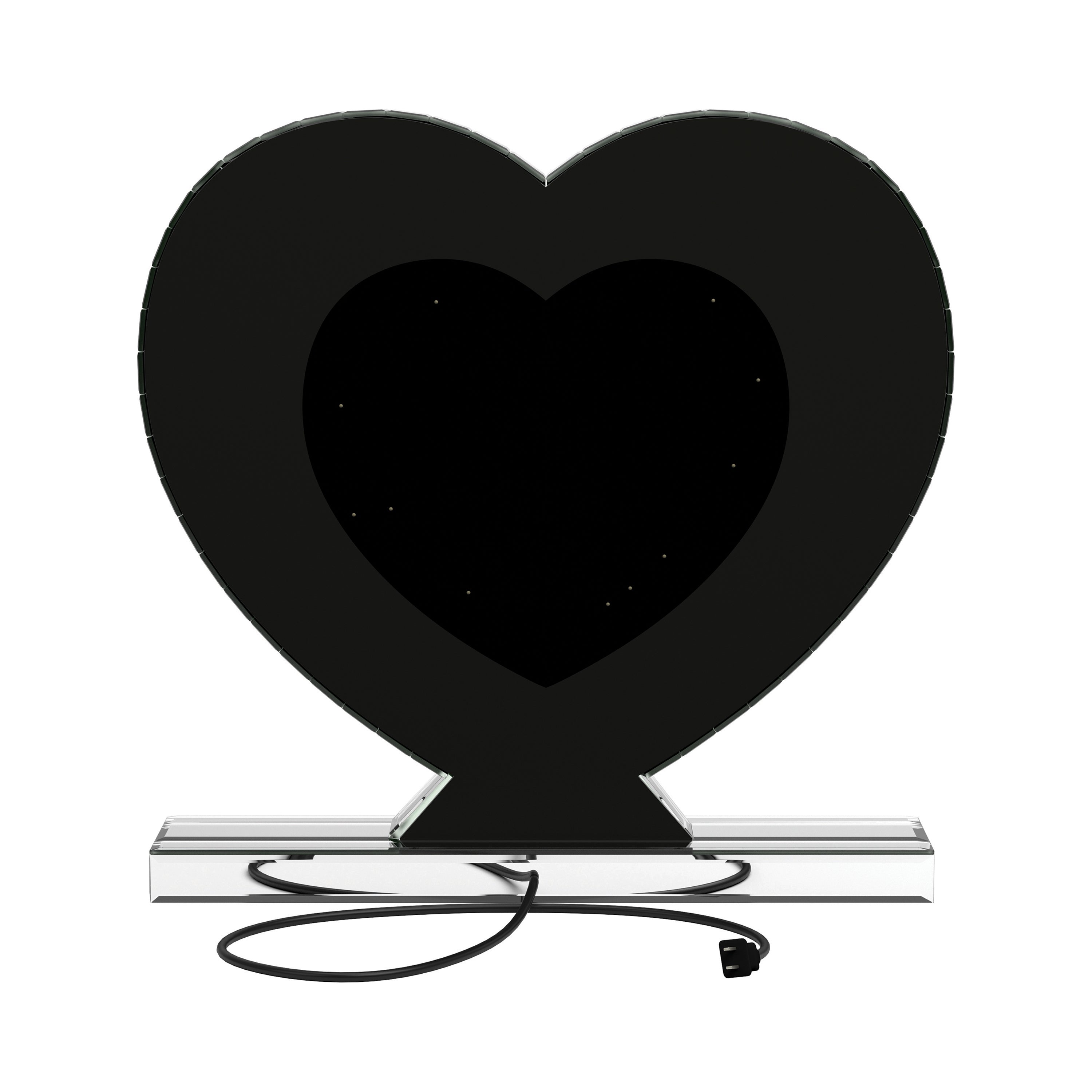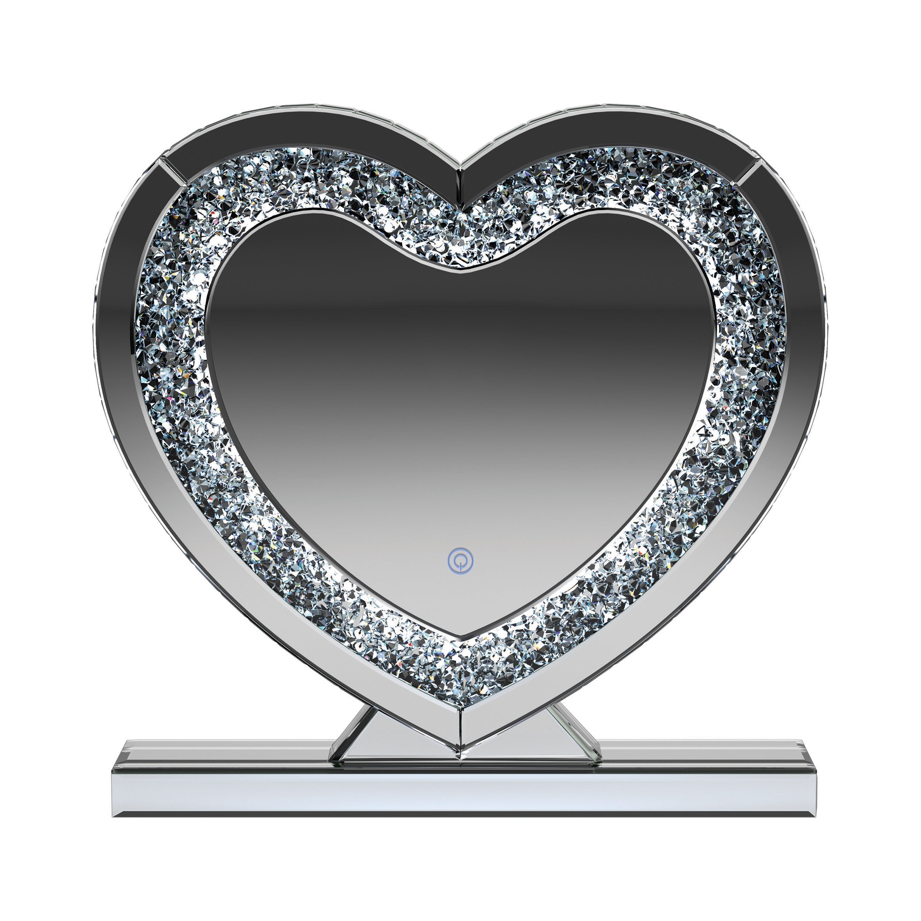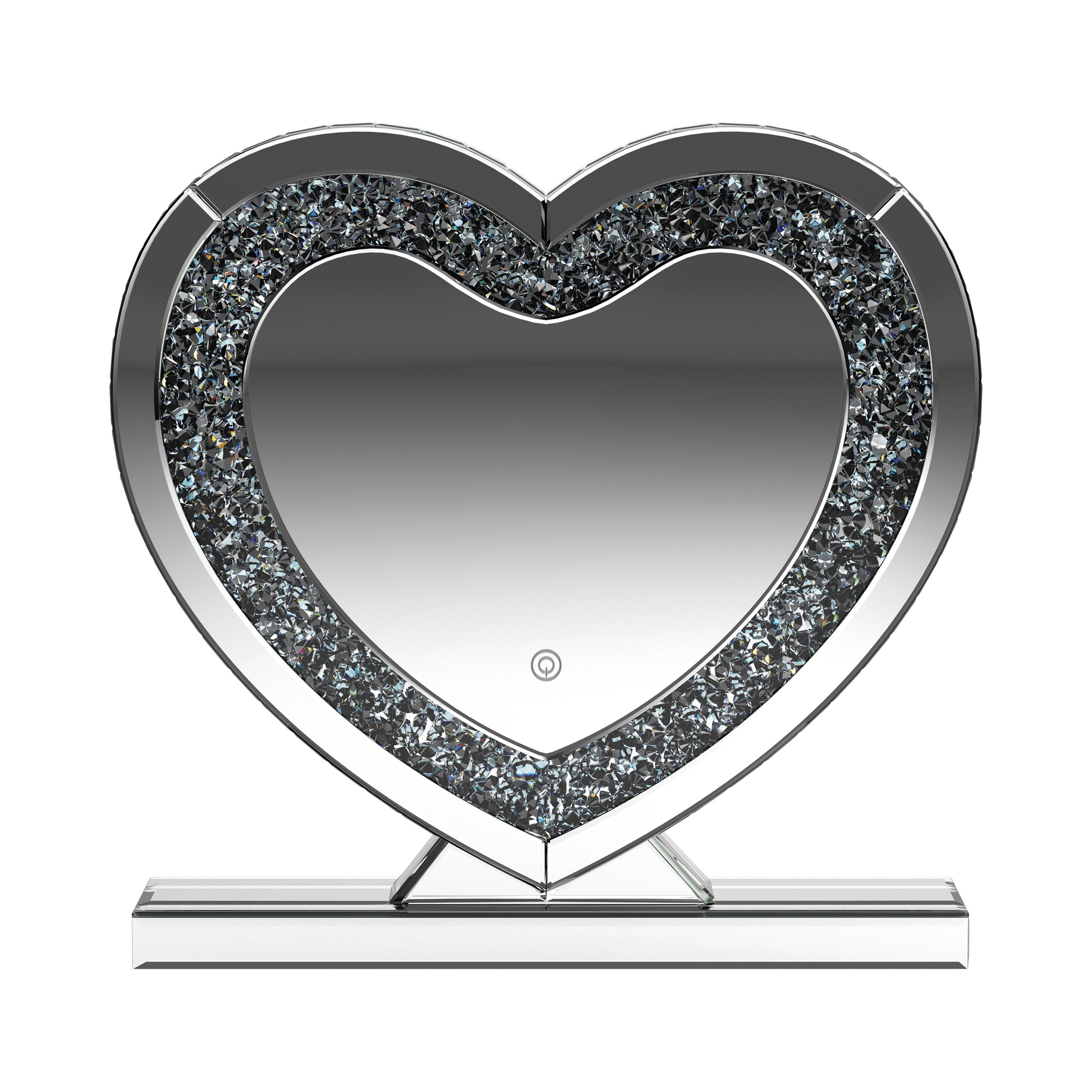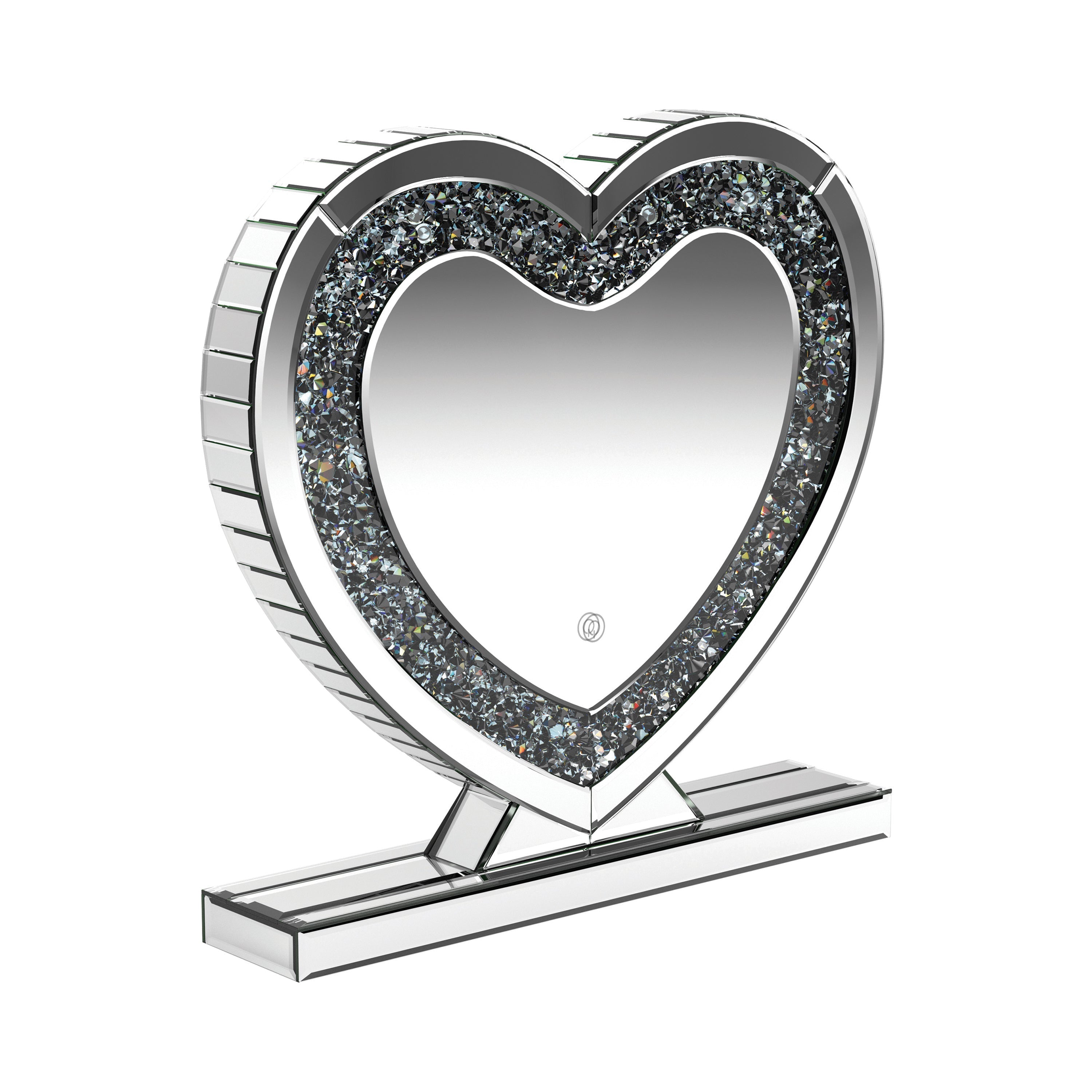 Draw attention to a heart motif with this whimsical table mirror. The heart shape mirror features a silver frame and stand for displaying on a table or shelf. This accent mirror provides sculptural depth when displayed on a bookcase along with other keepsakes. The clear mirrored surface adds a dimensional element that draws the eye. This contemporary mirror could also serve as an artsy accent on a dresser or nightstand.