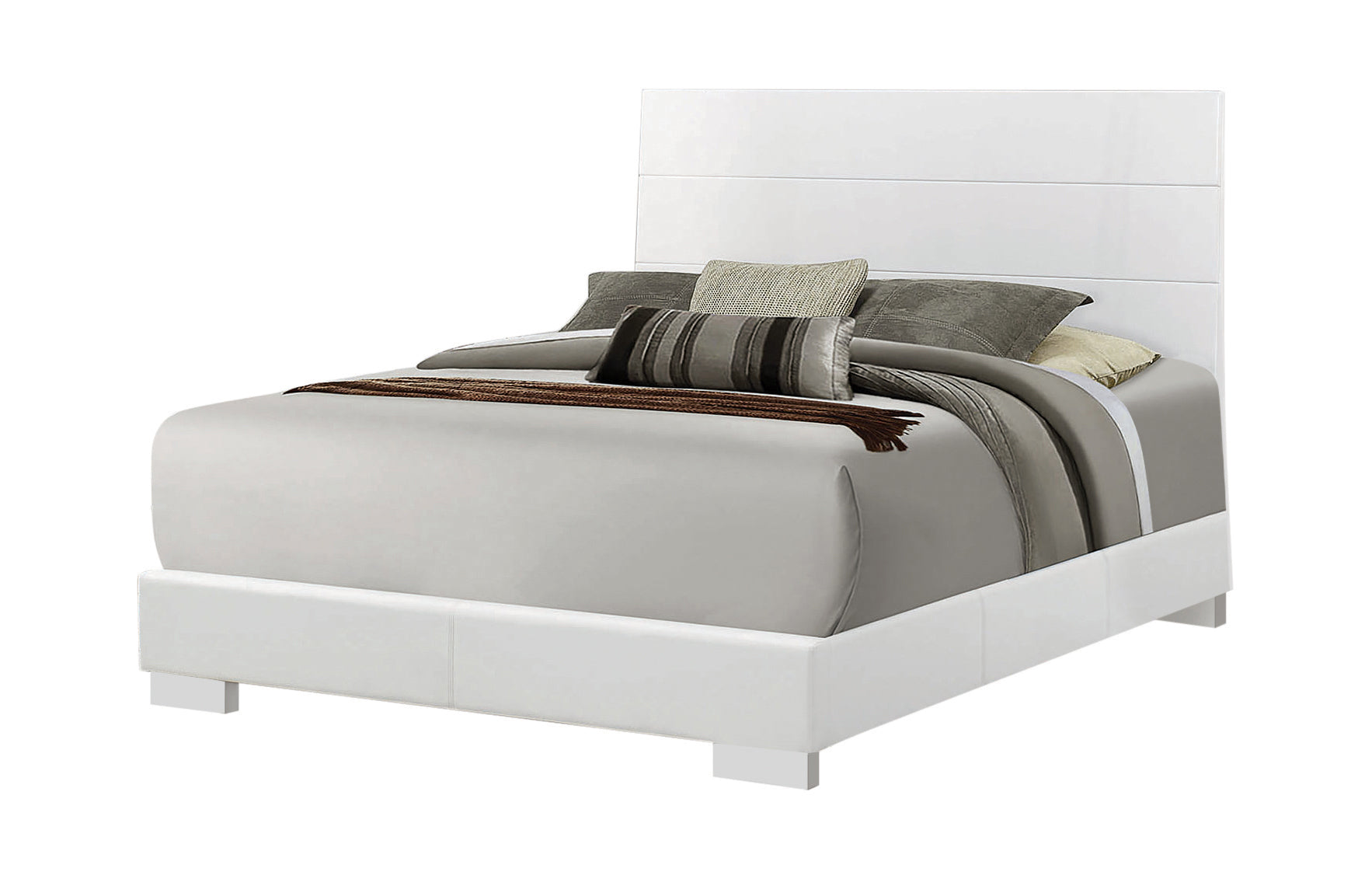Balance and symmetry are in full style. This elegant bed stands out to capture attention. With an extra tall headboard and low-profile, it lends a sophisticated touch. White coated and polished high gloss finish gleams to impress. The stellar contemporary design shows off clean lines and a cool, airy design aesthetic.