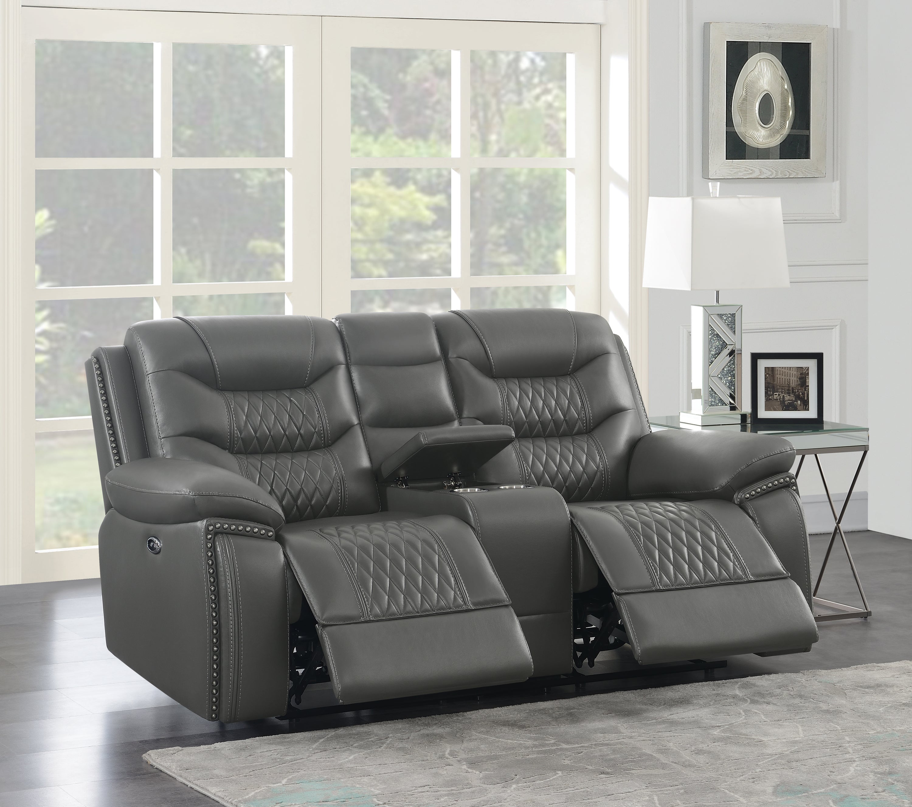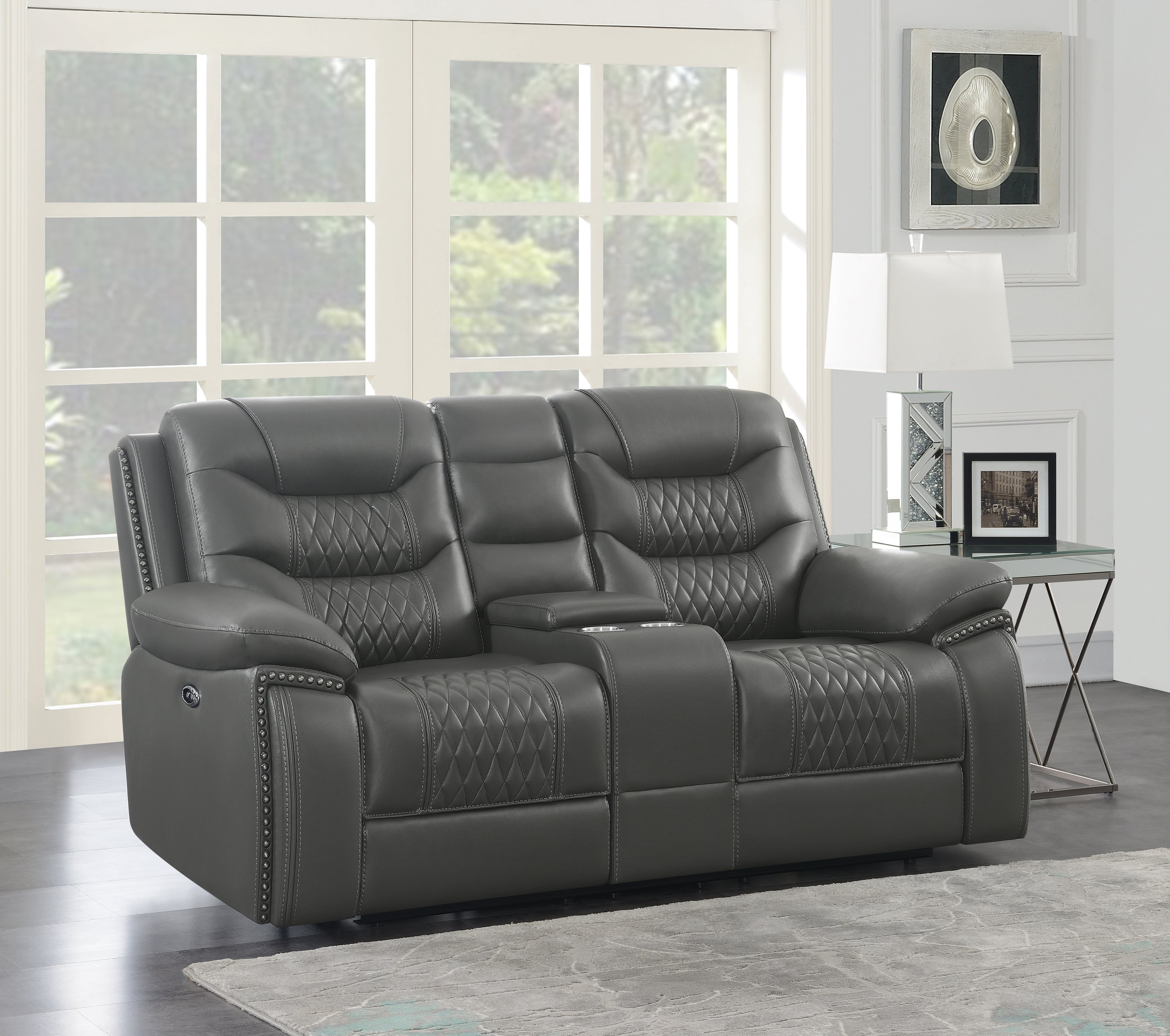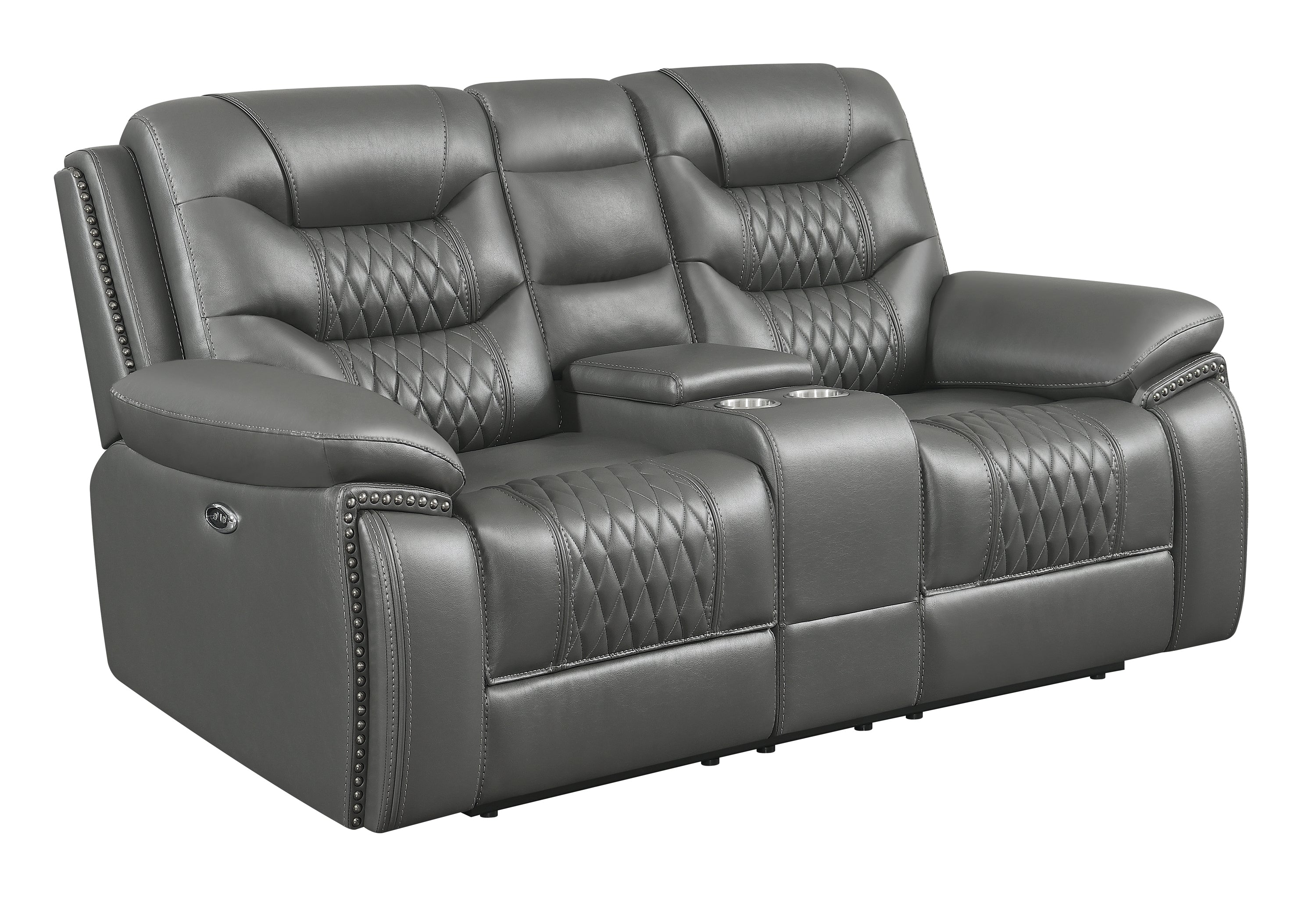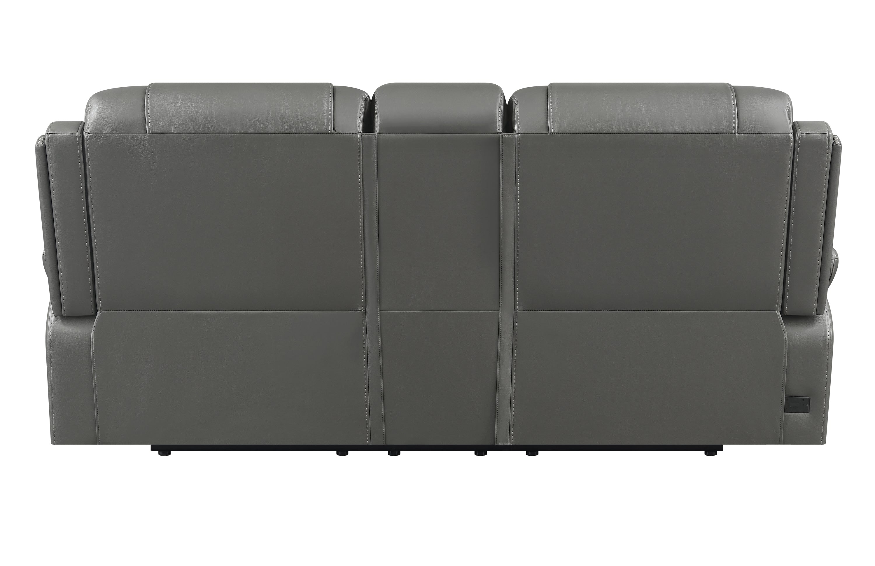 Power loveseat upholstered in charcoal breathable performance leatherette