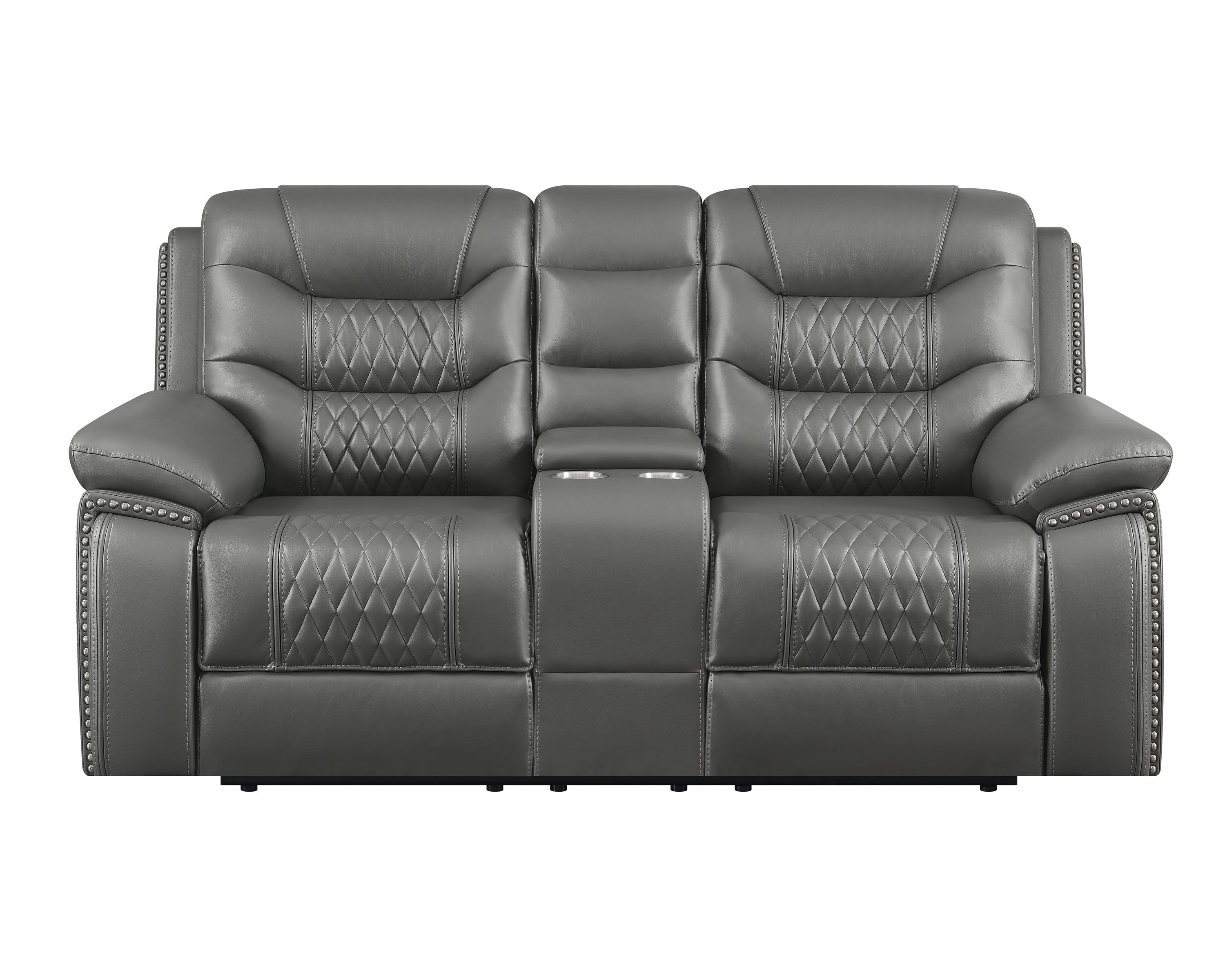 Handsome with a western flair, this casual power motion loveseat is wrapped in an upholstered in smooth and breathable performance leatherette. Beneath the smooth upholstery is a cool gel memory foam topper, offering a soothing sensation as you unwind. This power loveseat also offers a comfortable place to rest, complete with a space-saving and convenient wall hugger mechanism. In addition, this piece offers a lift-top center console to store remotes and gaming controllers, and offers two stainless steel cup holders to keep a cold beverage nearby. Plush arm rests and headrests offer ultimate comfort, along and diamond stitched details and supportive pocket coil seating.