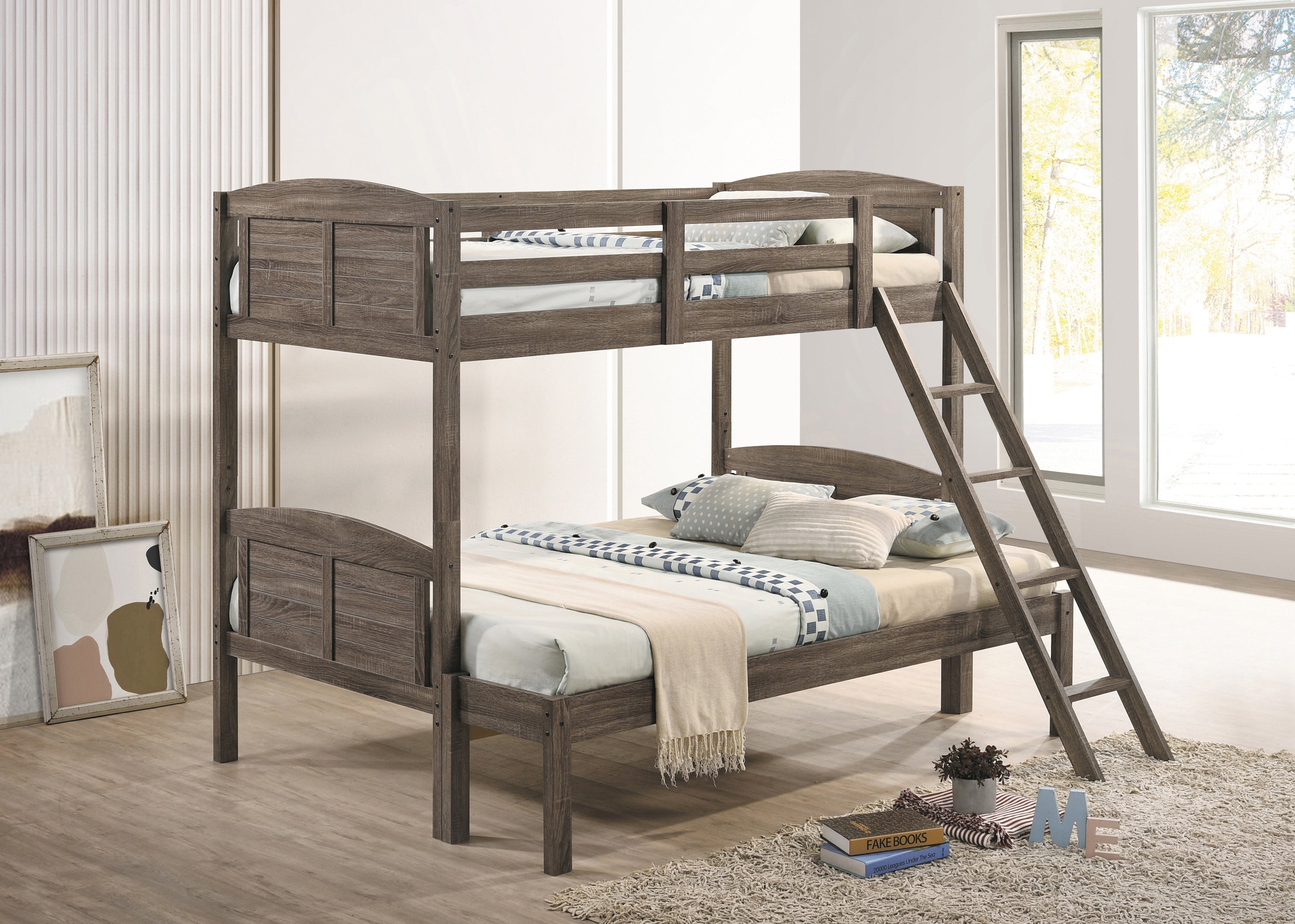 A casual country vibe carries the space with this rustic bunk bed, perfect for compact bedrooms and shared sibling spaces. A weathered brown finish lends a neutral hue to transform a space into a serene, restful retreat. Along the top bunk are safety guardrails to keep younger ones secure as they sleep soundly through the night, complete with a built-in ladder for climbing up. The arched headboard and footboard offer grace and style, along with the plank paneling as the bottom bunk invites baskets, bins and more to organize personal items. Last but not least, this versatile bunk bed can be separated to create individual beds when siblings wish for their own space.