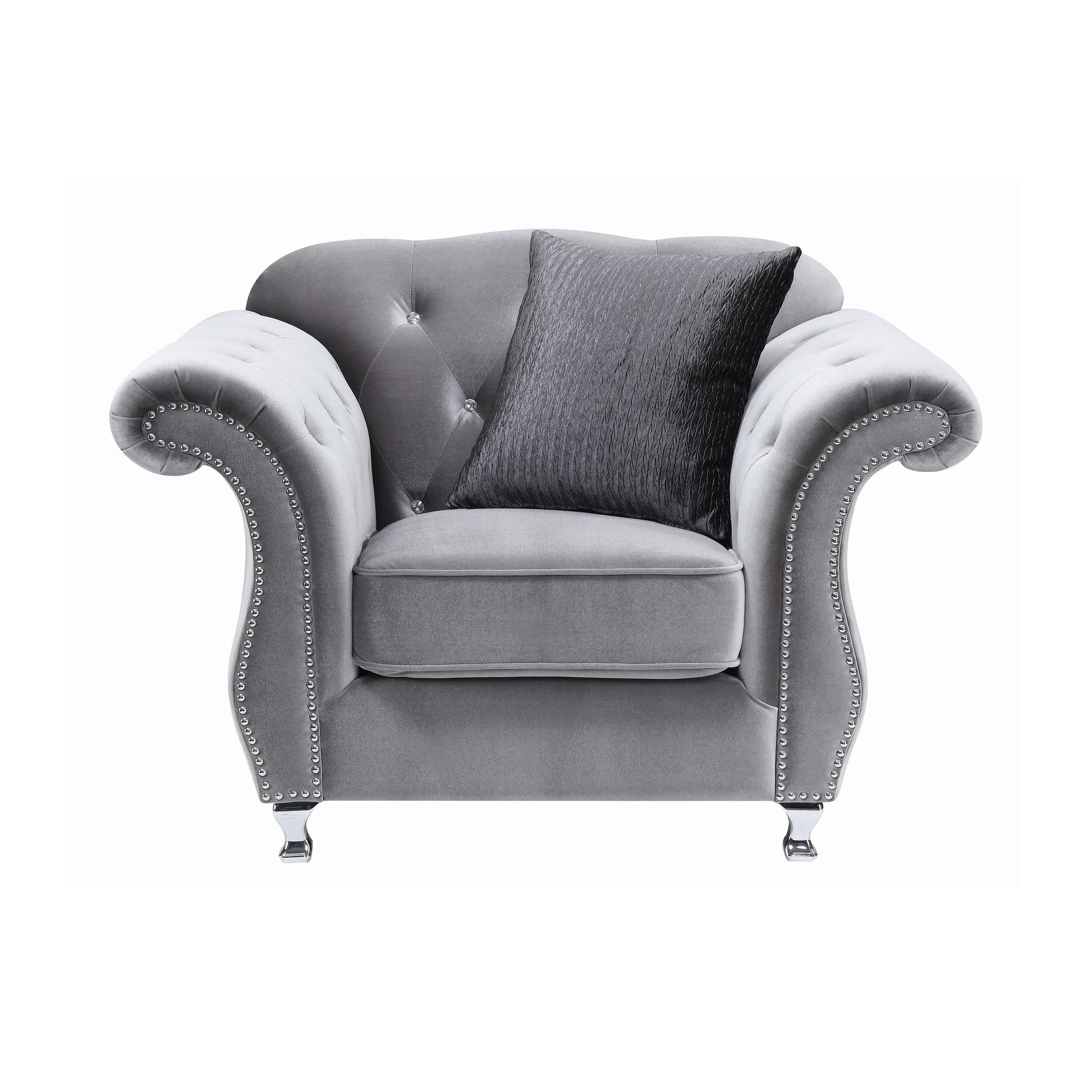 When only the most elegant, artful decor will do. This exquisite armchair reinforces the stylish traditional flavor of a living room or family room. Romantic touches include slender rolled arms and charming tufting. Sleek accented feet and arm trim create a genuinely beautiful aesthetic. With lush silver upholstery, this chair starts a custom look with glamorous possibilities.