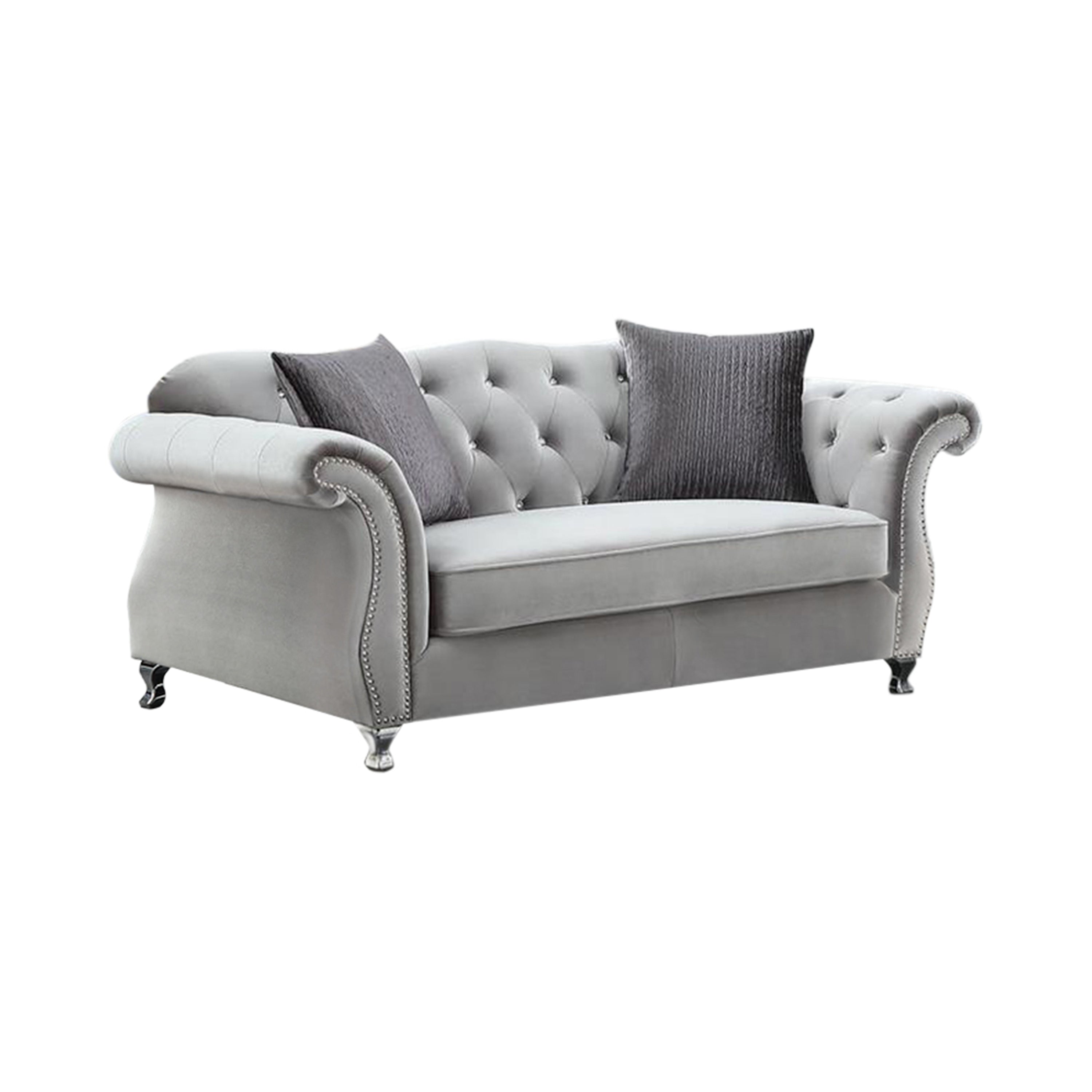 Graceful and glamorous, this loveseat lends classic sophistication to any home. With soft, silver upholstery, it has a luxurious look and feel. Beautiful button tufting adorns its frame. Elegant rolled arms complete its stylish look. This loveseat is ideal for a traditional living room with a light color palette.