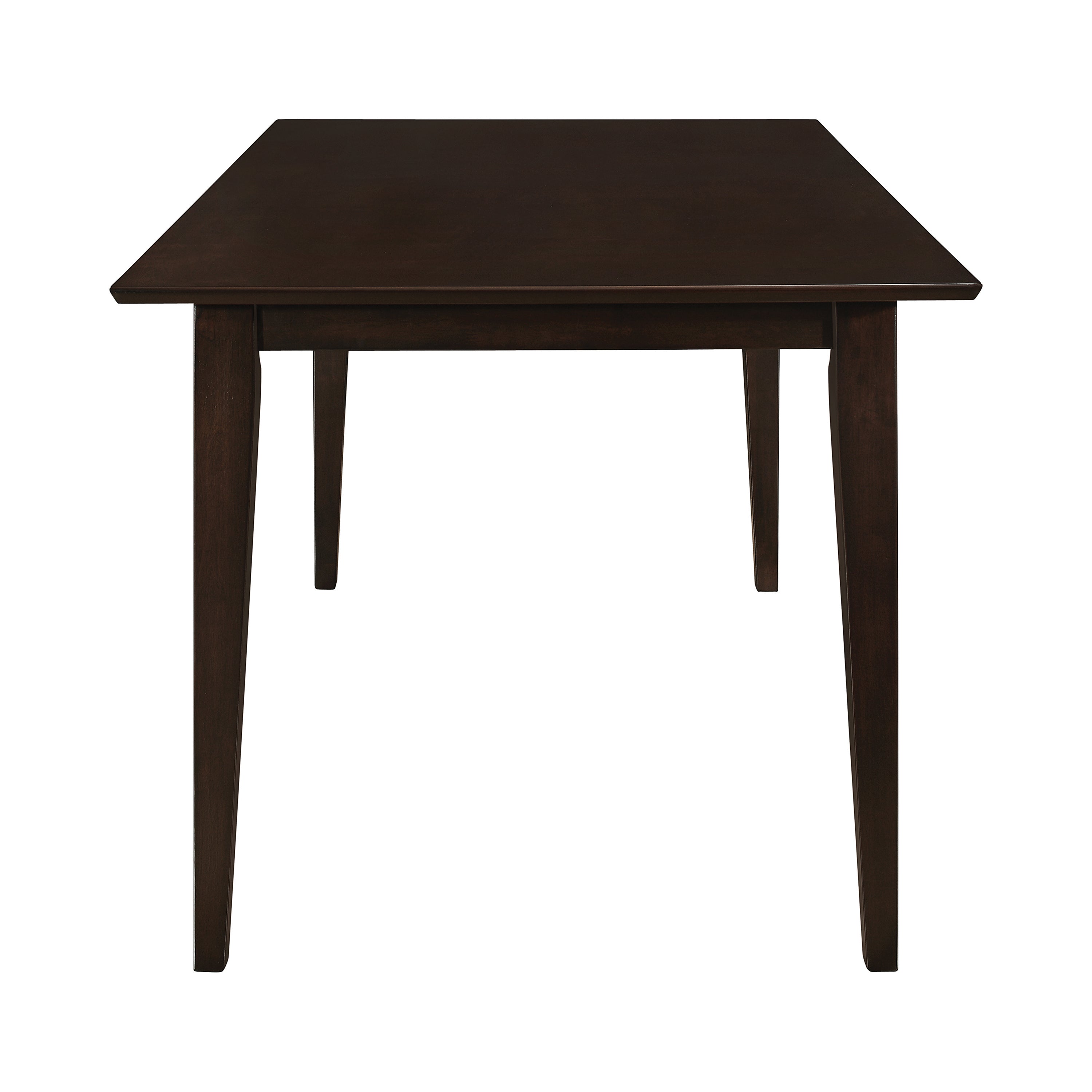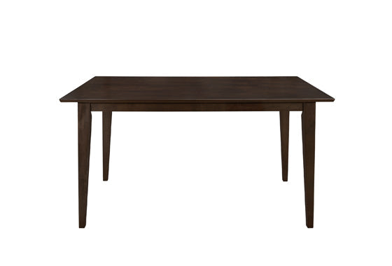 Sleek and smooth, this modern dining table is great for small spaces. Elongated, tapered legs create an open and airy feel in any space. The rich cappuccino finish deepens and streamlines in warm luxury. Complete with a table top full of clean lines, this dark table looks great when paired with other deep hues or bright and playful tones. Create a beautiful focal point with the contemporary edges of this solid hardwood and wood veneer table.