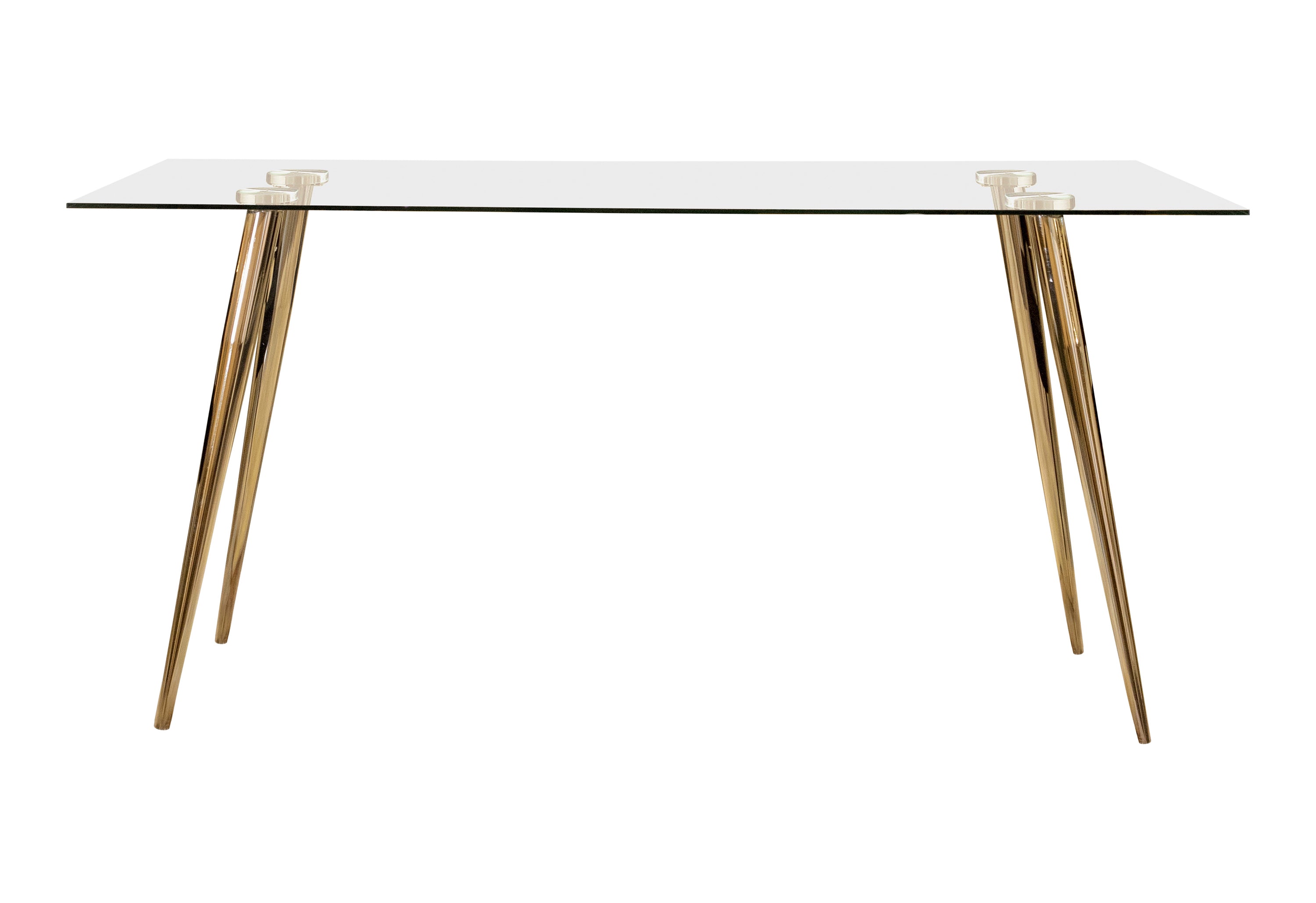 Super stylish with a mid-century modern flair, this dining table is as sleek as they come. Clean lines and an open and airy design offer a transitional twist to this dining table, making it a stunning artistic piece. A rectangular glass tabletop floats elegantly above, supported by flared and tapered legs in a lustrous metal finish add a shimmer to the space. Choose between warm or cool metal tones to tie together your existing decor and complete a space. In addition, this spacious dining table lends itself nicely to contemporary homes.