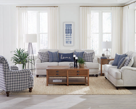Farmhouse inspiration delivers a fresh, stylish look to a transitional space with this exceptional sofa. With tailored English arms and turned legs offering a contrasting espresso finish, this sofa shines with a light grey linen-like upholstered cover. Three reversible cushions with T-cushions on each end create comfort and stay in shape, as a solid wood frame with a sinuous spring deck sets the stage for durability. Attached back cushions remain stationary to prevent shifting. Enjoy the designer look of five accent pillows with varying blue print covers.