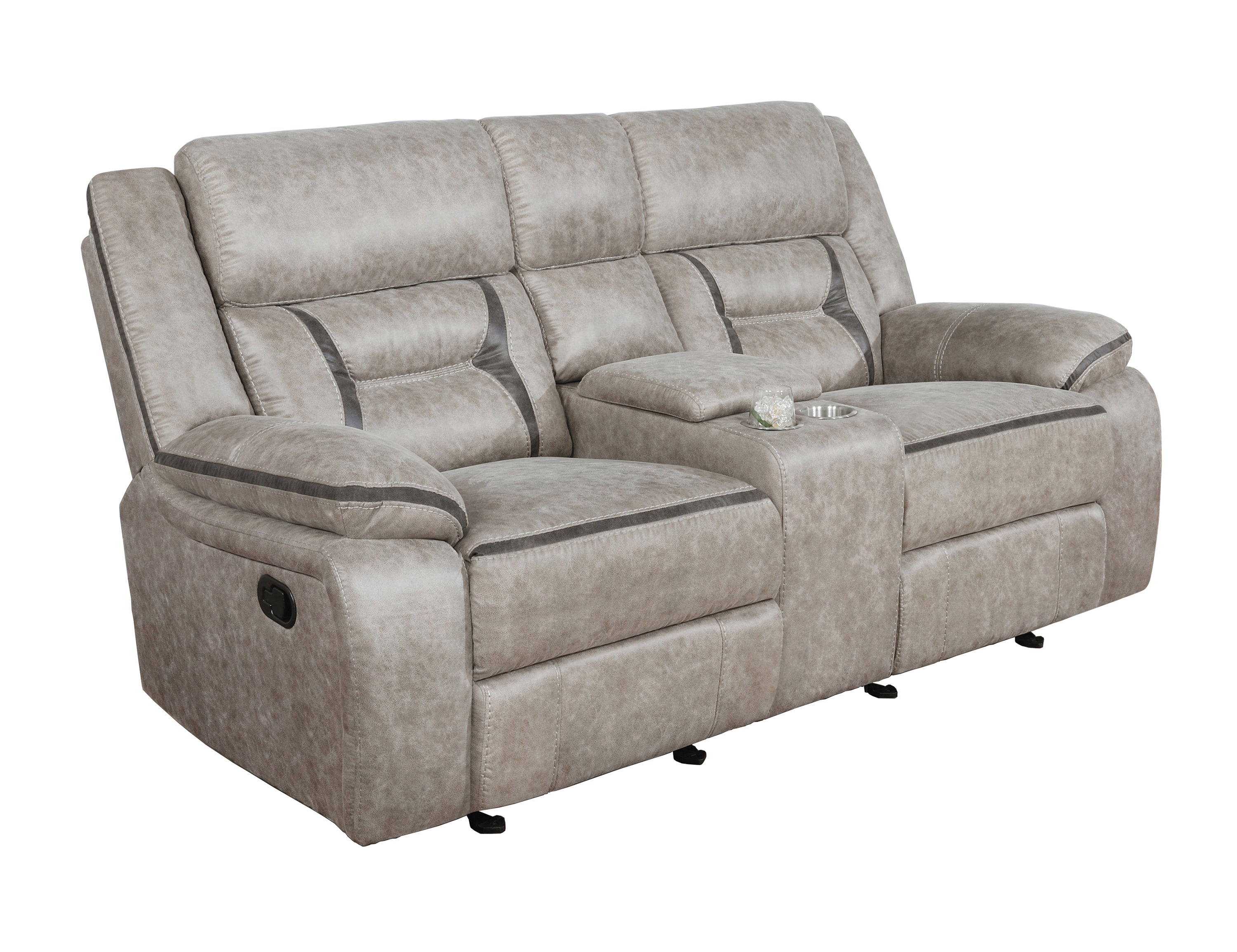 Every entertainment area deserves this glider loveseat with console. The neutral color palette makes it easy to blend with your decor. Its performance-grade upholstery ensures a comfortable seating experience. A center console offers a small storage area for removes with a lift-top container within. Find an easy place to store drinks with the built-in stainless steel cupholders.