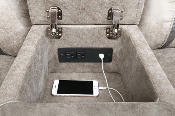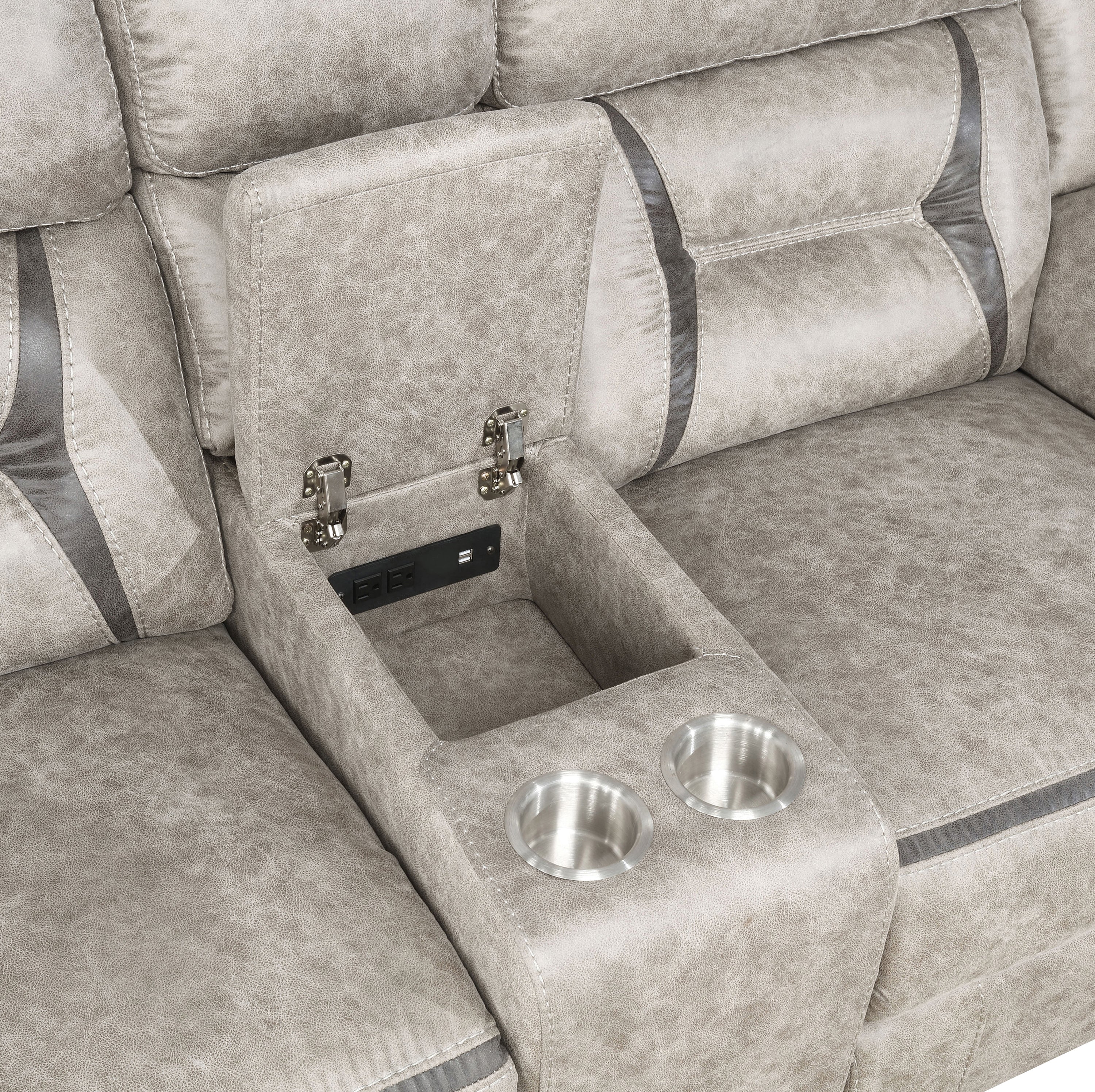 Loveseat features smooth gliding mechanism, console with lift top storage, power outlet (2AC/2USB), and two stainless steel cup holders