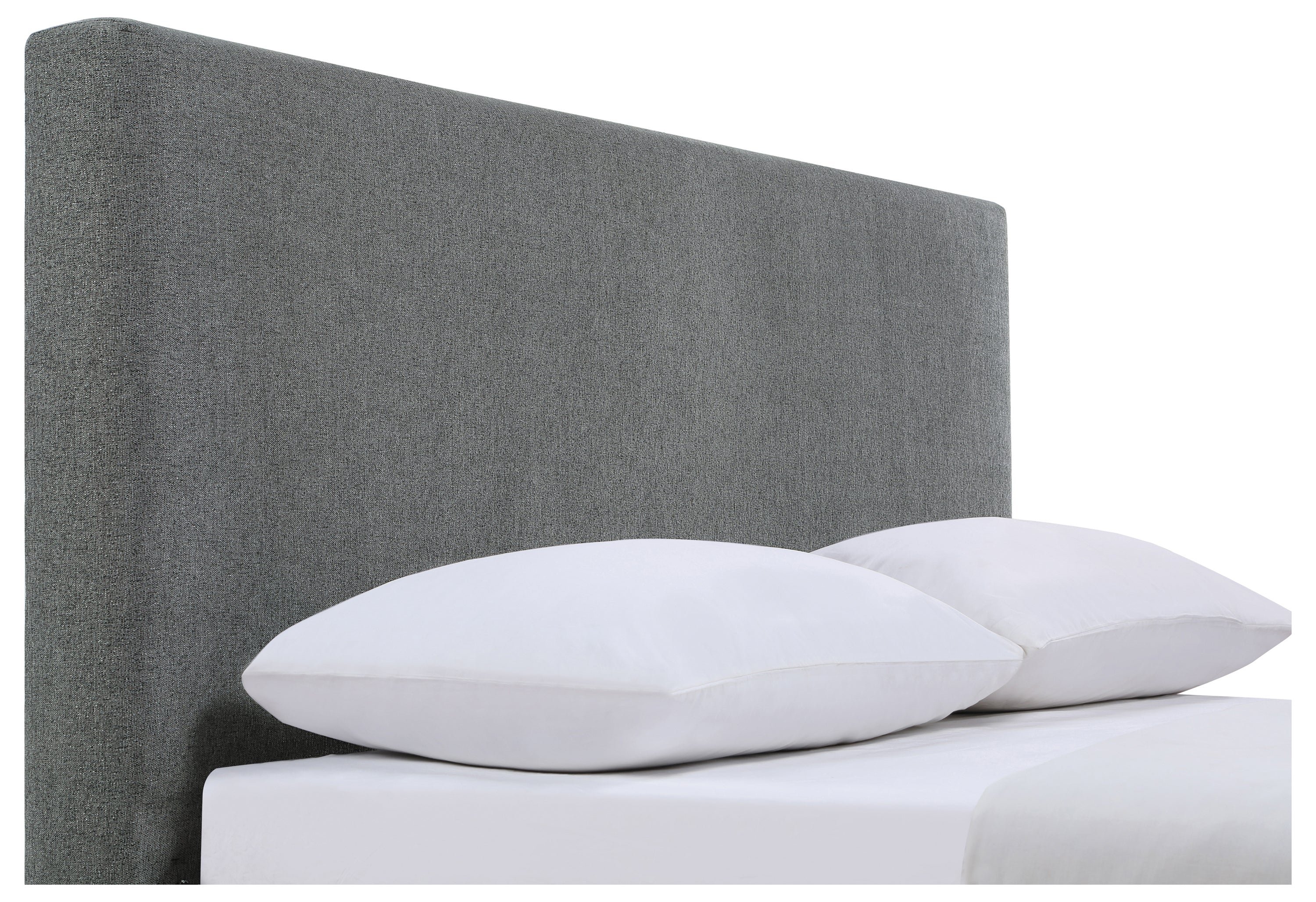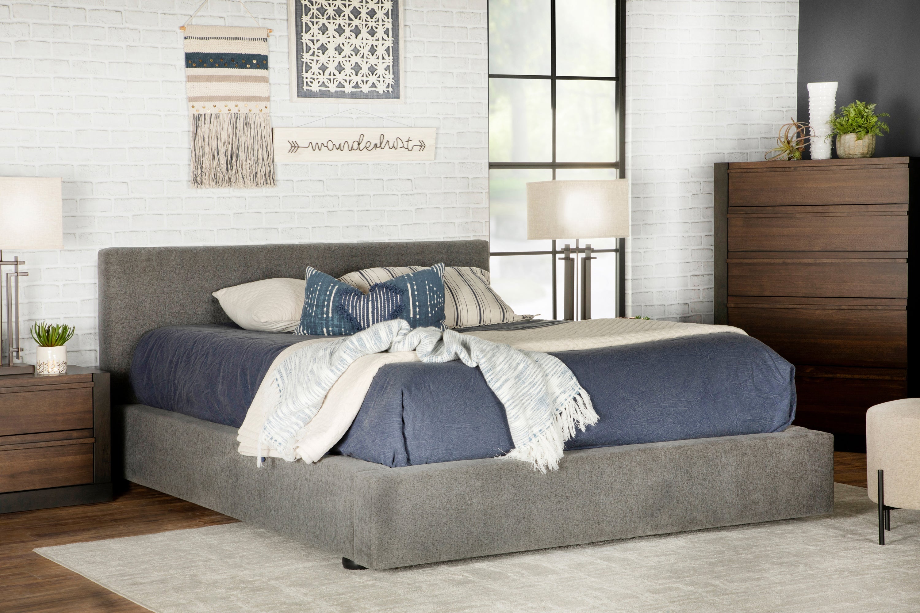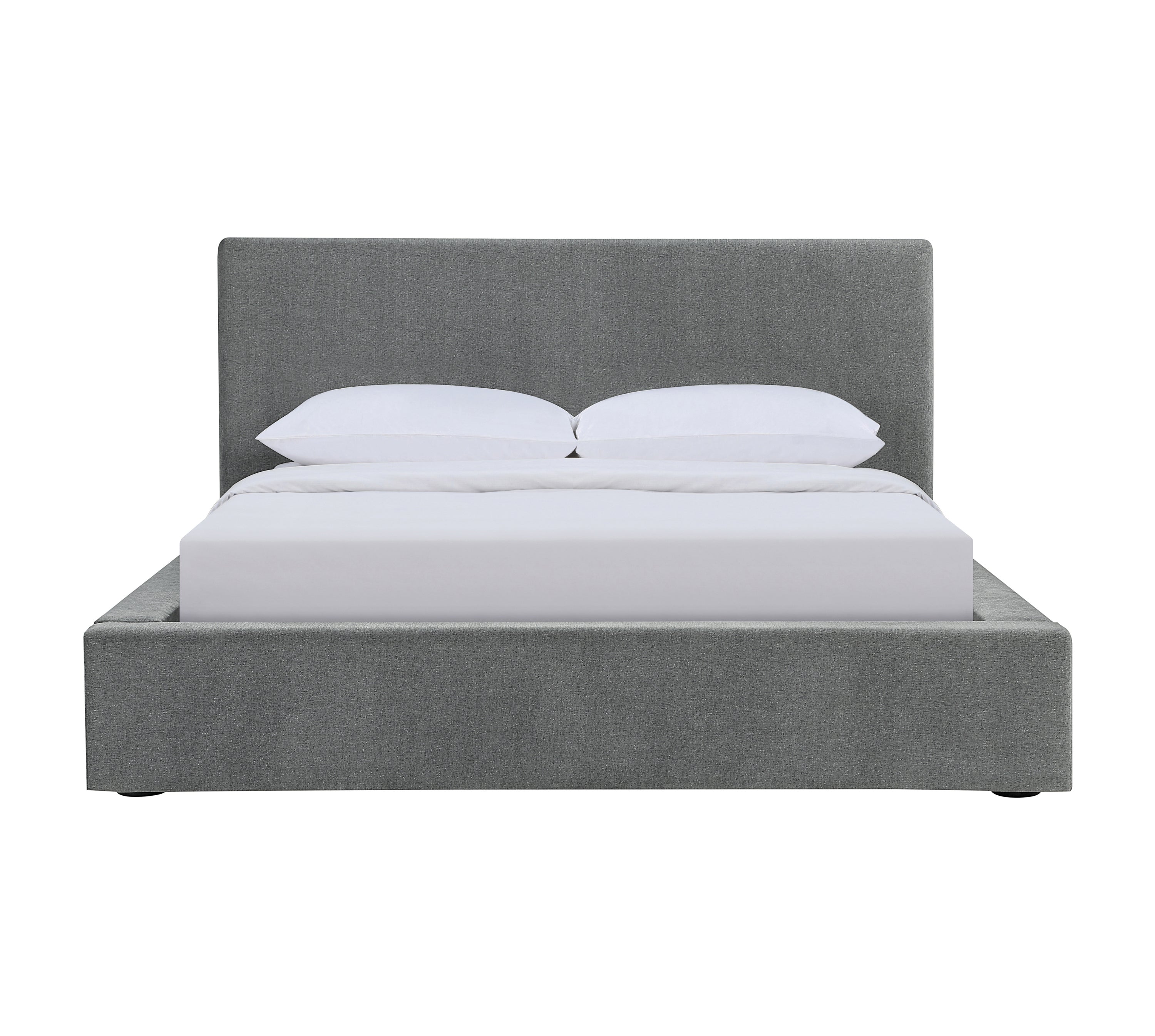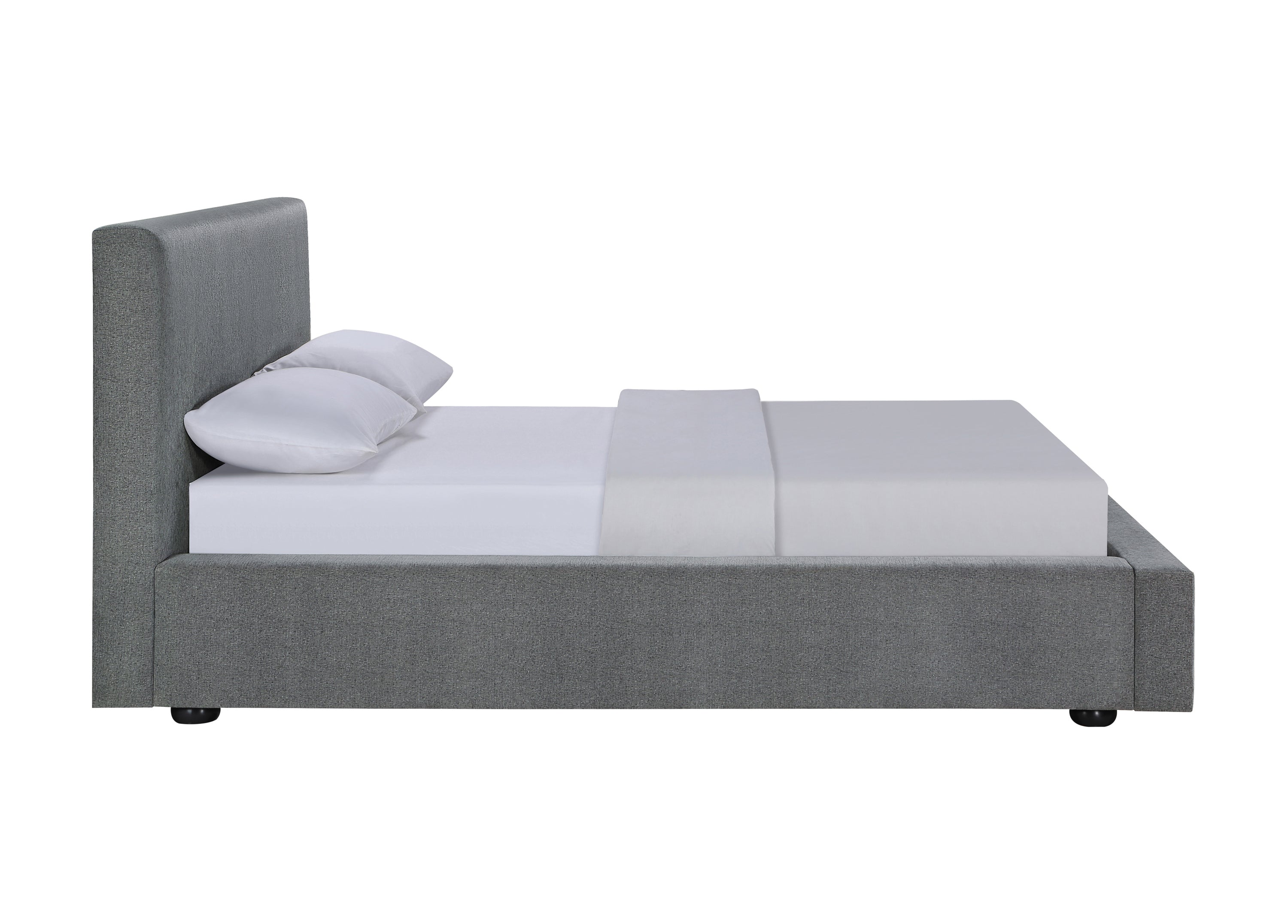 Basic design principles reflect elegant simplicity in this stylish platform bed, an ideal choice for a sophisticated and uncomplicated bedroom space. Modern in motif, its clean lines and textured gray fabric upholstery deliver both versatility and class. This bed offers a seamless padded headboard, and padded side rails and footboard, adding up to an ideal mattress enclosure without the need for a box spring. Pine wood and plywood construction offer a steady build to this tasteful bed. Includes subtle black finish feet.