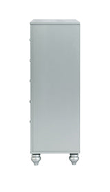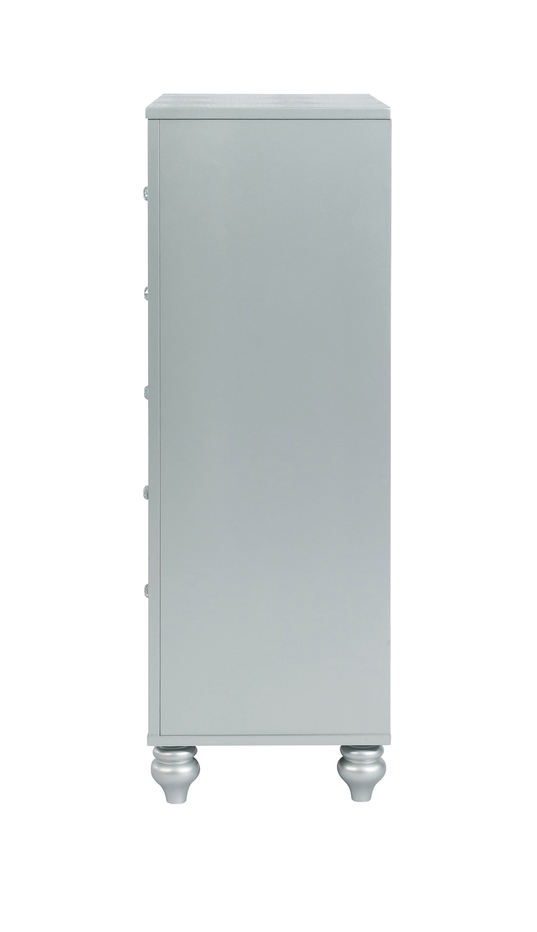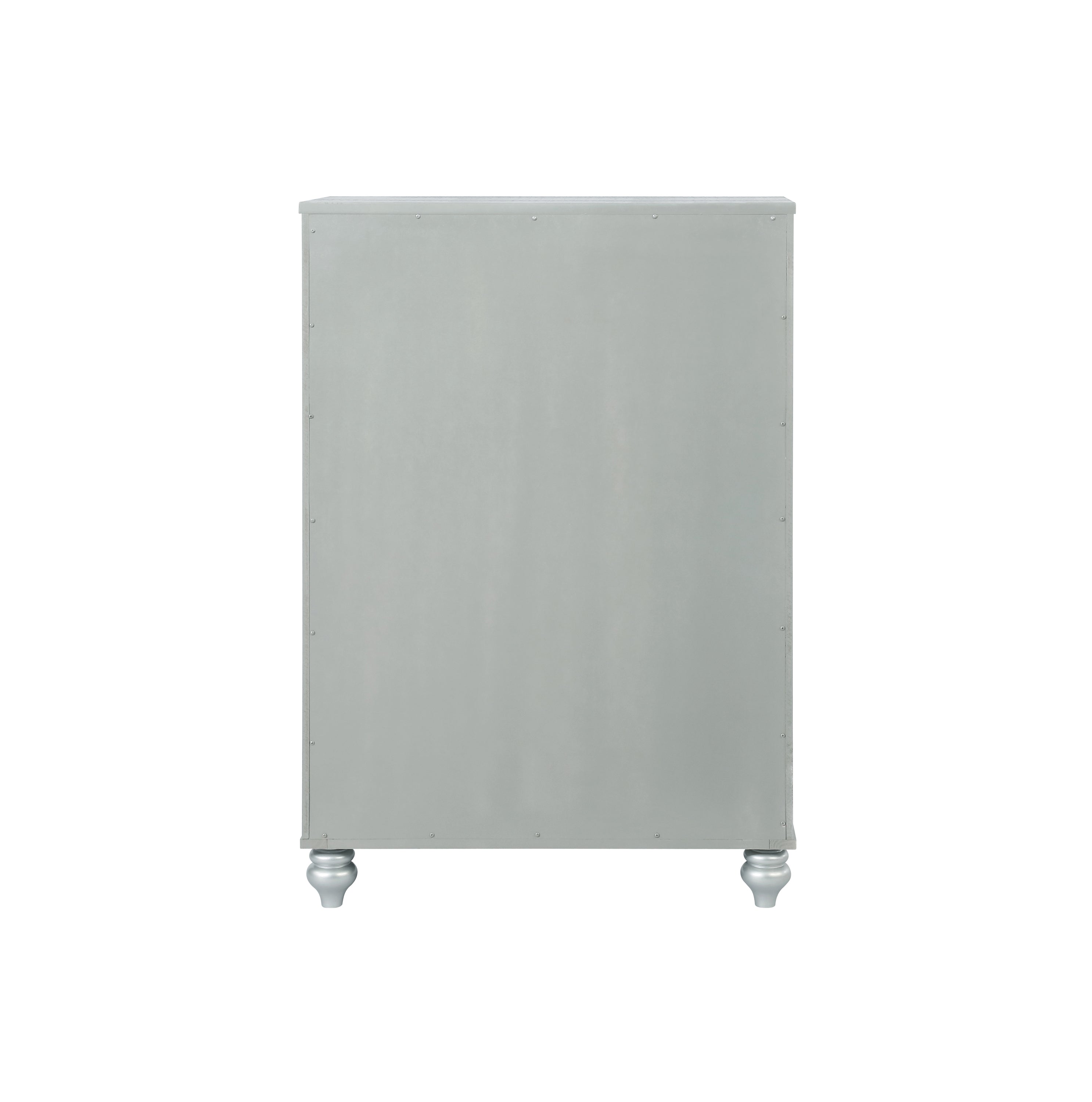 Enhance your home with a modern glam update to a classic design with this transitional five-drawer chest. It boasts a dazzling design that takes lends glitz to any modern bedroom. It comes in a vibrant silver metallic finish with fret work detail on the front panels and drawer fronts. The drawers are adorned with crystal-like pulls and the top ones are lined with black felt to protect treasured valuables. Delicate bun feet complete the design of this exquisite masterpiece.