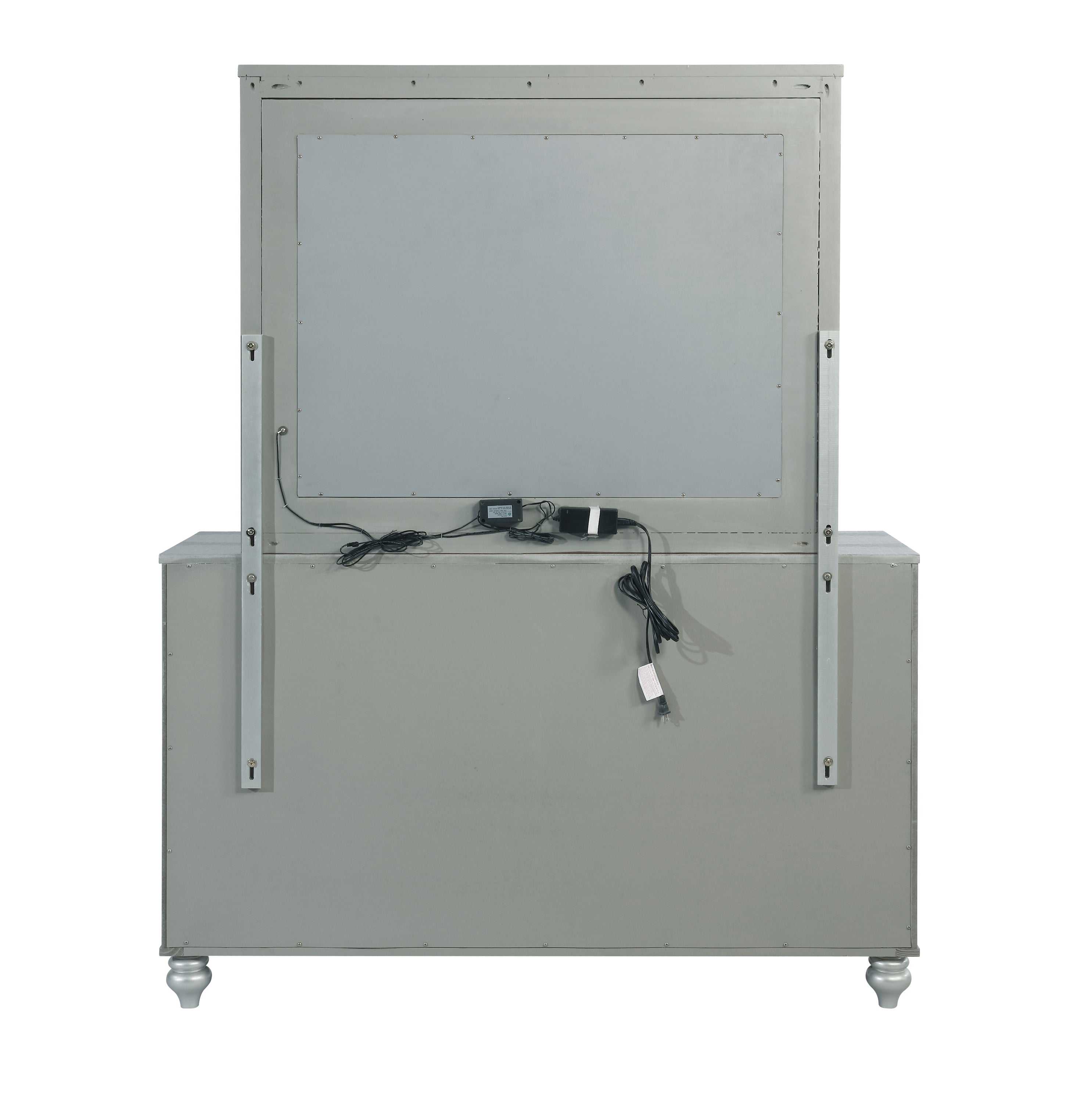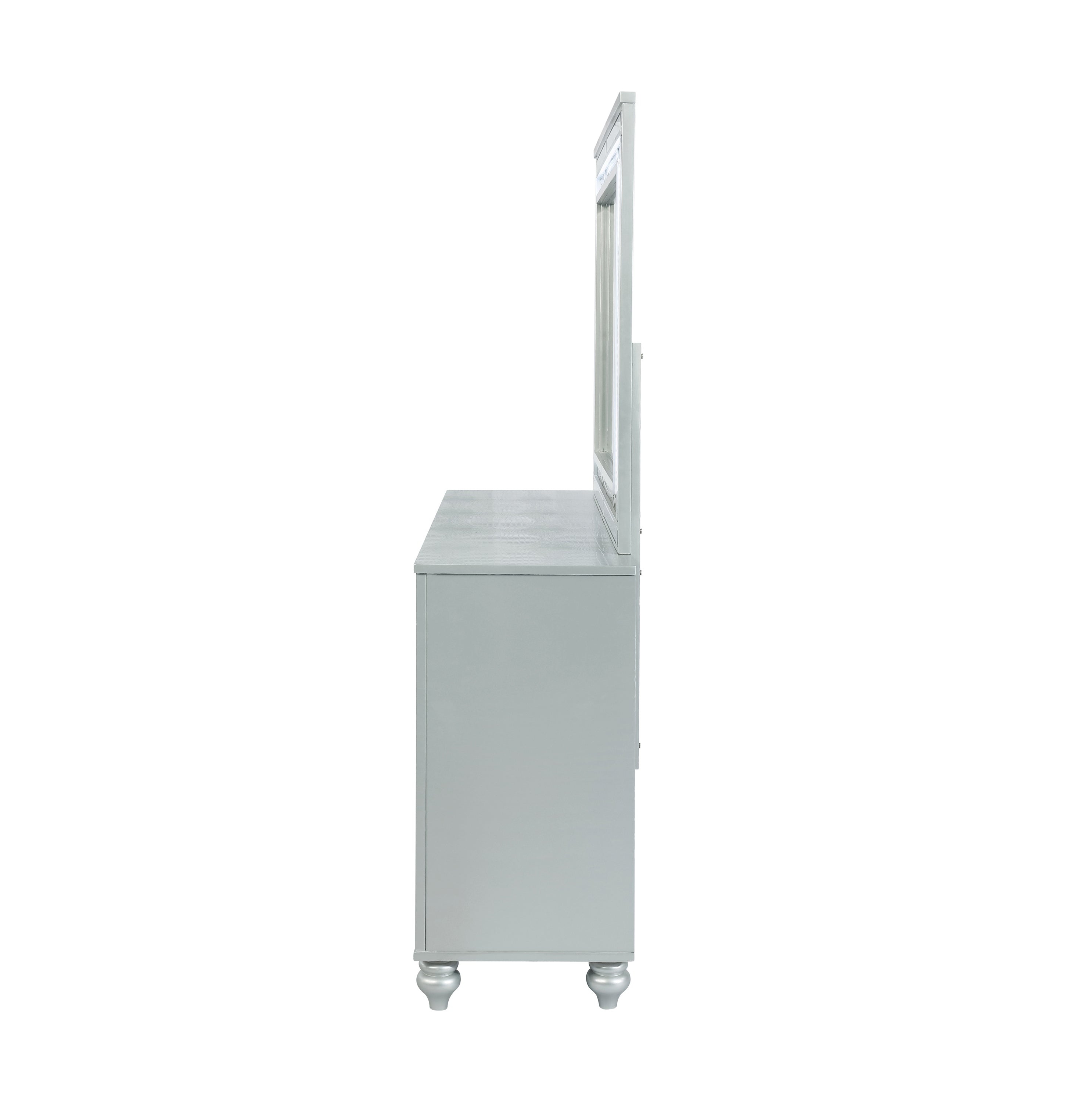 Give your home a modern glam update to classic design with this transitional six-drawer dresser. It features a glitzy design that takes center stage in any modern bedroom. It's fashioned with a vibrant silver metallic finish with fret work detail on the front panels and drawer fronts. The drawers are adorned with crystal-like pulls and the top ones are lined with black felt. Delicate bun feet complete the design of this exquisite showpiece dresser.