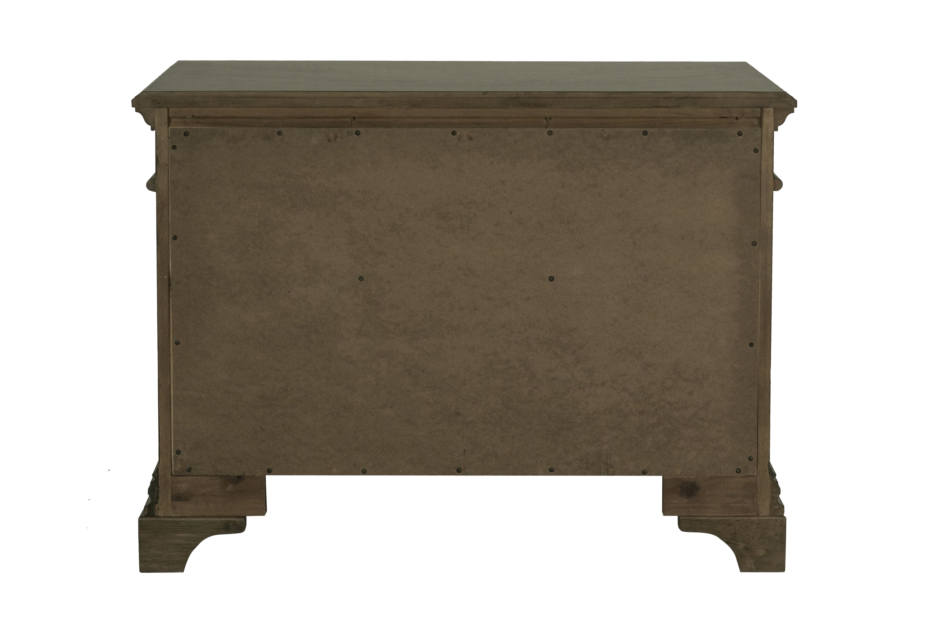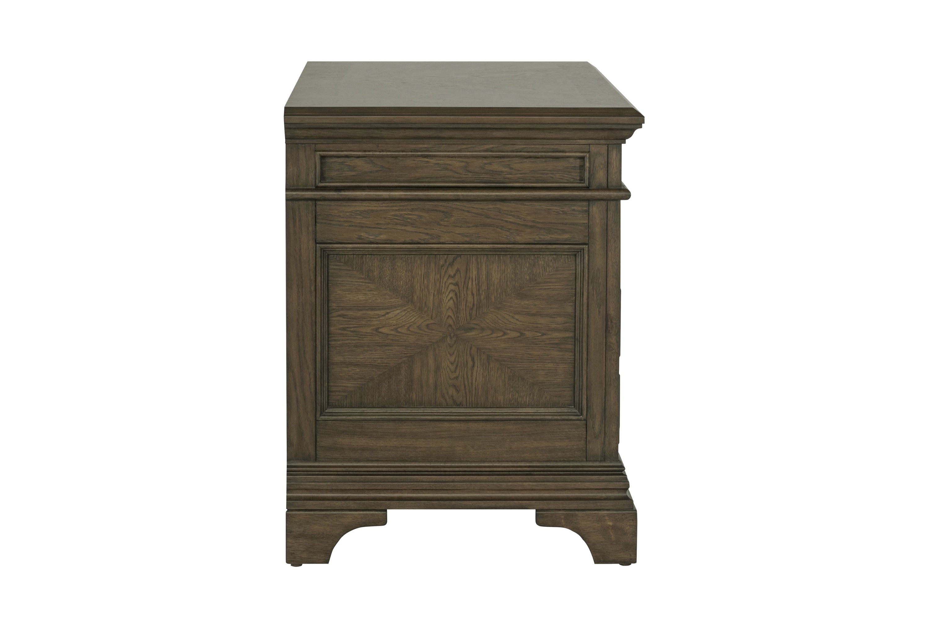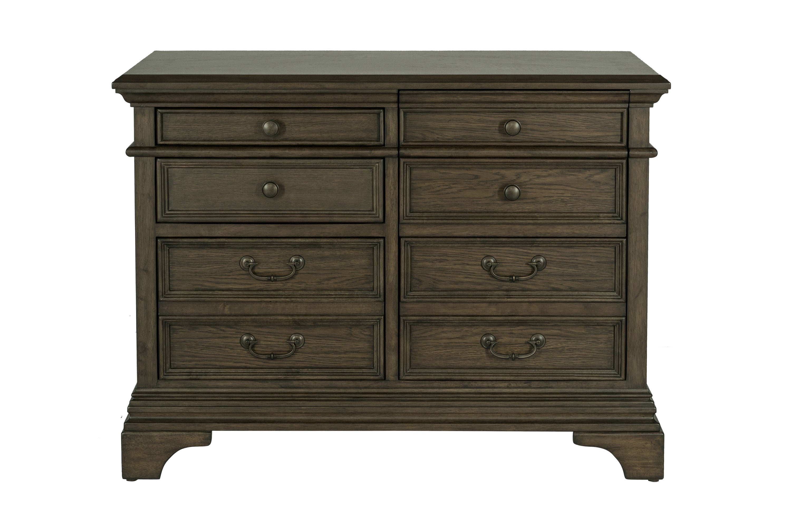 A stately upgrade for the traditional filing cabinet. This piece is crafted for classy office spaces. An expansive tabletop with molding accents offers an elegant option to place office items. Eight drawers flaunt round knobs and traditional style bar pulls. This piece is finished in burnished oak and supported on bracket style feet.