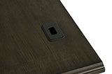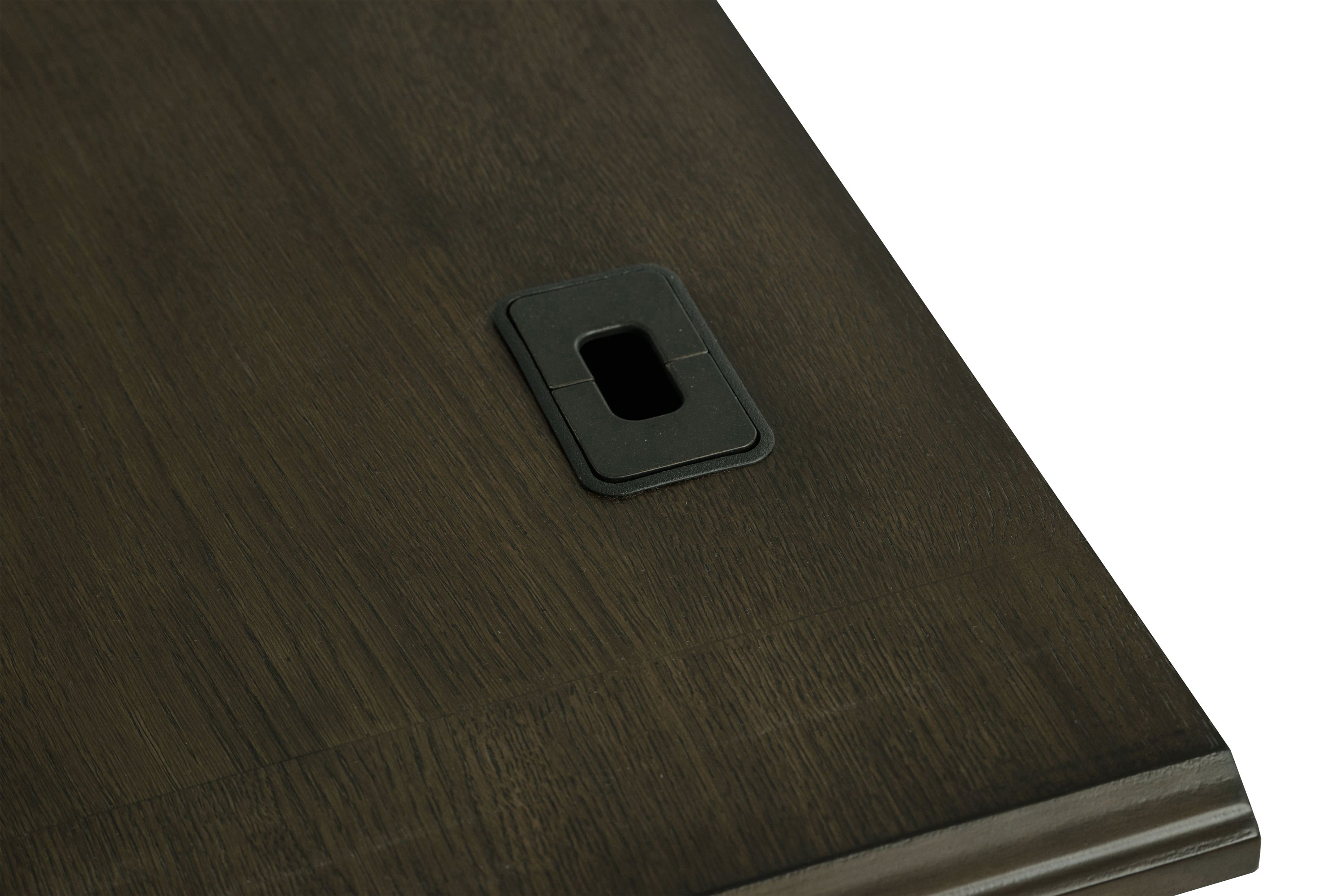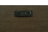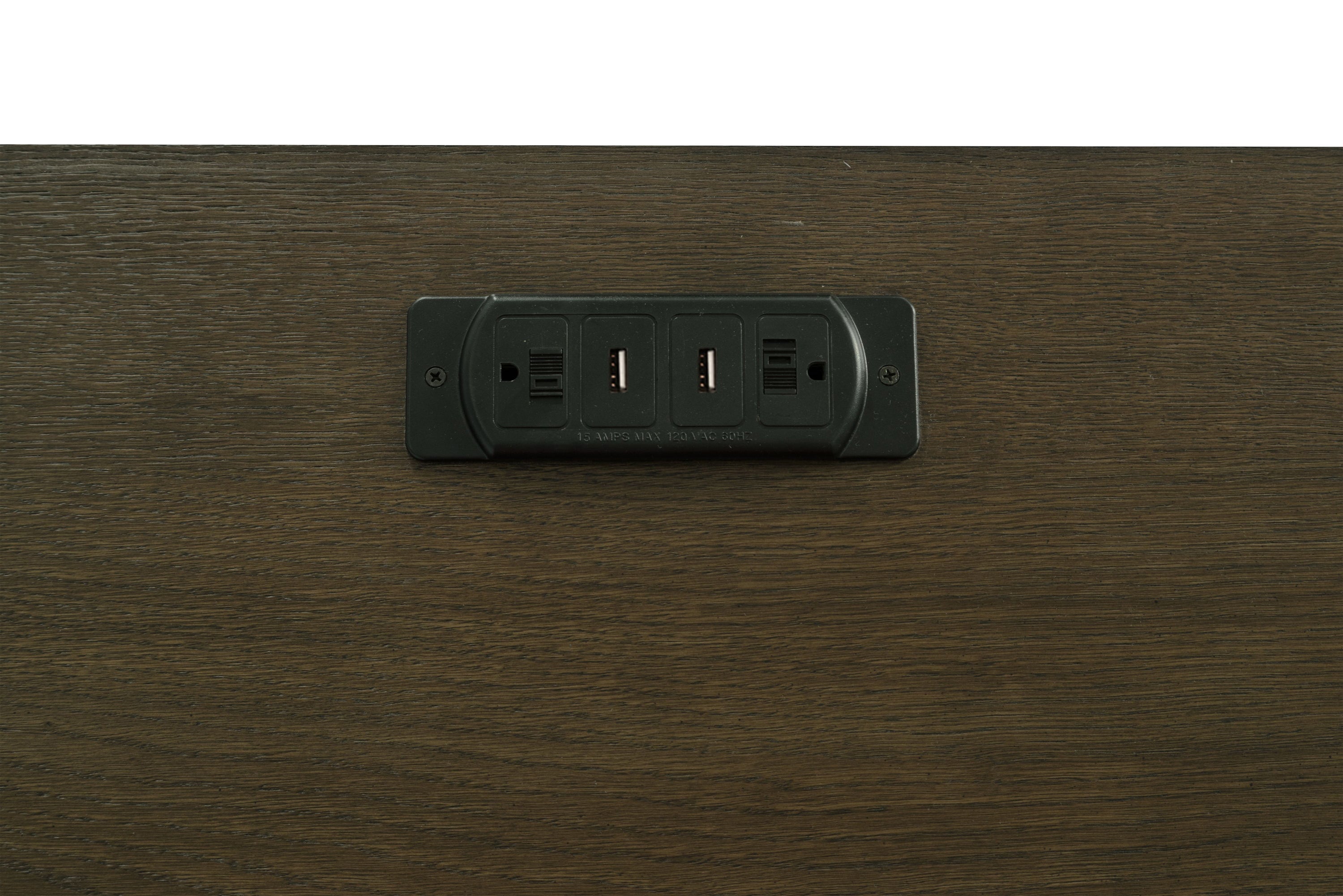Credenza includes a power outlet (2AC/2USB), center keyboard drawer, two top drawers and middle drawer with removable dividers, one lockable file cabinet, and a cabinet with an adjustable shelf