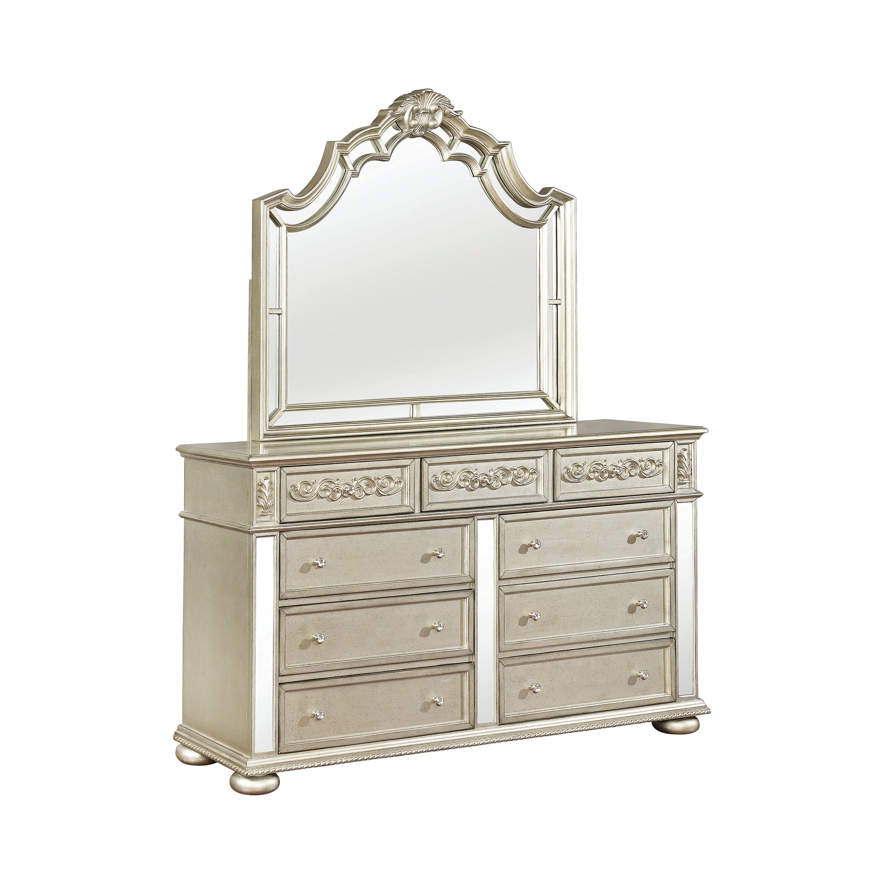 Add luxurious style to your bedroom with this glam dresser from the Heidi collection. This nine drawer dresser displays a metallic platinum finish for a luxurious touch. The mirrored panels provide added visual punch in this luxe dresser. Three slim top drawers are anchored by six additional larger drawers for ample organizing space. Traditional wood carved details on the top drawer fronts provide additional visual interest for an overall glamorous look.