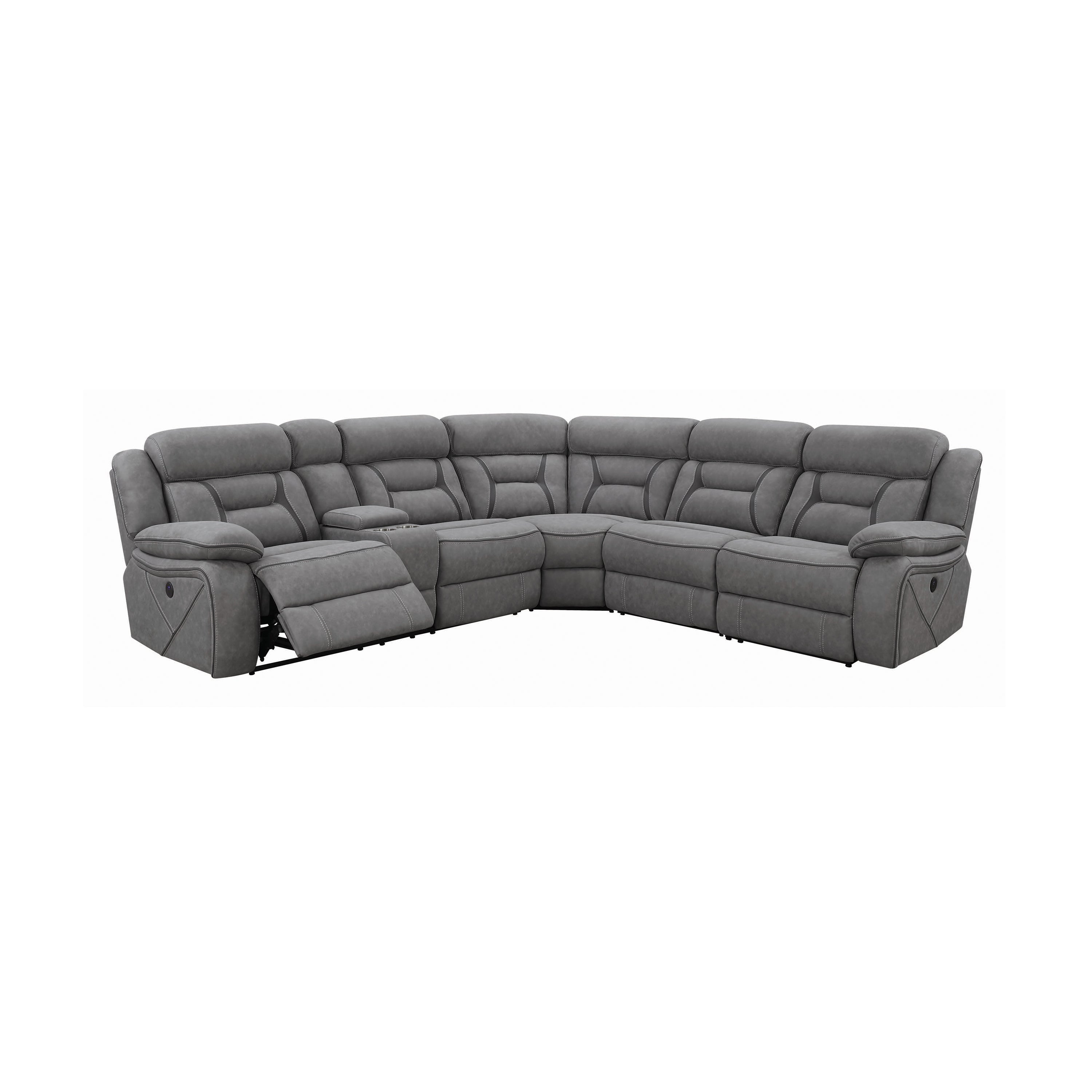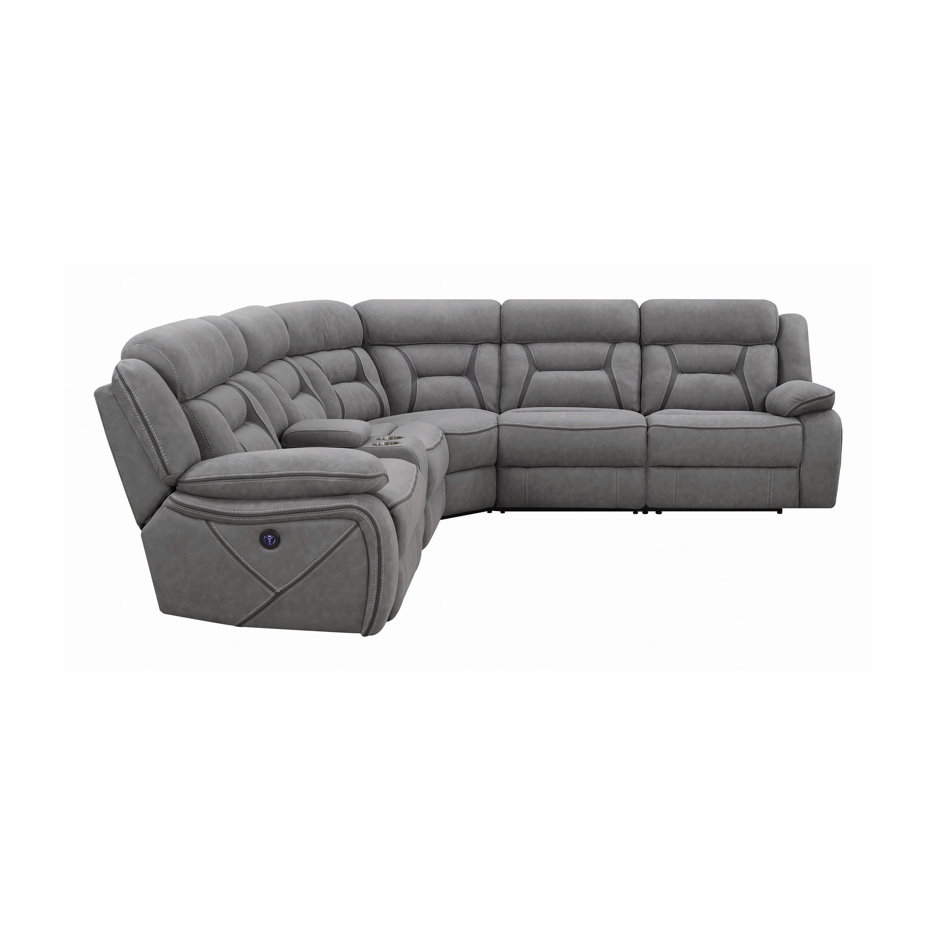 Four-piece power motion sectional upholstered in grey performance faux suede