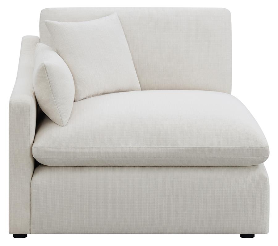 You'll sink gratefully into the cushioned comfort of this left arm chair as part of a sectional for the den or living room. Upholstered in linen-like, the chair is fashioned with a plush seat and back for long-lasting comfort. It's also crafted with sloped track arms accented with handsome topstitching. The treated fabric easily repels water and moisture so you can wipe up spills before they soak in. It's the perfect end piece to your modular sectional centerpiece.