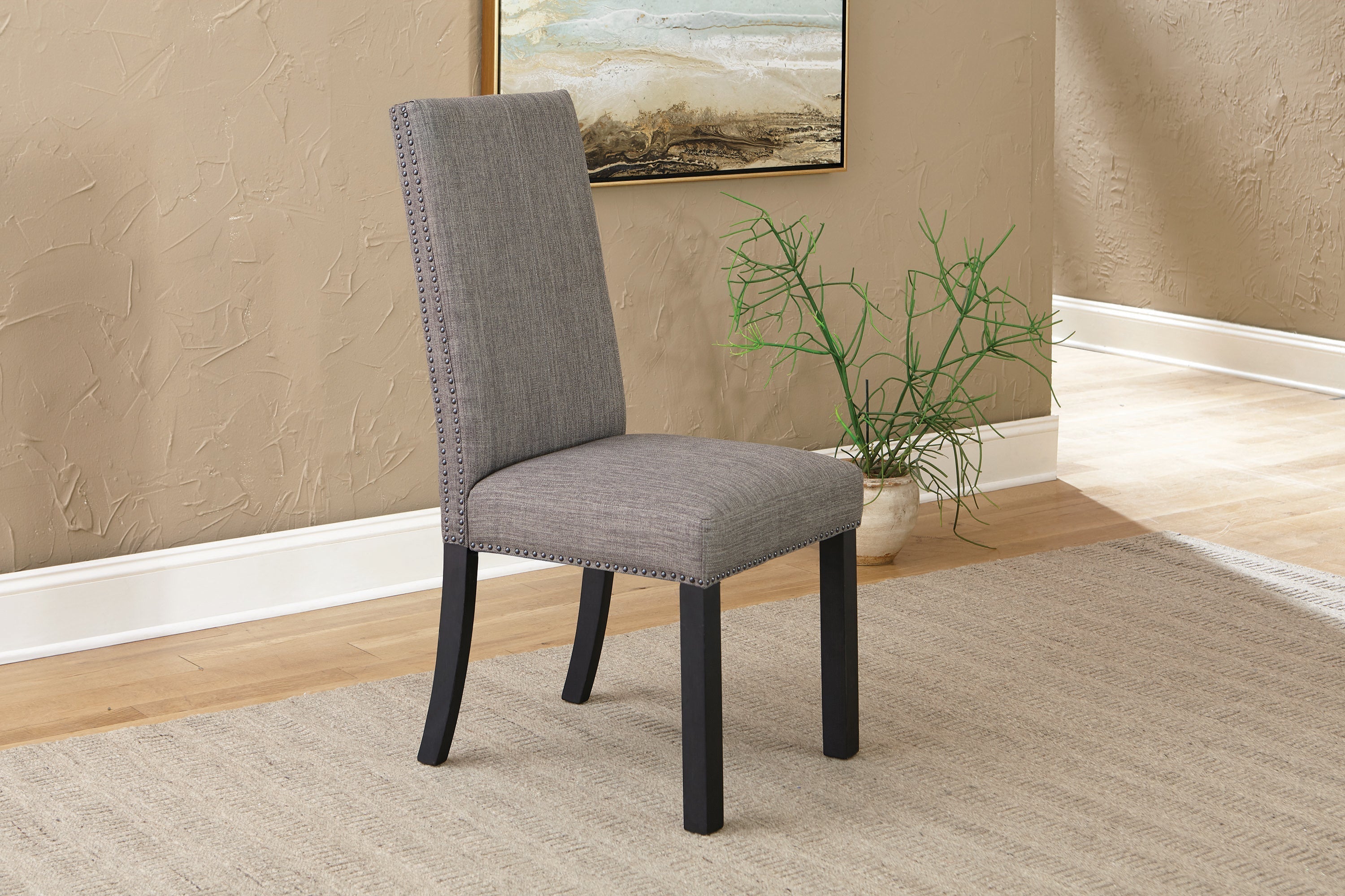 Stylish parson dining chair features organic materials and details. Chair is crafted from Asian hardwood in a modern industrial design. The webbed seating offers comfort while the hand applied nail head trim and double stitched seams convey stylishness. Matte black legs and cool charcoal grey fabric upholstery create a warm two-tone look. This dining chair is a charming stylish addition to a transitional dining space.