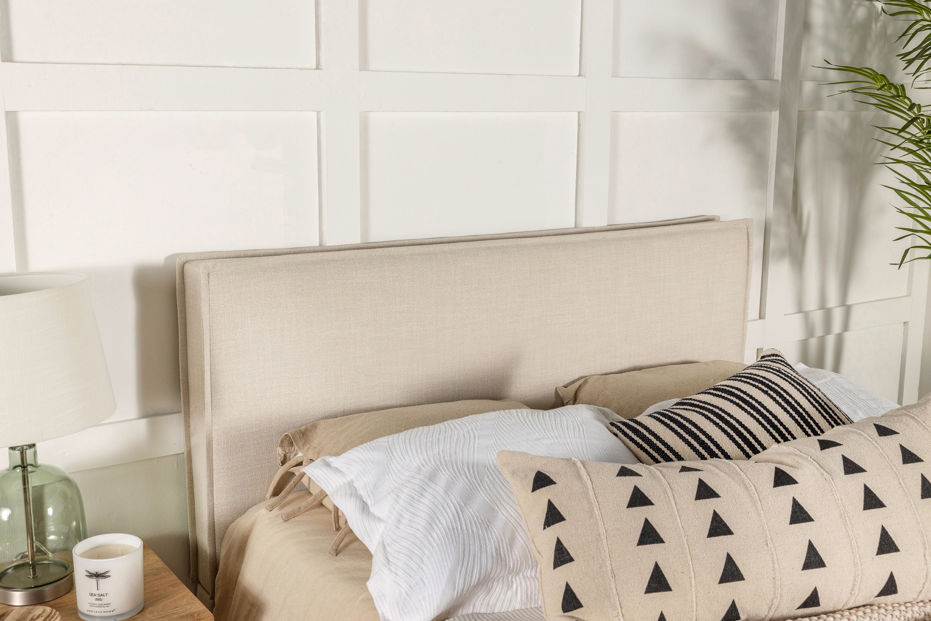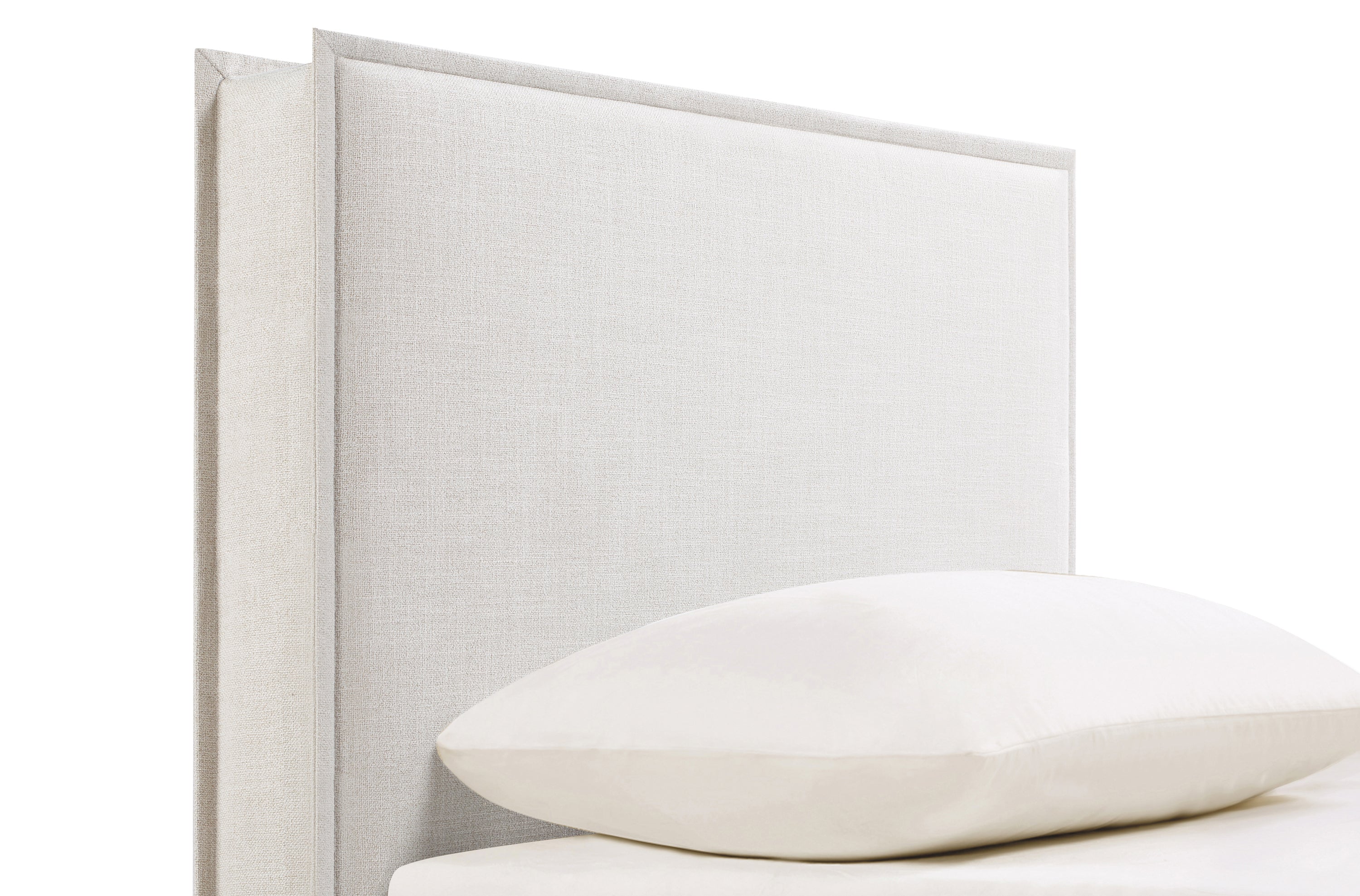 Inspire modern artistry in a contemporary bedroom space with a headboard that shines as a focal point. This updated headboard creates a mix of clean lines and tempting upgrades to transform a bedroom into a haven for relaxation. Versatile and timeless, flange details dress up the outer border, adding a dimensional effect. Textured sand finish fabric wraps over the headboard to deliver a light essence and a palette that accommodates a variety of options for matching case pieces, beds, and accessories. Constructed of pine wood.
