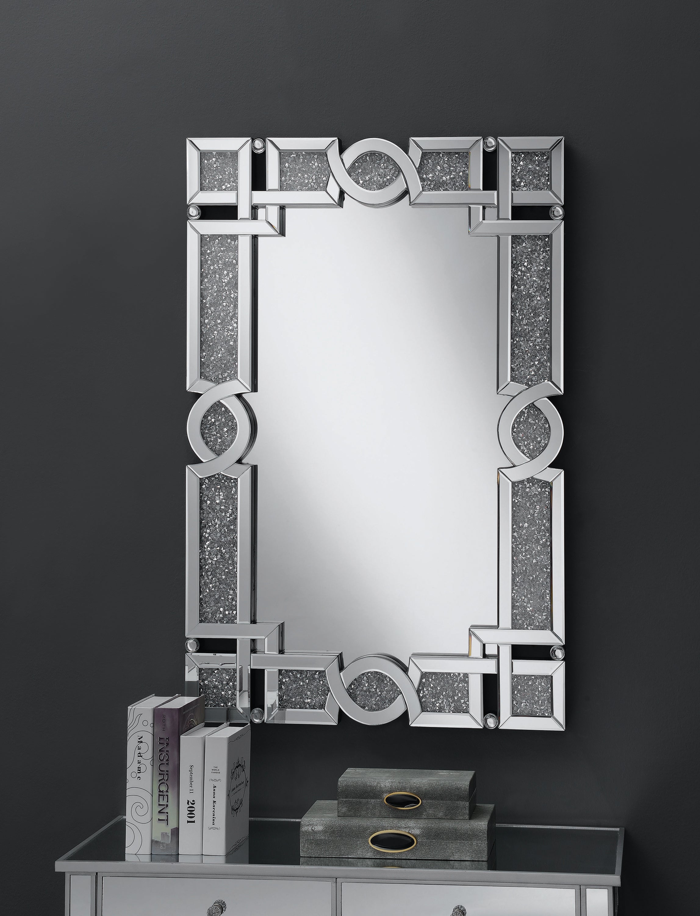 Add an eye-catching focal point to any living room with the intricate silhouette and details of this silver wall mirror. Constructed of geometric shapes, the interesting frame features glimmering dark crystal beads. The edges of the shapes combine to construct a clean, fragmented line. The open space adds intrigue while feeling streamlined. Dress up a sideboard or add interest to a hallway with the bright and reflective elements.