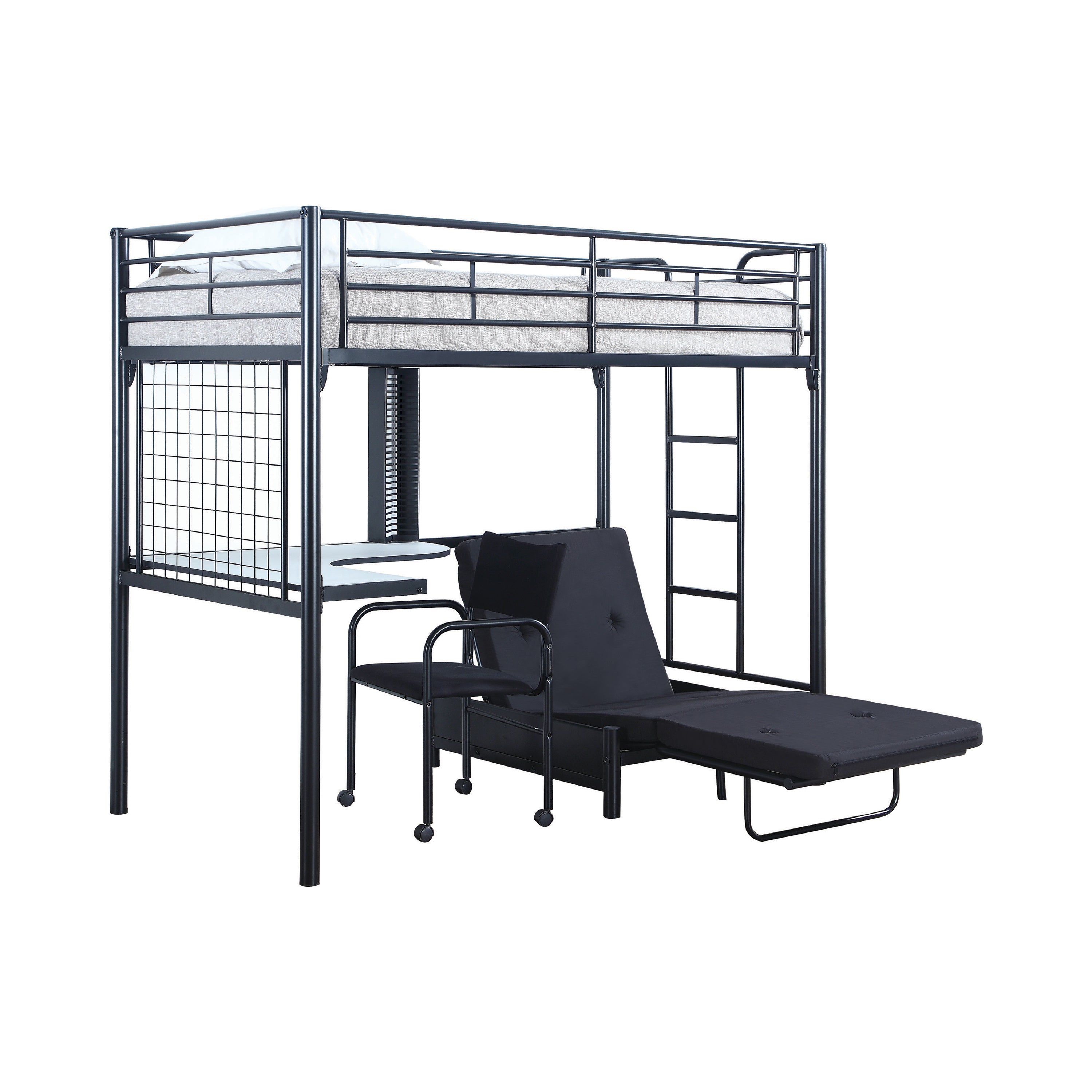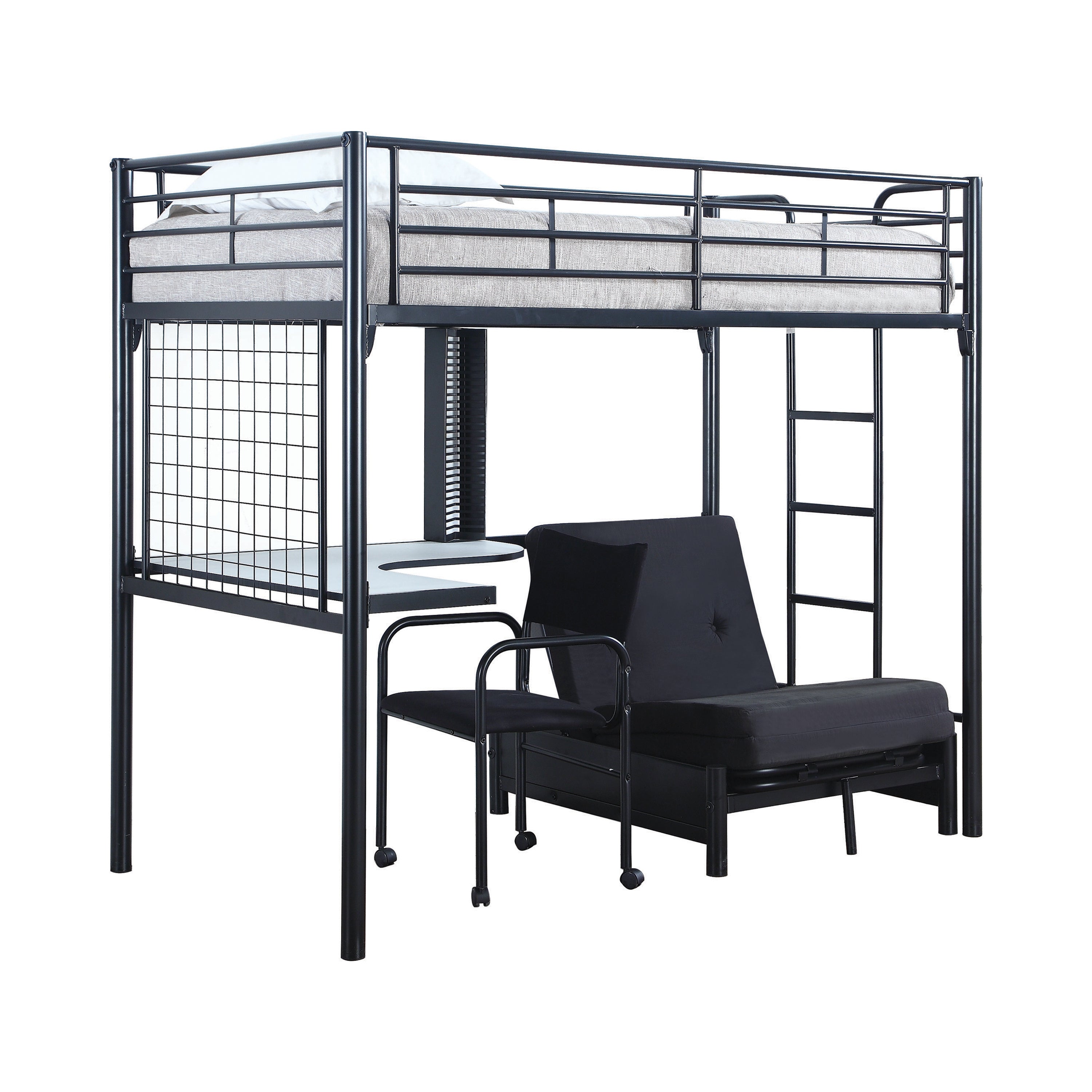 Style and function combine to give this metal twin bunk bed and workstation a striking appearance. Awesome for space-saving needs, this twin workstation loft bed checks all the boxes. Modern with its glossy black finish and stylish with a white desk top create a cool space to work and relax. Its chair and multi-functional futon frame are included. The pad and mattress are sold separately.
