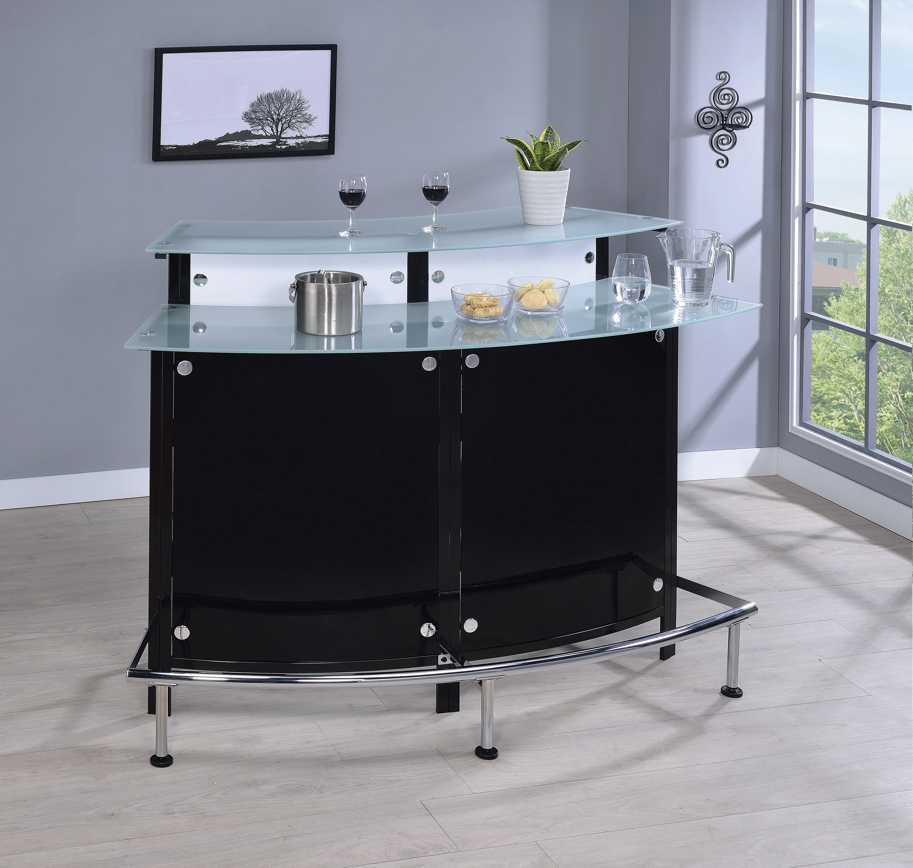 Bring your next cocktail party to life with a stunning statement of glamour. This marvelously modern chrome bar unit lets you show off your mixology skills in style. Place contemporary bar stools of your choice in front of its metal foot rest to give your guests a comfy front row seat as you lavish them with tasty libations. Two separate glass tops provide plenty of space to mix and serve. With striking panels of black and white acrylic and a pleasingly curved silhouette, this charming bar unit looks fabulous in an elegant parlor or lounge.